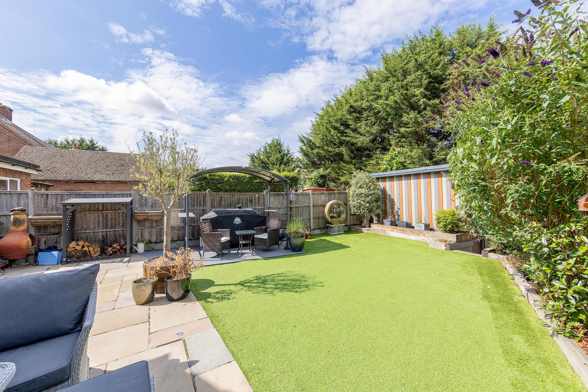 The rear garden is fully landscaped and designed for low maintenance, with artificial grass, sandstone patios, a remote-controlled water feature, and a covered hot tub area. A dedicated BBQ zone with resin decking completes the space. At the far end of the garden, you’ll discover the remarkable sunken golf simulator and cinema room—a bespoke, soundproofed building with high-spec tech, surround sound, gaming PC, air conditioning, and a luxury interior. To the front, a block-paved driveway and gravelled area offer ample parking, while the entrance is secured by electric gates and monitored by an 8-camera 4K CCTV system.