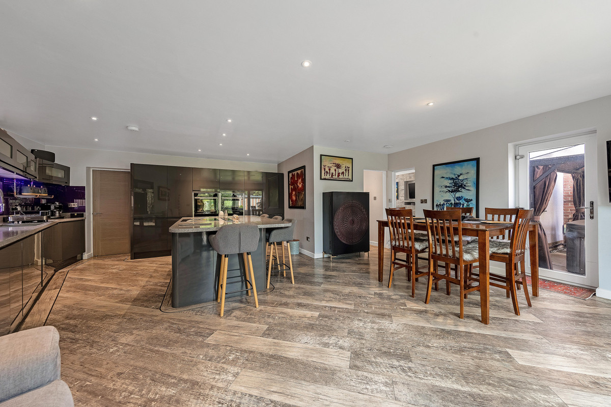Step inside to a bright entrance hall with designer flooring and clever under-stairs storage. The spacious lounge features a bespoke media wall with a recessed electric fire, stone-effect panelling, and exposed log storage, providing a stylish yet cosy atmosphere. A large, open-plan kitchen/dining room forms the heart of the home, fitted with sleek composite worktops, Neff appliances, a central island, and bifold doors that seamlessly open onto the rear garden. Adjacent to the kitchen is a practical utility room with butler sink and water softener, giving access to the double garage. The entire ground floor benefits from high-end Karndean flooring, underfloor heating, and zoned smart controls.