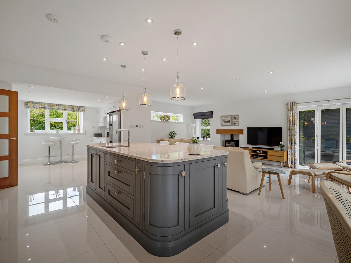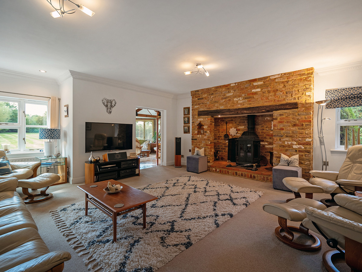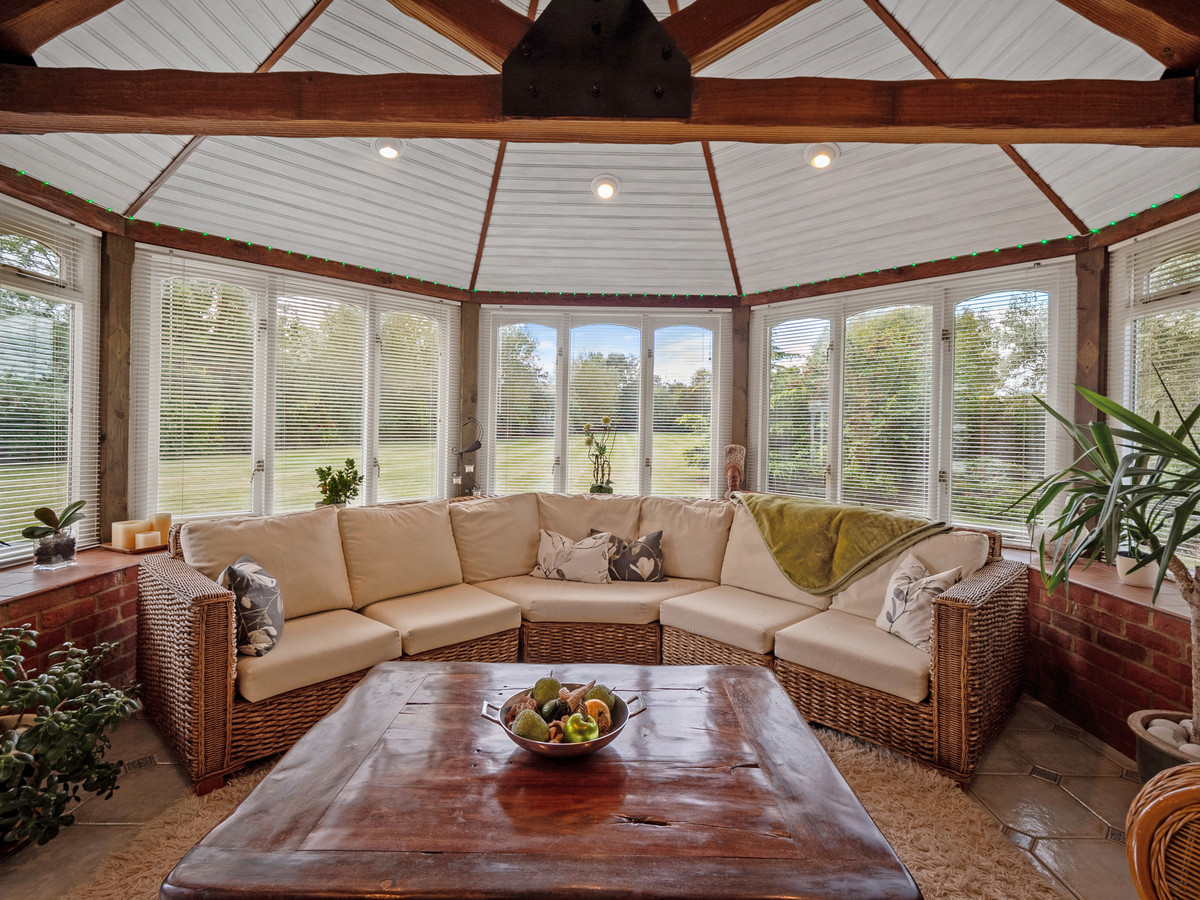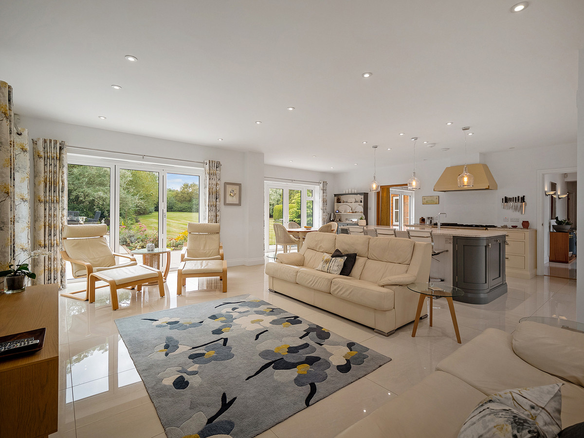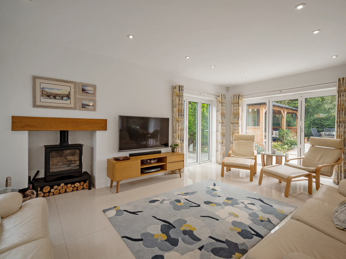 The heart of Scotsdale is its open-plan kitchen, lounge, and dining area, featuring stunning triple-aspect views. The kitchen, crafted by Waterford Kitchens Ltd., Ampthill, includes premium features such as a Falcon, a gas cooker and extractor hood, Quooker taps, and Quartz work surfaces. The porcelain tiles and wet underfloor heating add a touch of elegance and comfort. The area also includes a Samsung fridge freezer, a built-in pantry, and three patio doors leading to the garden. The dining room, equipped with patio doors and wet underfloor heating, offers a seamless transition to the decking area for alfresco dining. The lounge, with its log burner, creates a cozy atmosphere. The orangery/sunroom, with tiled flooring, a ceiling fan, and garden views, is an inviting space that also houses a built-in Jetmaster BBQ/bar area complete with a wine fridge, providing an excellent spot for indoor entertaining.