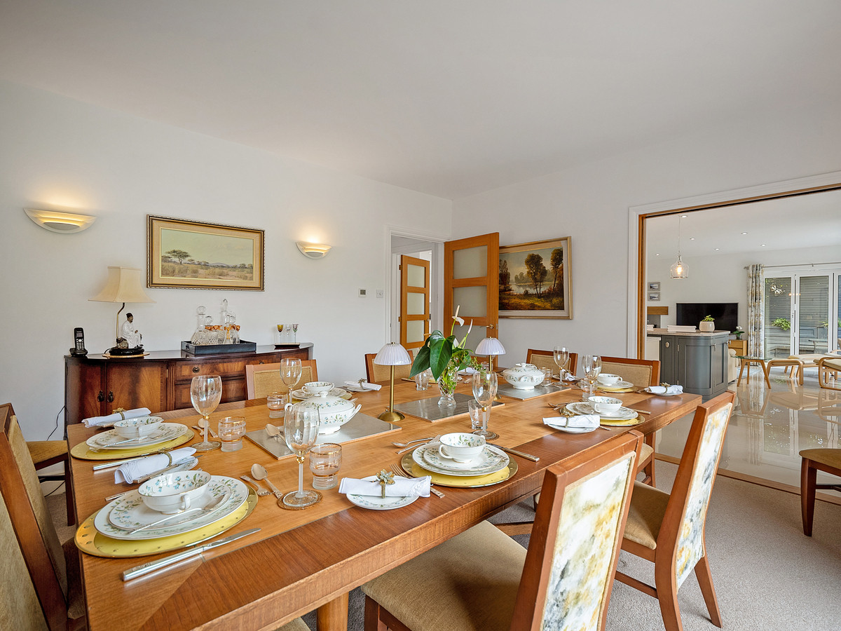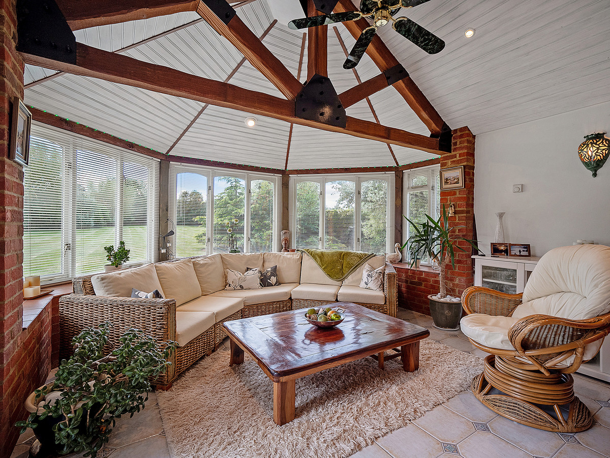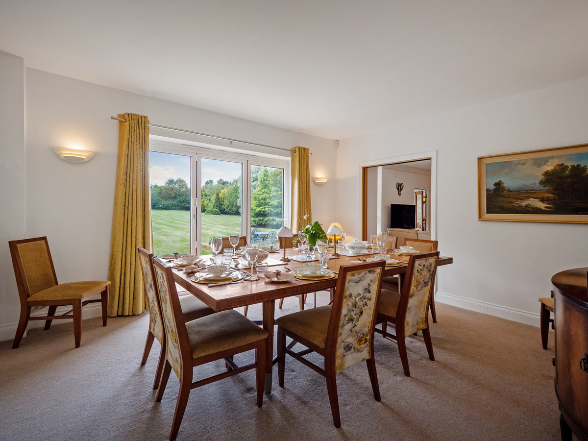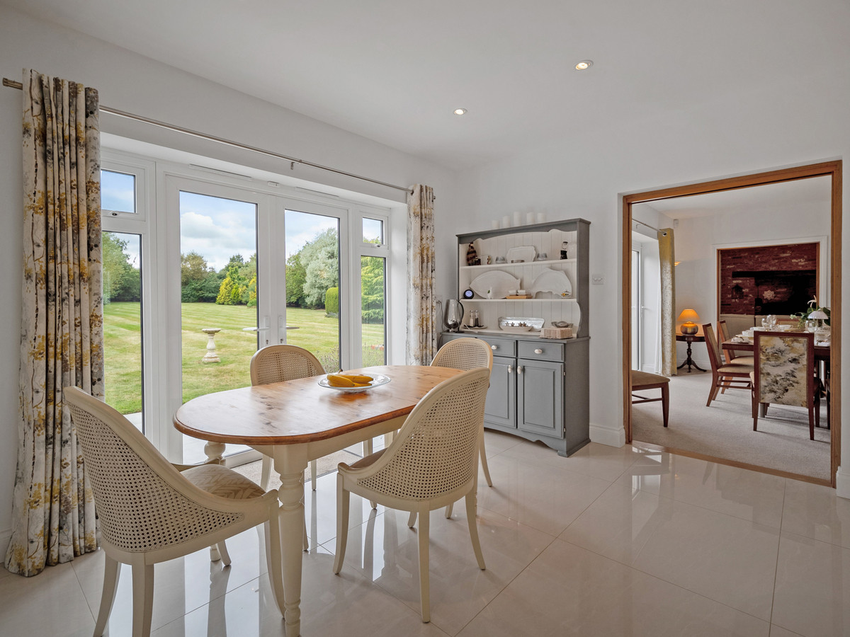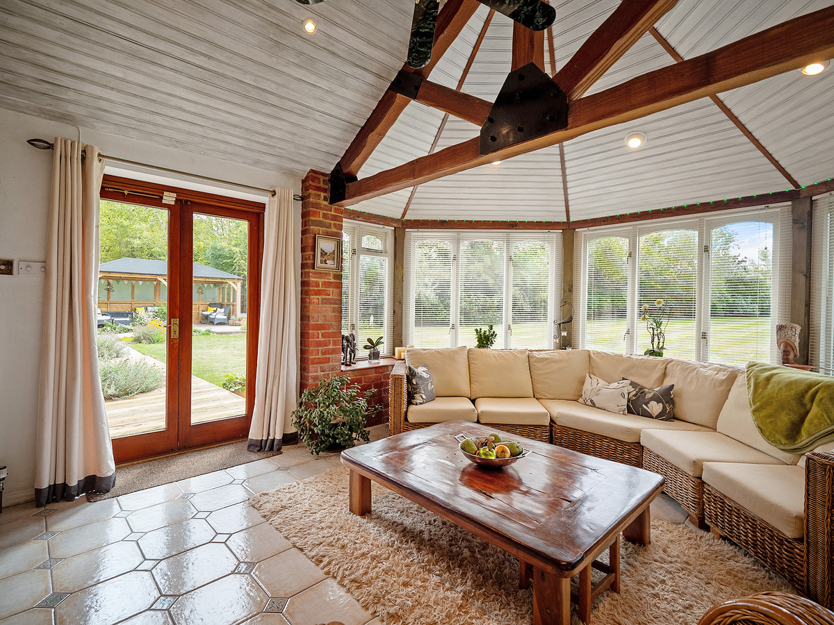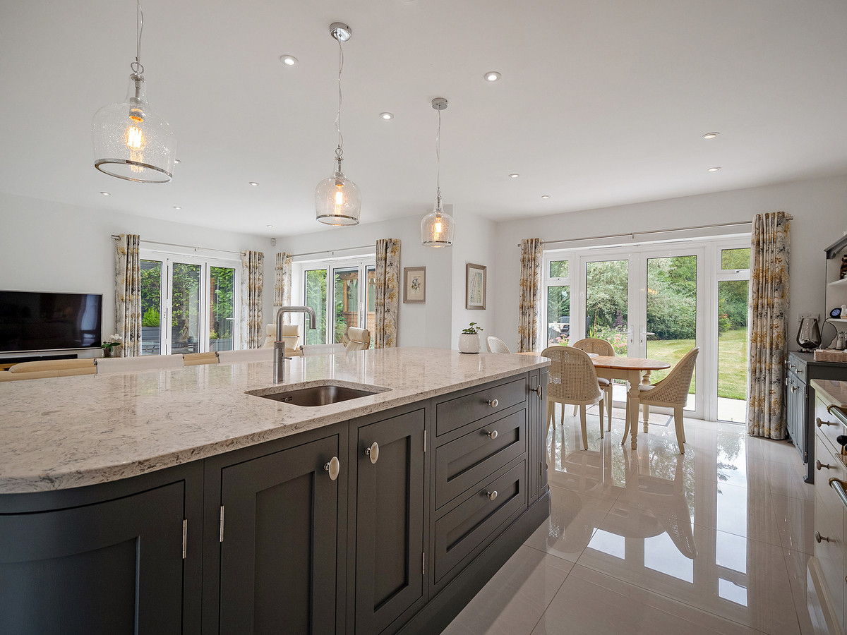 The heart of Scotsdale is its open-plan kitchen, lounge, and dining area, featuring stunning triple-aspect views. The kitchen, crafted by Waterford Kitchens Ltd., Ampthill, includes premium features such as a Falcon, a gas cooker and extractor hood, Quooker taps, and Quartz work surfaces. The porcelain tiles and wet underfloor heating add a touch of elegance and comfort. The area also includes a Samsung fridge freezer, a built-in pantry, and three patio doors leading to the garden. The dining room, equipped with patio doors and wet underfloor heating, offers a seamless transition to the decking area for alfresco dining. The lounge, with its log burner, creates a cozy atmosphere. The orangery/sunroom, with tiled flooring, a ceiling fan, and garden views, is an inviting space that also houses a built-in Jetmaster BBQ/bar area complete with a wine fridge, providing an excellent spot for indoor entertaining.