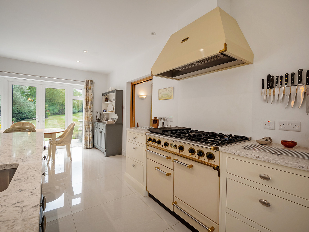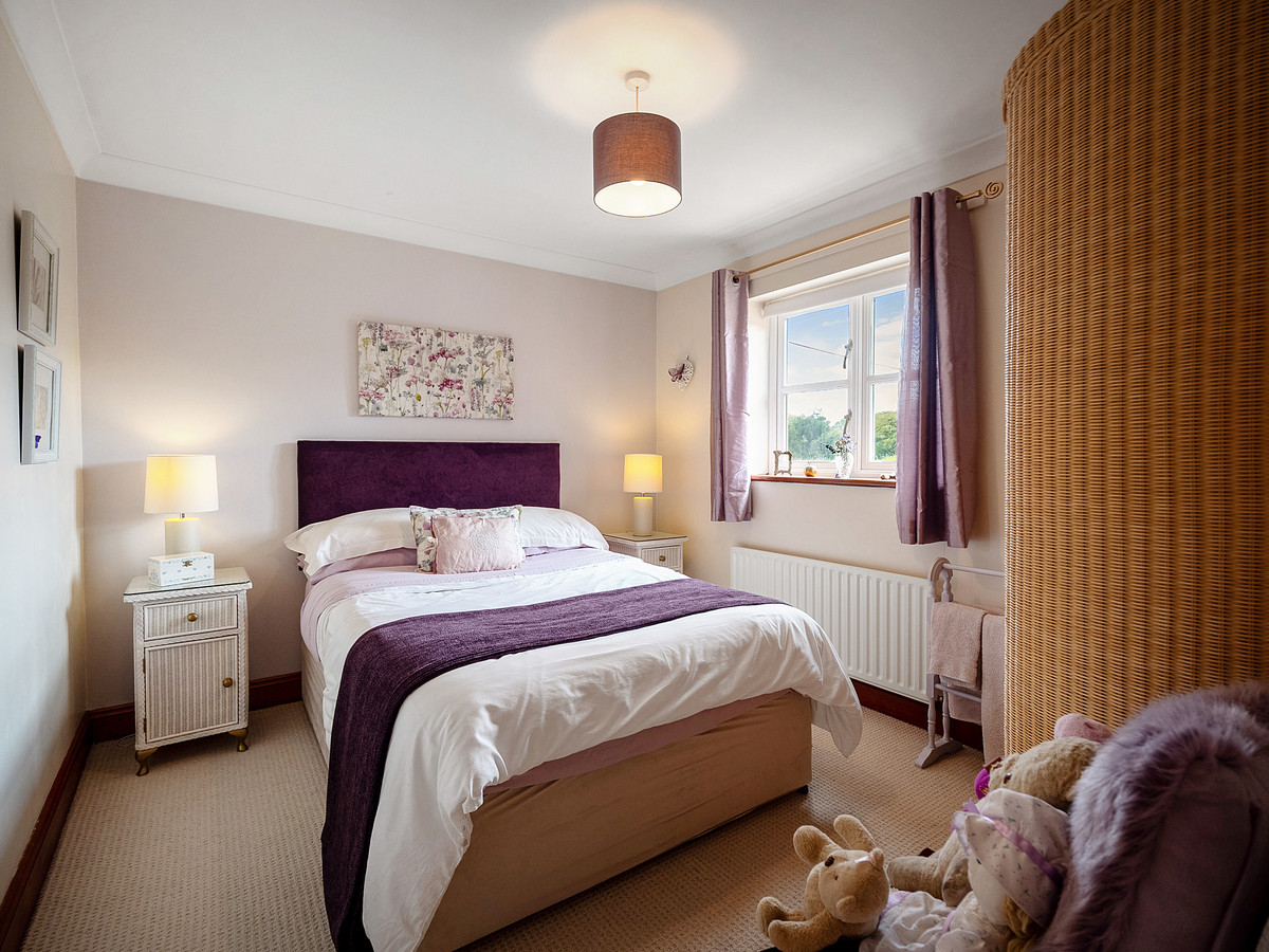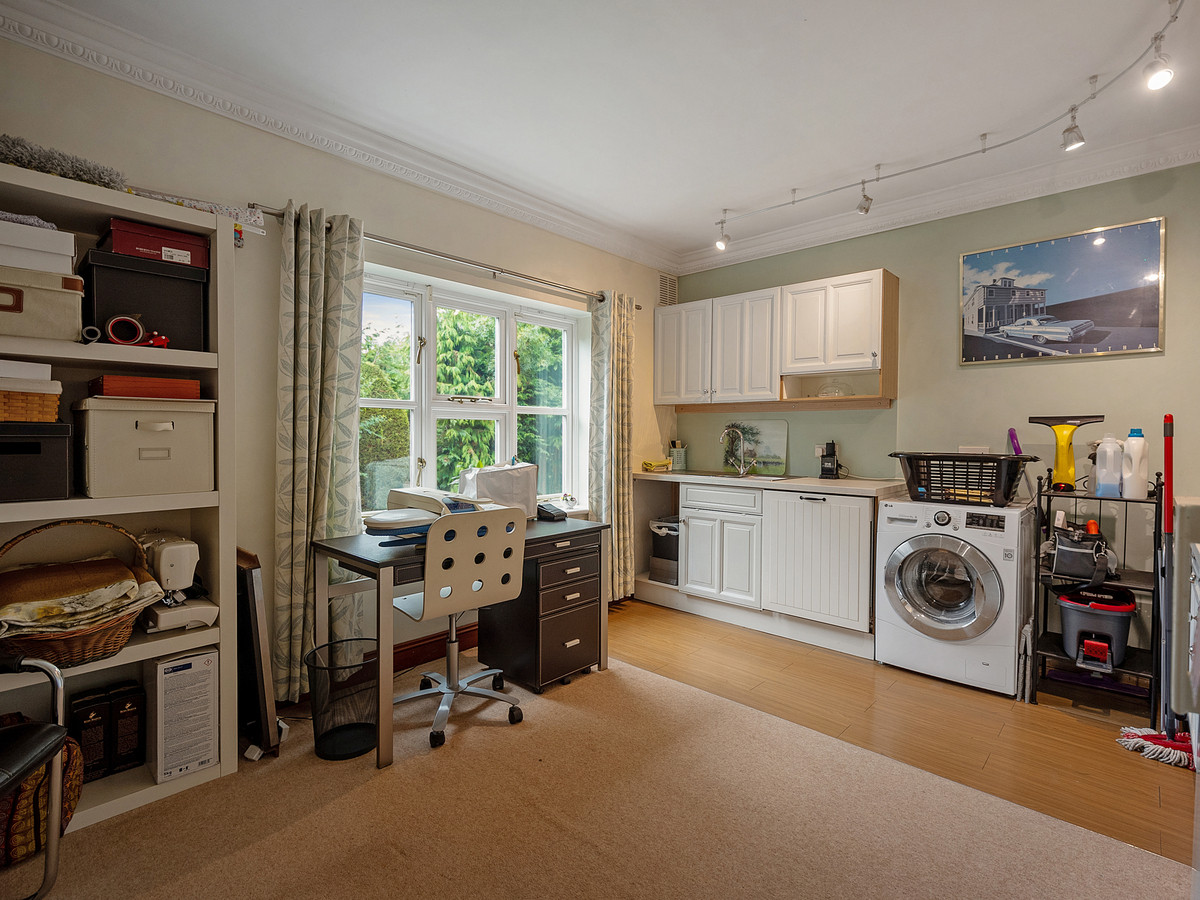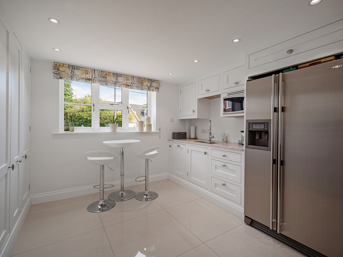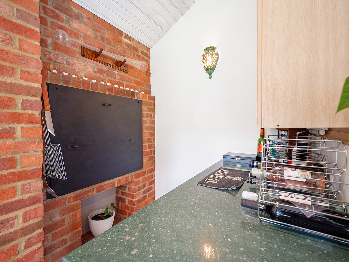 The heart of Scotsdale is its open-plan kitchen, lounge, and dining area, featuring stunning triple-aspect views. The kitchen, crafted by Waterford Kitchens Ltd., Ampthill, includes premium features such as a Falcon, a gas cooker and extractor hood, Quooker taps, and Quartz work surfaces. The porcelain tiles and wet underfloor heating add a touch of elegance and comfort. The area also includes a Samsung fridge freezer, a built-in pantry, and three patio doors leading to the garden. The dining room, equipped with patio doors and wet underfloor heating, offers a seamless transition to the decking area for alfresco dining. The lounge, with its log burner, creates a cozy atmosphere. The orangery/sunroom, with tiled flooring, a ceiling fan, and garden views, is an inviting space that also houses a built-in Jetmaster BBQ/bar area complete with a wine fridge, providing an excellent spot for indoor entertaining.