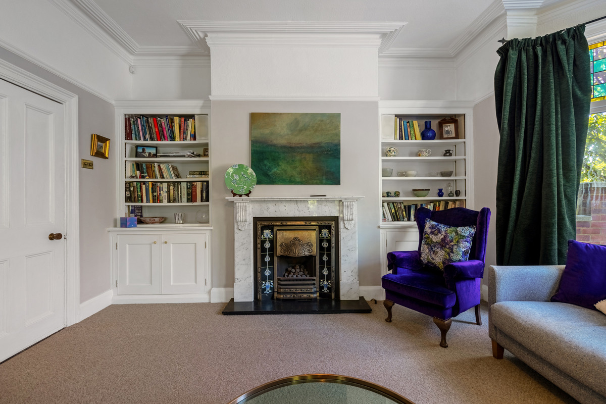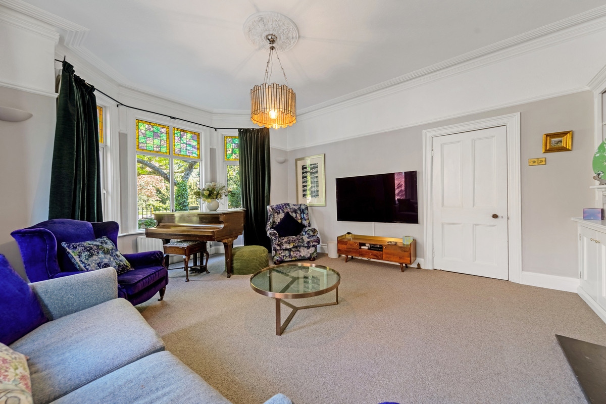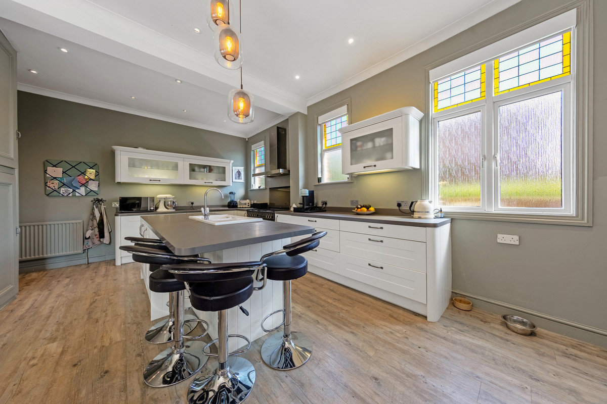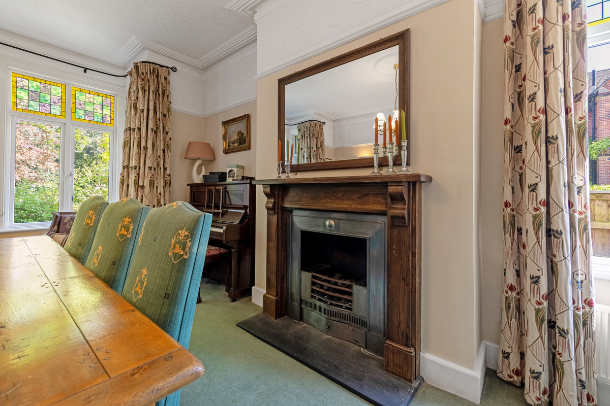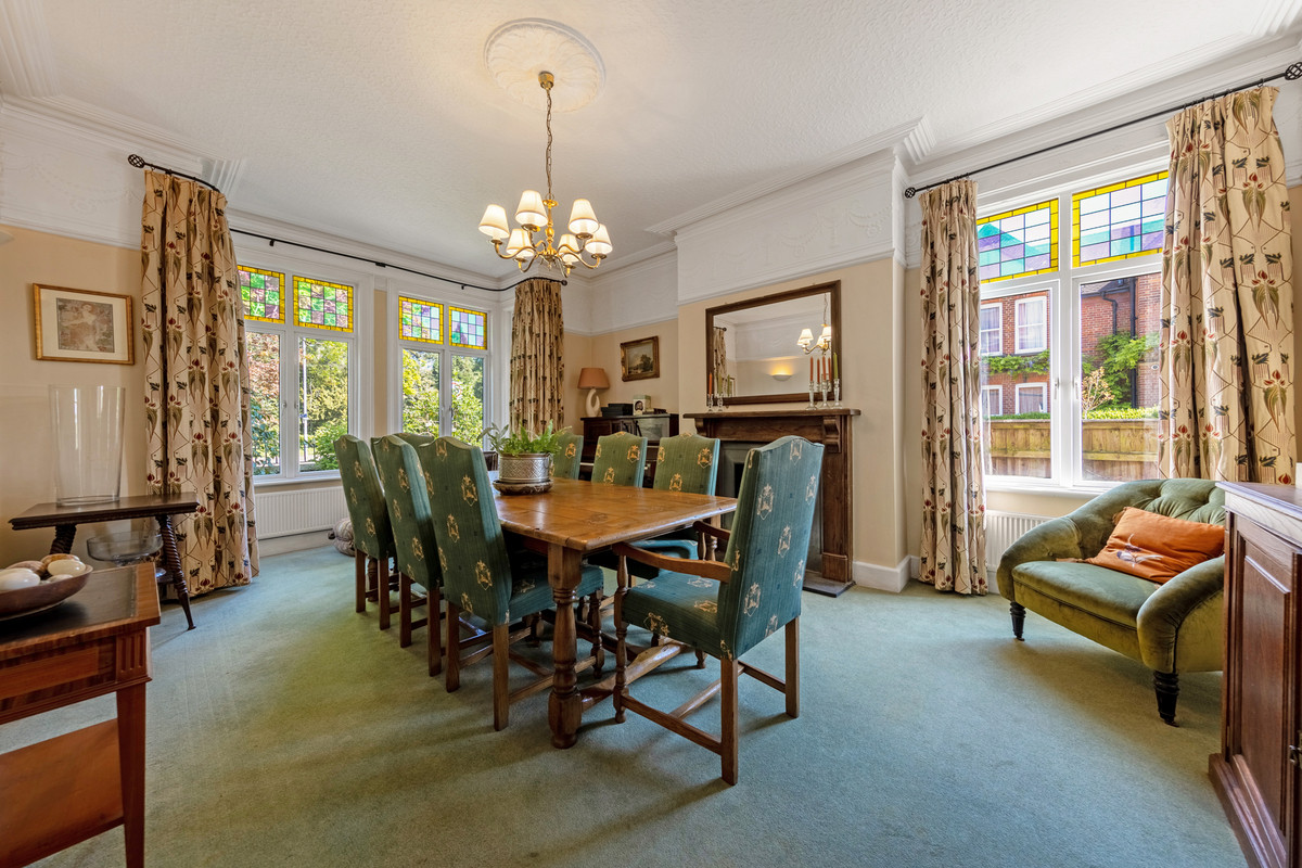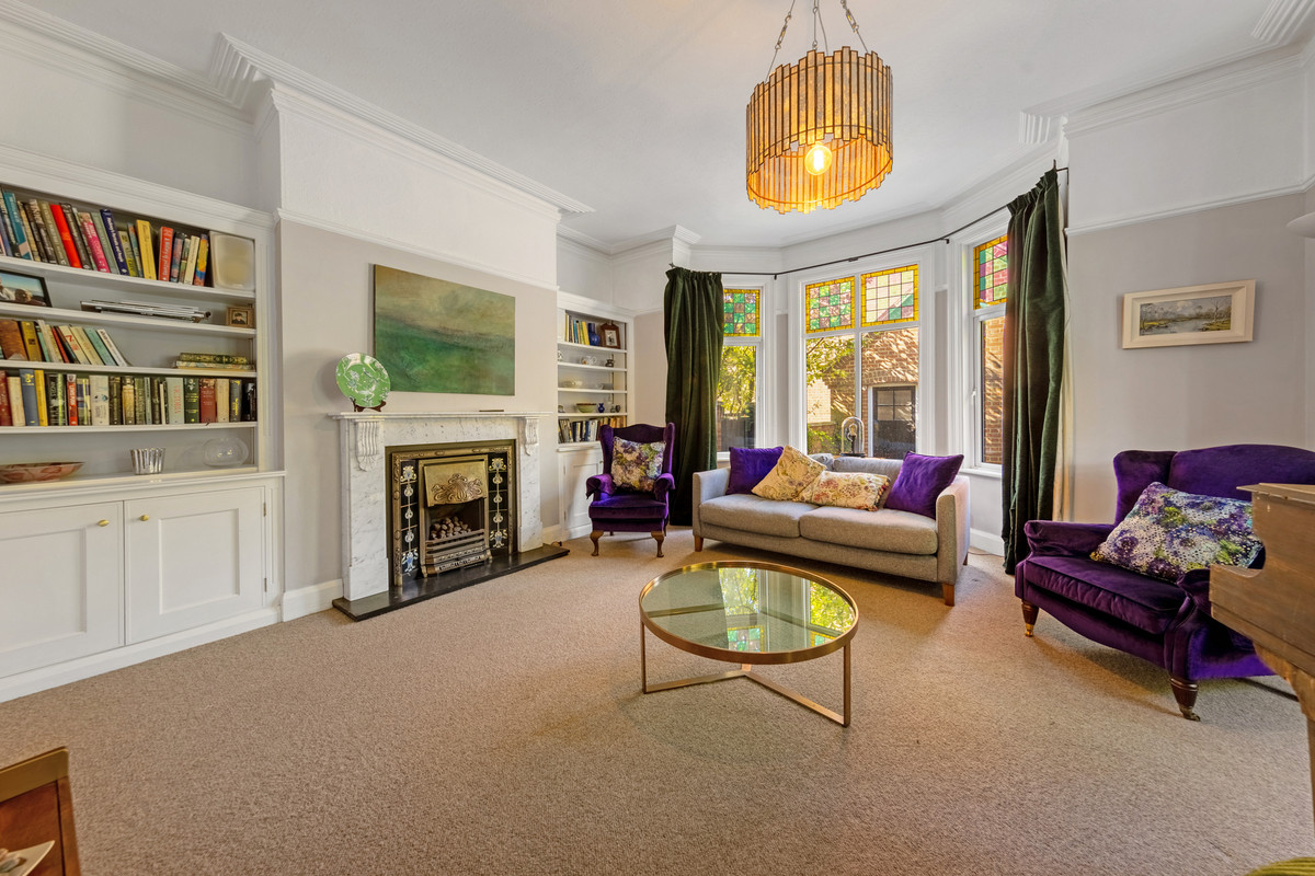 The ground floor layout is both practical and full of character. A generous entrance hall greets you with period detailing and leads through to a large formal sitting room at the front of the house, complete with a wide bay window featuring stained glass and a period fireplace. Adjacent is a versatile second reception room, perfect as a snug, playroom or study. Situated to the left of the entrance hall is a third large reception room perfect for dining.