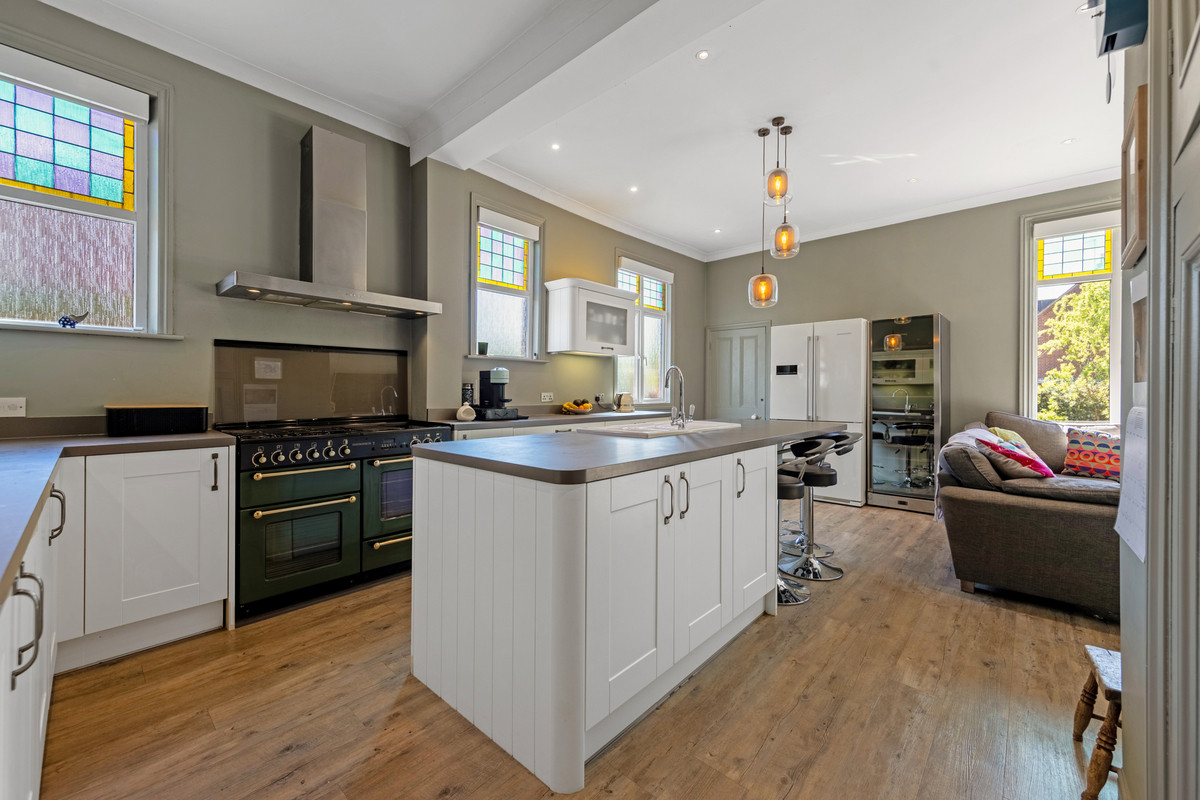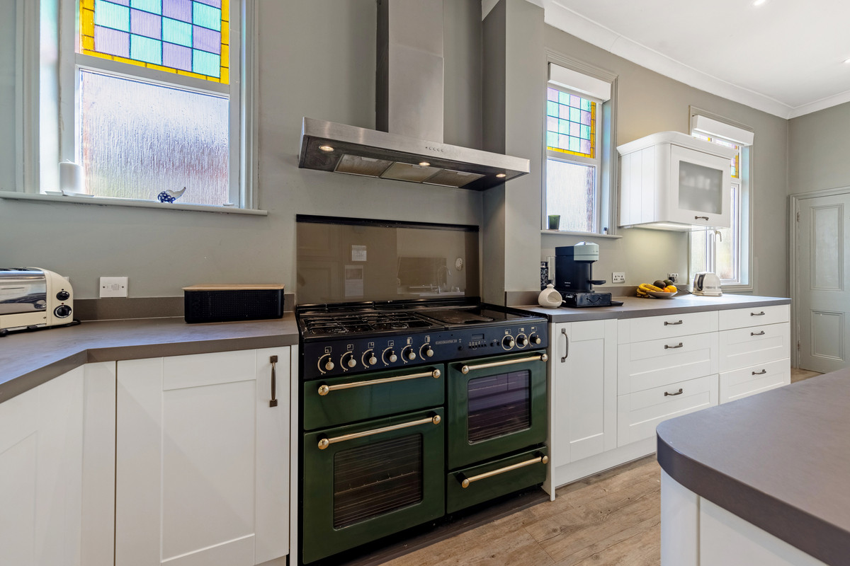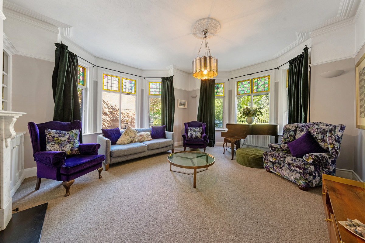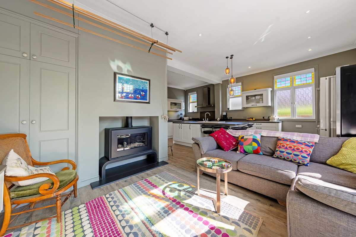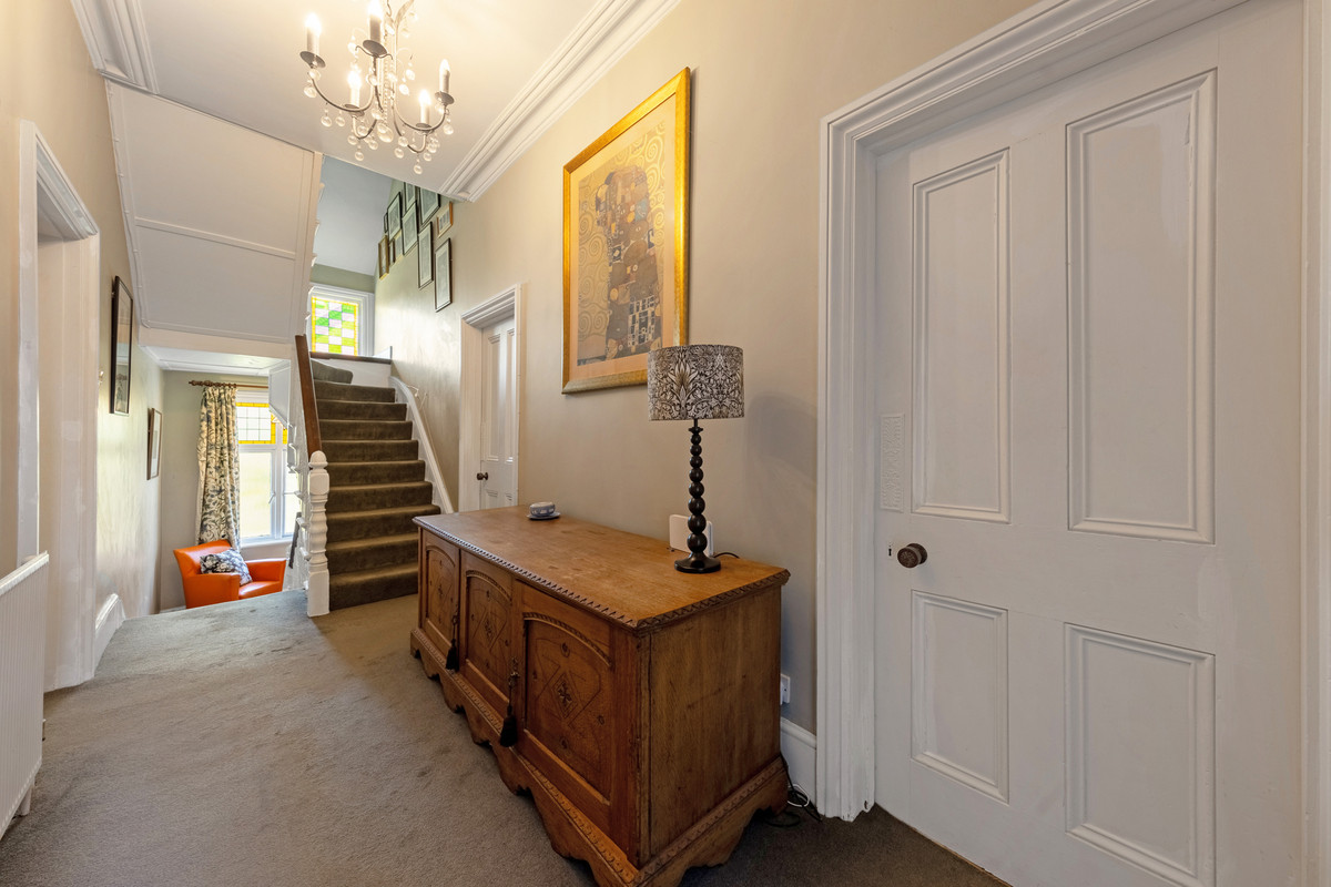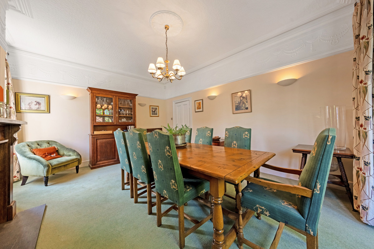 The ground floor layout is both practical and full of character. A generous entrance hall greets you with period detailing and leads through to a large formal sitting room at the front of the house, complete with a wide bay window featuring stained glass and a period fireplace. Adjacent is a versatile second reception room, perfect as a snug, playroom or study. Situated to the left of the entrance hall is a third large reception room perfect for dining.
