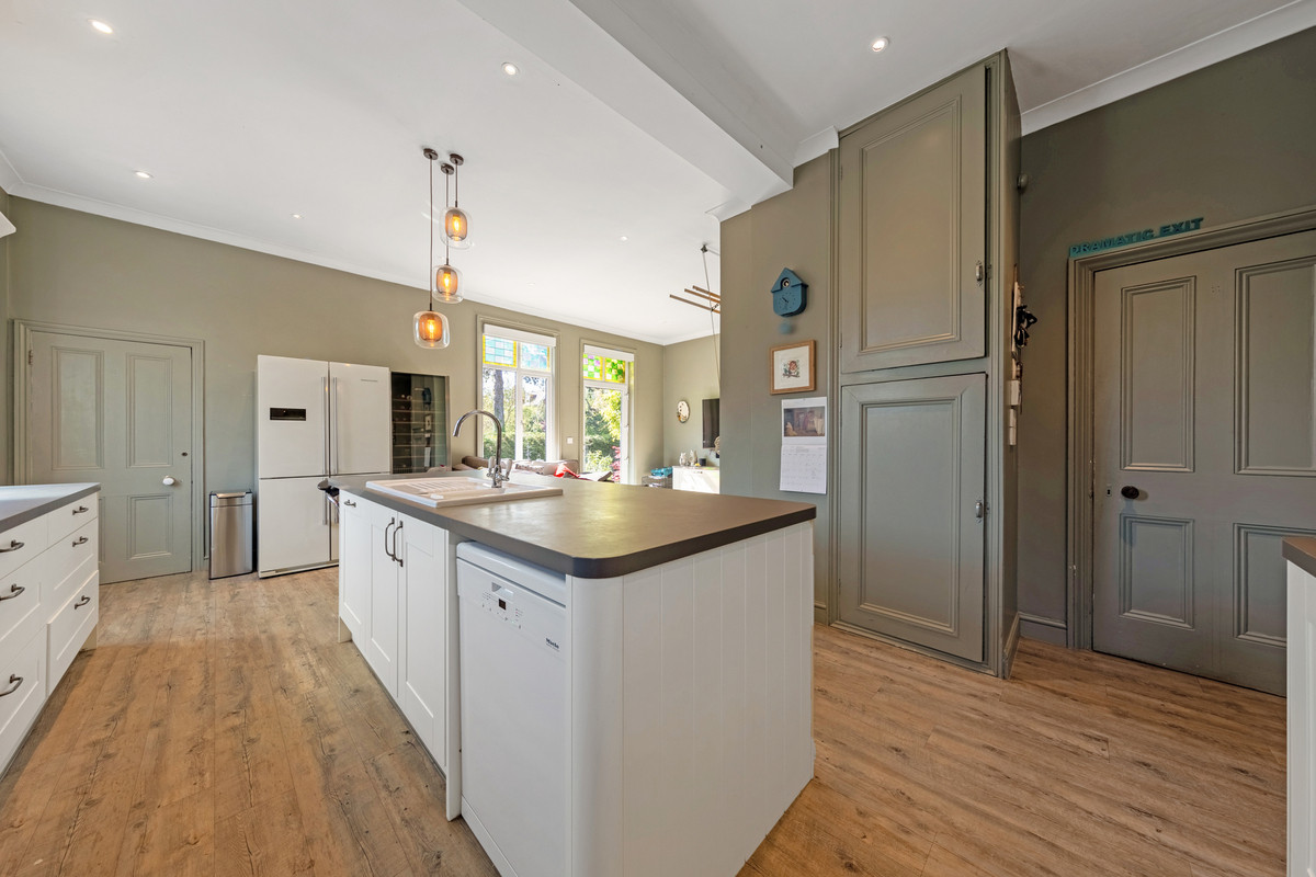 To the rear of the house lies the heart of the home — a stylish open-plan kitchen and living/dining space with French doors opening out to the garden. The kitchen is well appointed with shaker-style cabinetry, quality countertops, and space for a range cooker. A separate utility area and downstairs WC provide further convenience.