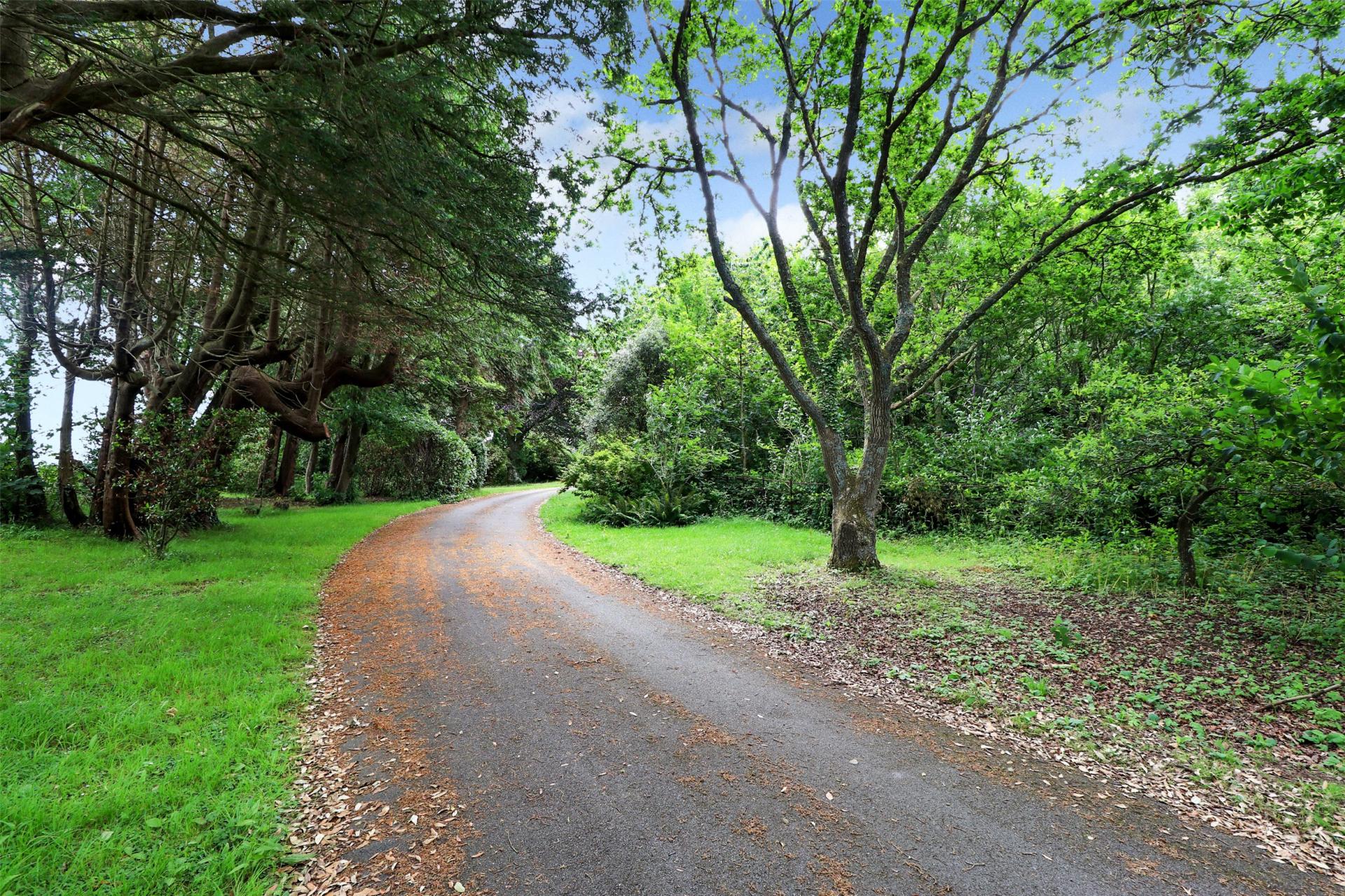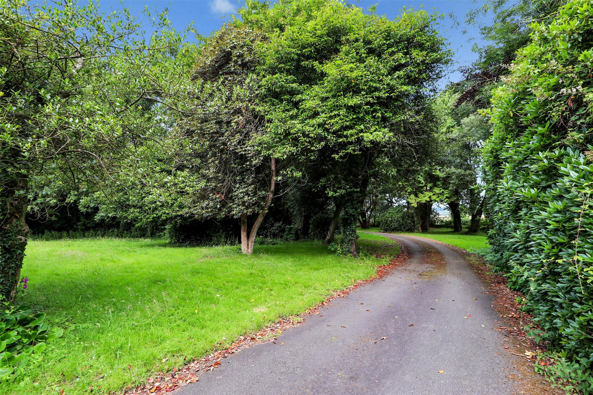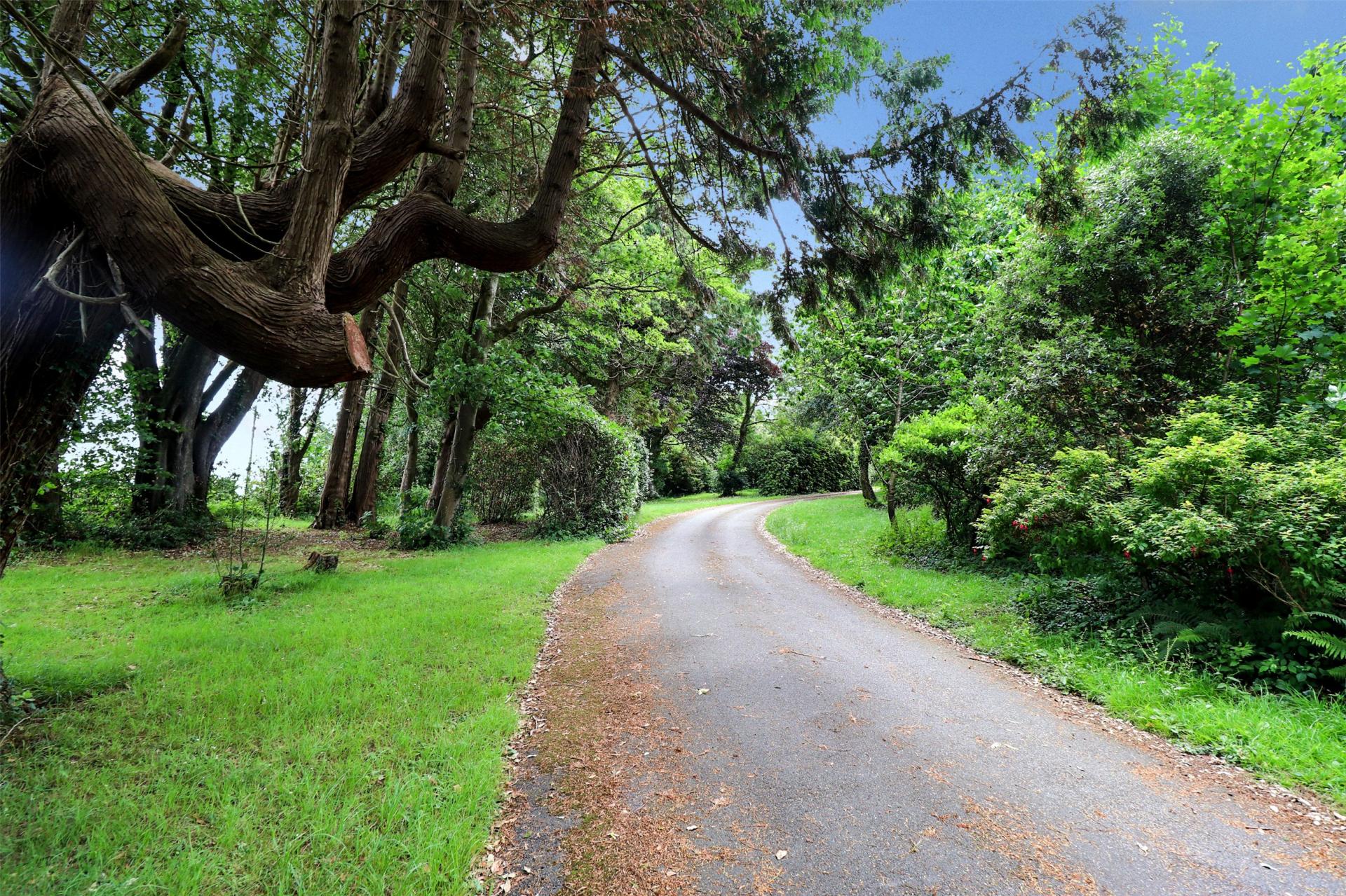 Approached via an impressive sweeping driveway with electric gated entrance, the property is framed by generous lawns and natural woodland, with an abundance of mature trees.