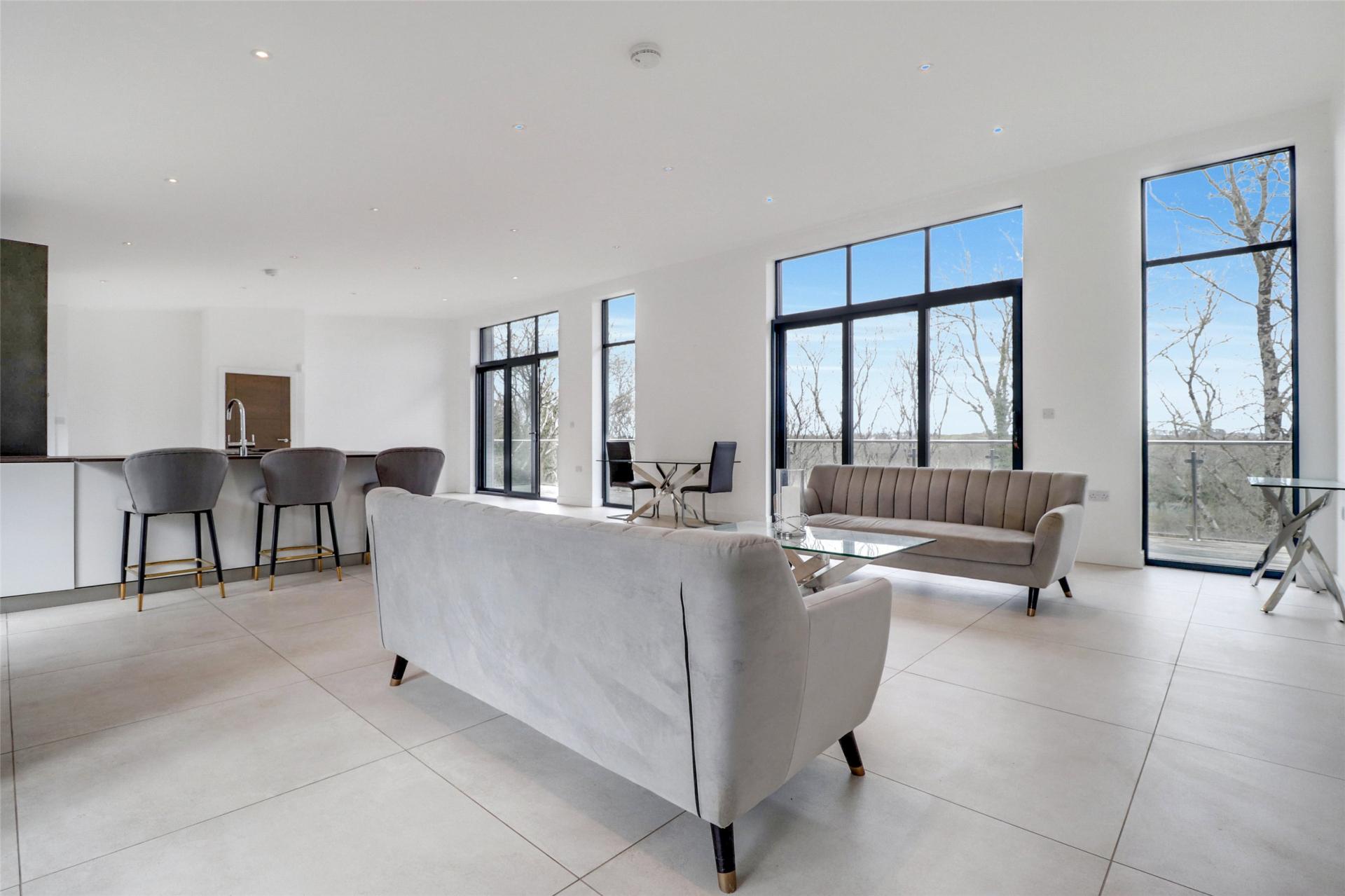 On the top floor is a further galleried landing with cloakroom and access to a fabulous double aspect 39'5"' x 18' open plan living/dining/kitchen with pitched vaulted ceiling and floor to ceiling windows with doors leading out to front and rear balconies that benefit from lovely countryside views.