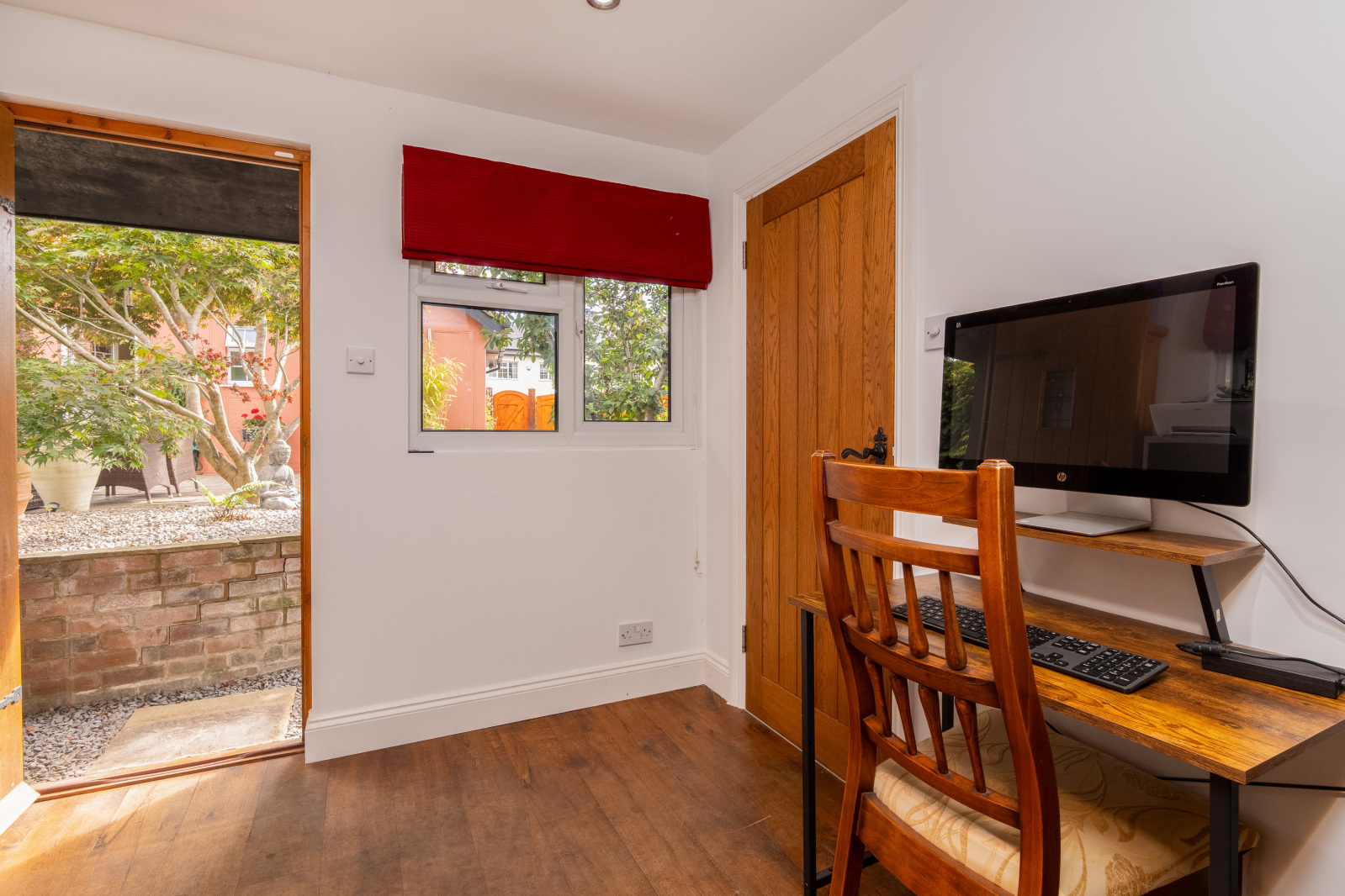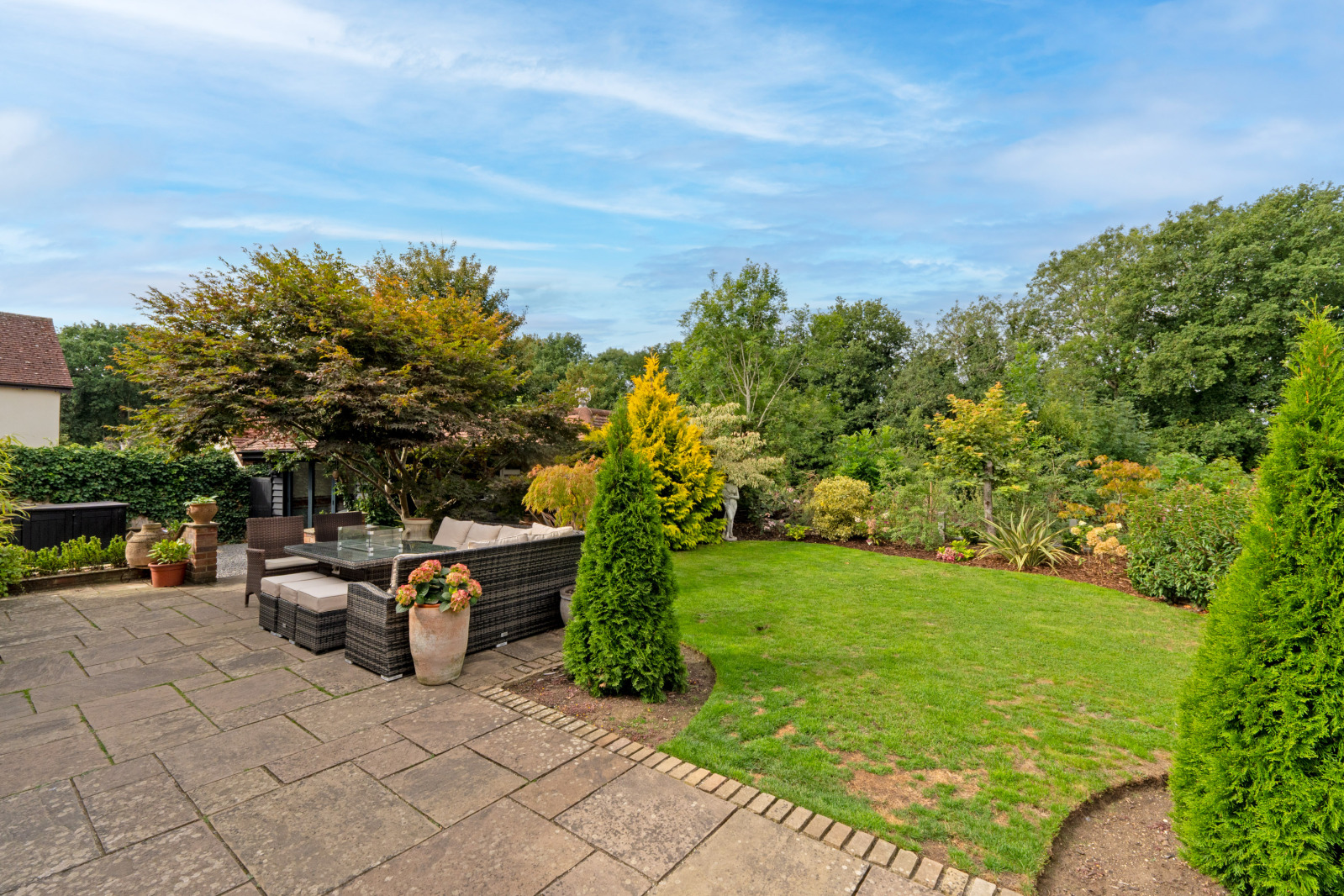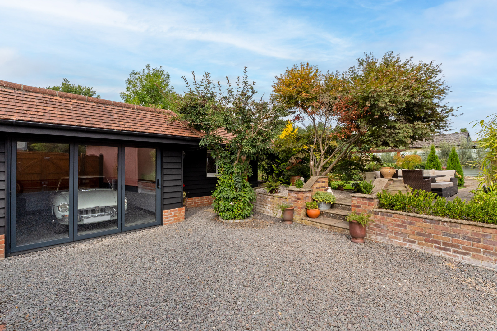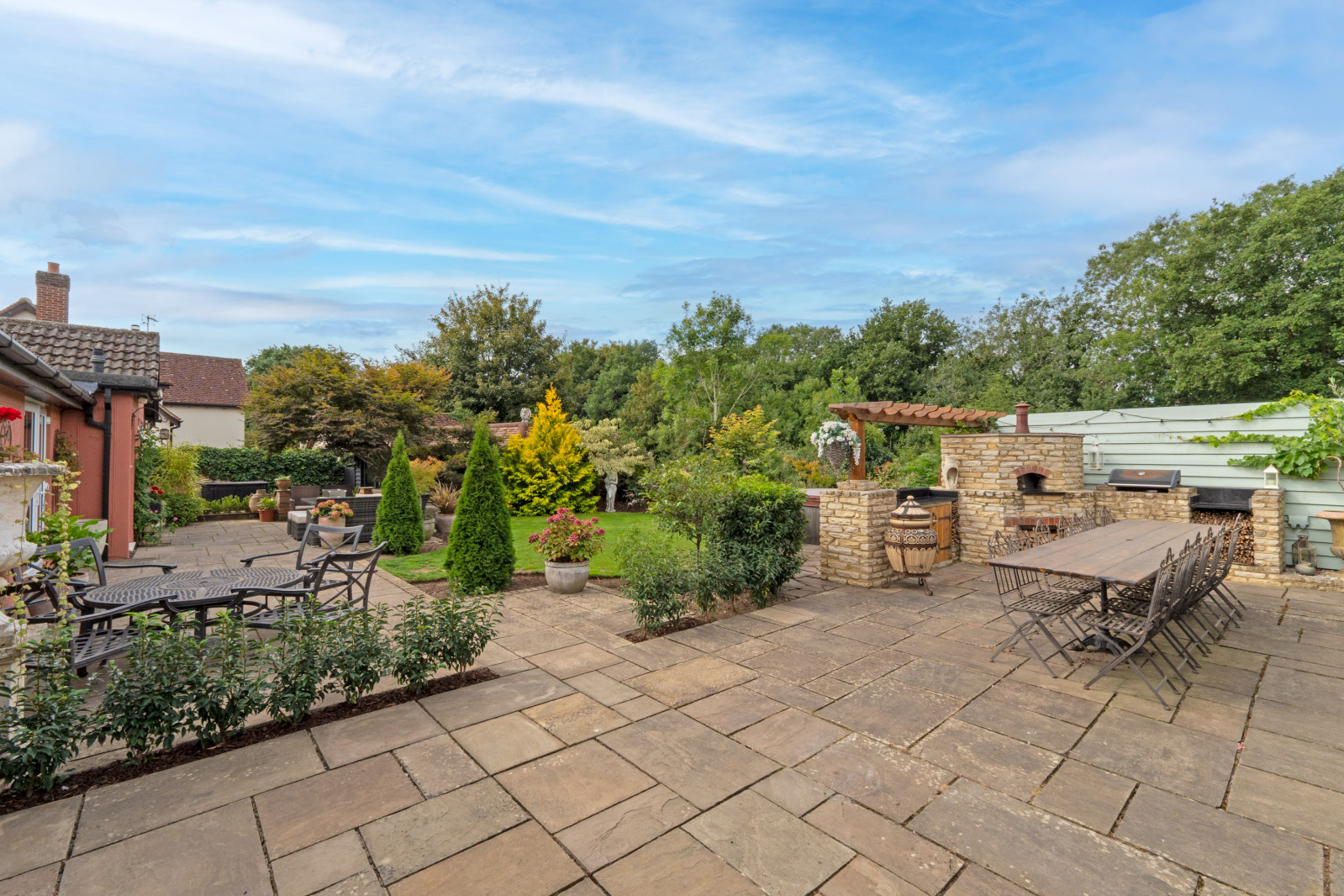 Outside To the front, a gated gravel driveway offers parking for several vehicles and leads to a further set of wooden gates, beyond which lies additional parking and access to the garage with adjoining music studio and office. The remainder of the private garden has been thoughtfully landscaped, featuring terraced areas ideal for outdoor dining and entertaining, along with a purpose-built outdoor kitchen.
