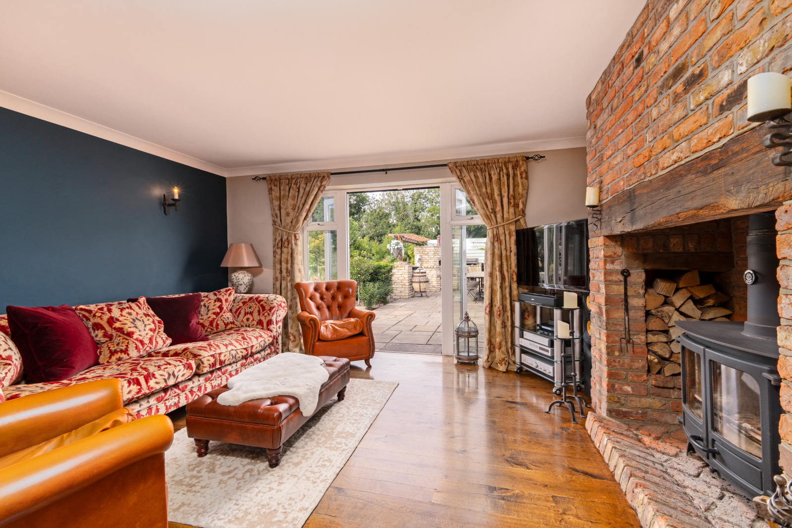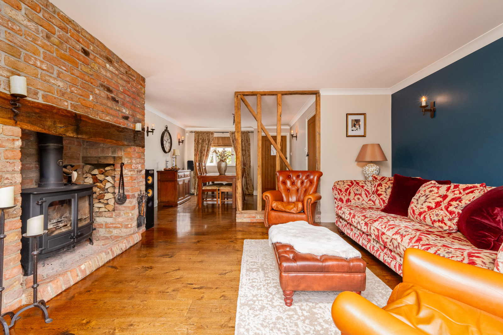 The Accommodation A part-glazed front door opens into the entrance lobby, with a further door leading into a bright, dual-aspect sitting room. This welcoming space features an impressive inglenook fireplace with inset Charnwood Island 3, dual-fuel burner and French doors opening onto the rear garden and terrace.