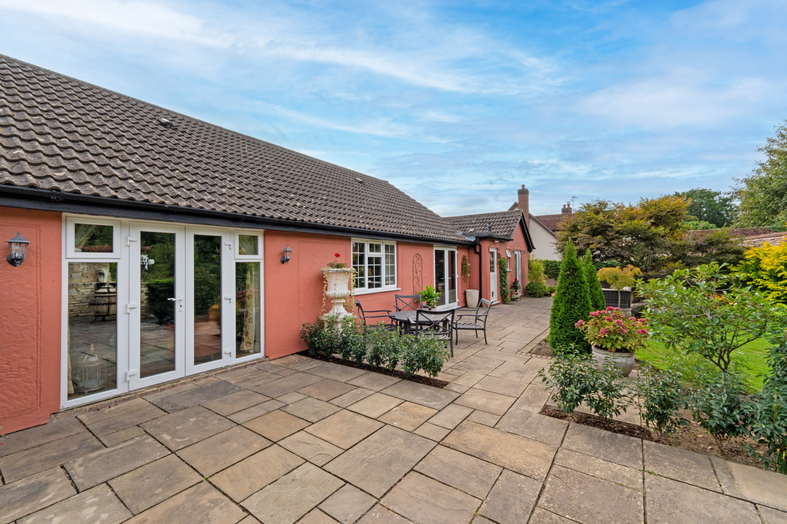 The Property This beautifully presented detached single-storey home is set on a private road in a prime position within the thriving village of Elsenham. The property offers two double bedrooms and one single bedroom, including a principal suite with ensuite shower room, along with two further bedrooms and an en-suite, and a separate family shower room, two reception rooms, and a spacious kitchen/breakfast room. To the front, a gated driveway provides parking for three to four vehicles. At the rear, a detached garage/studio is complemented by an adjoining office/soundproofed music room, creating versatile additional space. The private gardens are designed for both relaxation and entertaining. The space boasts a superb outdoor kitchen complemented by a traditional wood-fired pizza oven, making it ideal for alfresco dining and entertaining. Part of the garden is beautifully lined with olive trees, creating a Mediterranean ambiance and offering tranquil area to relax.