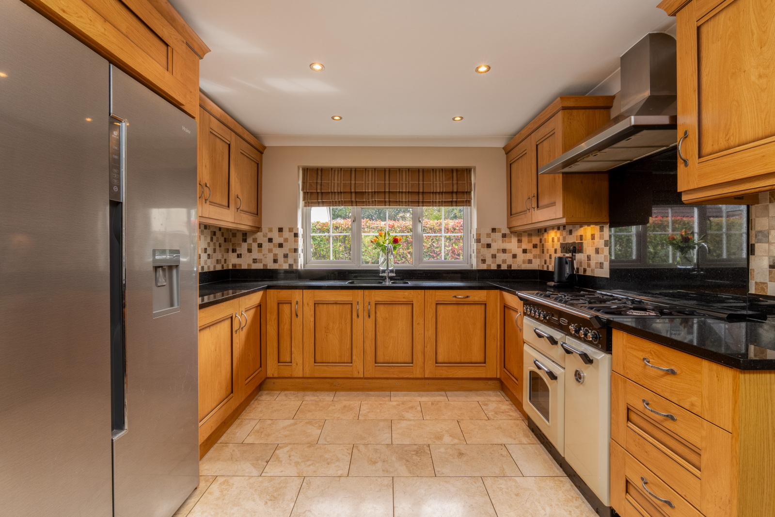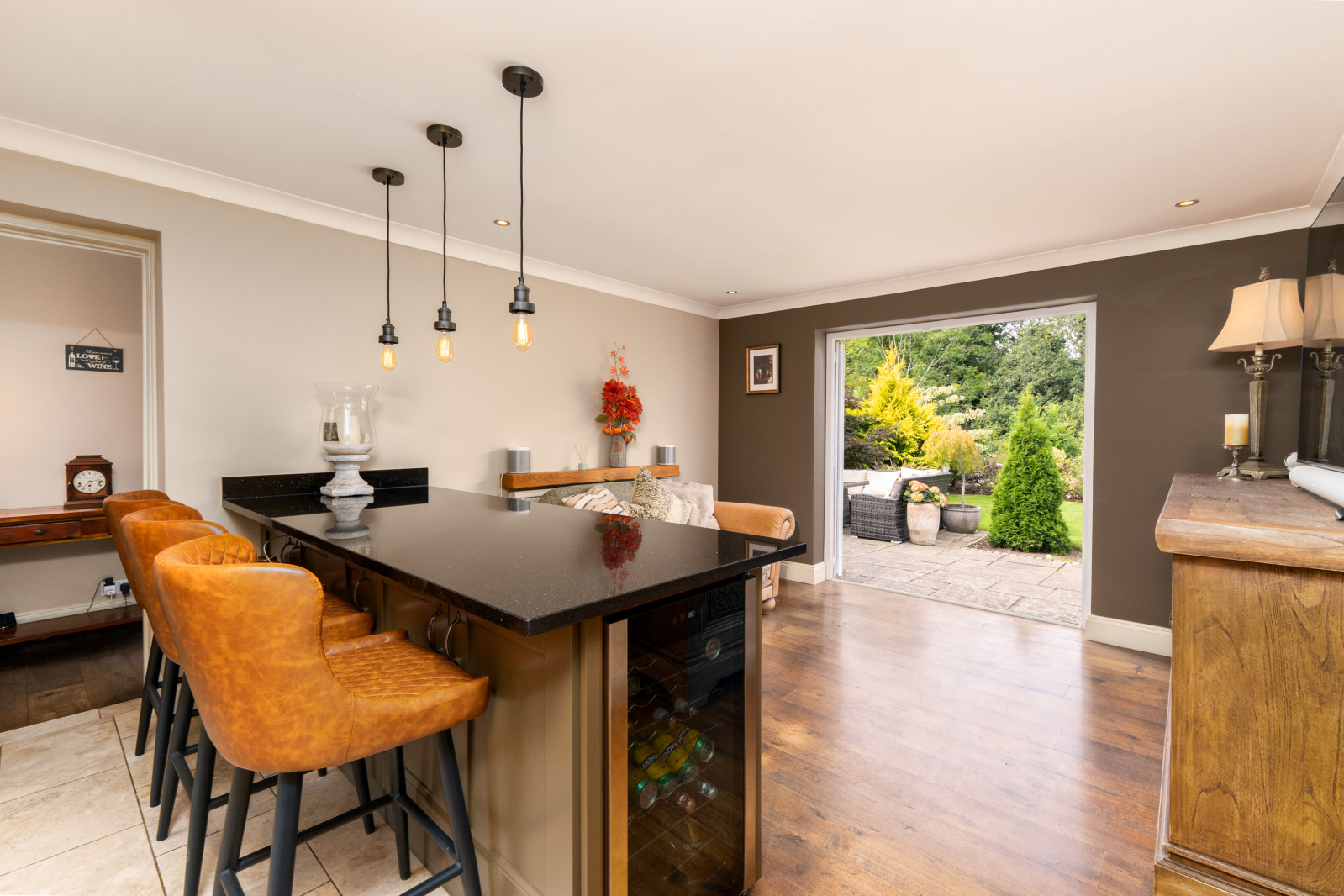 A hallway then leads through to the kitchen/breakfast room, fitted with a comprehensive range of wall and base units, integrated appliances, and a breakfast bar. French doors provide direct access to the garden and terrace, creating a wonderful space for both everyday living and entertaining. Adjacent to the kitchen is a separate utility room with its own external door to the rear garden.