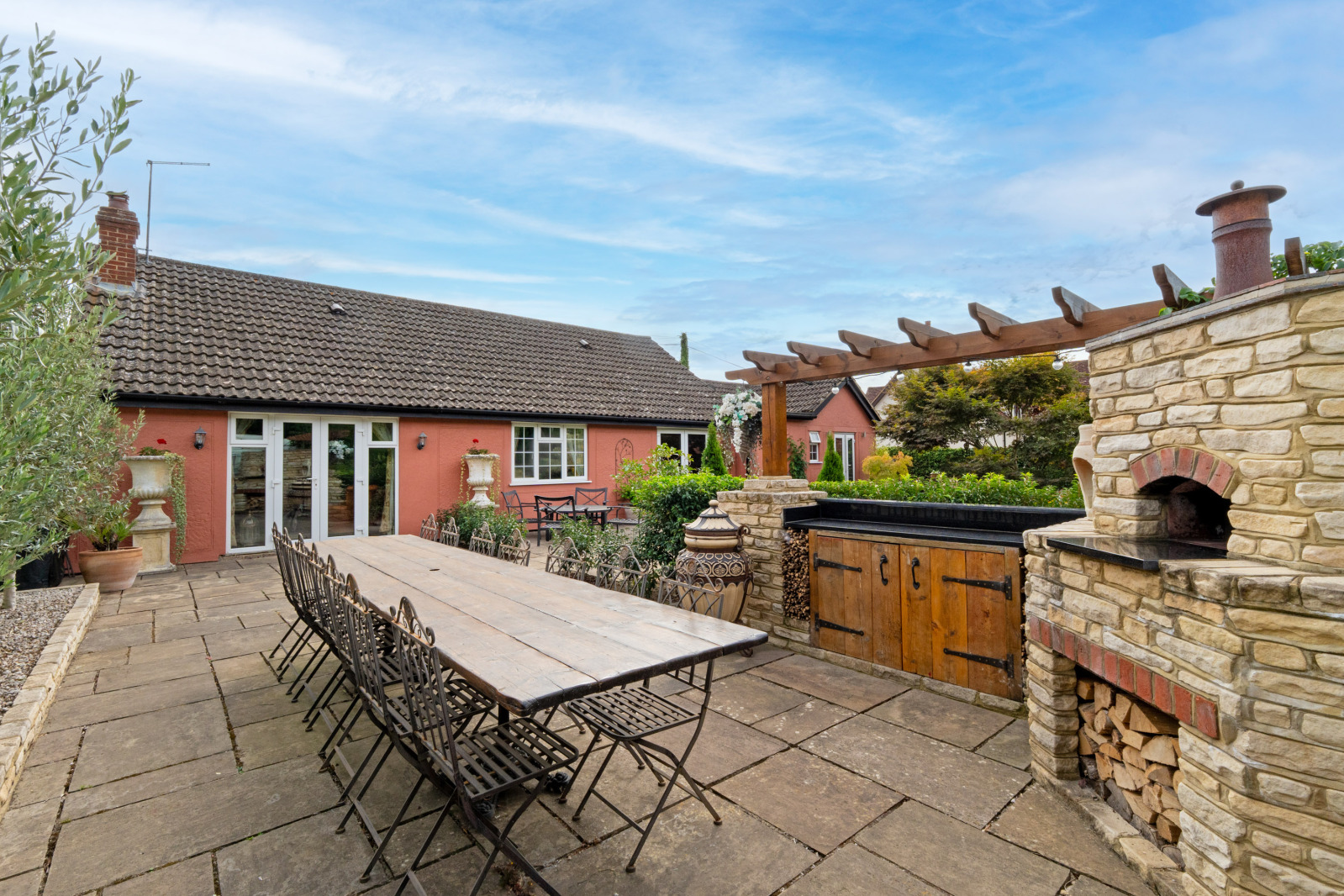 To the front, a gated driveway provides parking for three to four vehicles. At the rear, a detached garage/studio is complemented by an adjoining office/soundproofed music room, creating versatile additional space. The private gardens are designed for both relaxation and entertaining. The space boasts a superb outdoor kitchen complemented by a traditional wood-fired pizza oven, making it ideal for alfresco dining and entertaining. Part of the garden is beautifully lined with olive trees, creating a Mediterranean ambiance and offering tranquil area to relax.