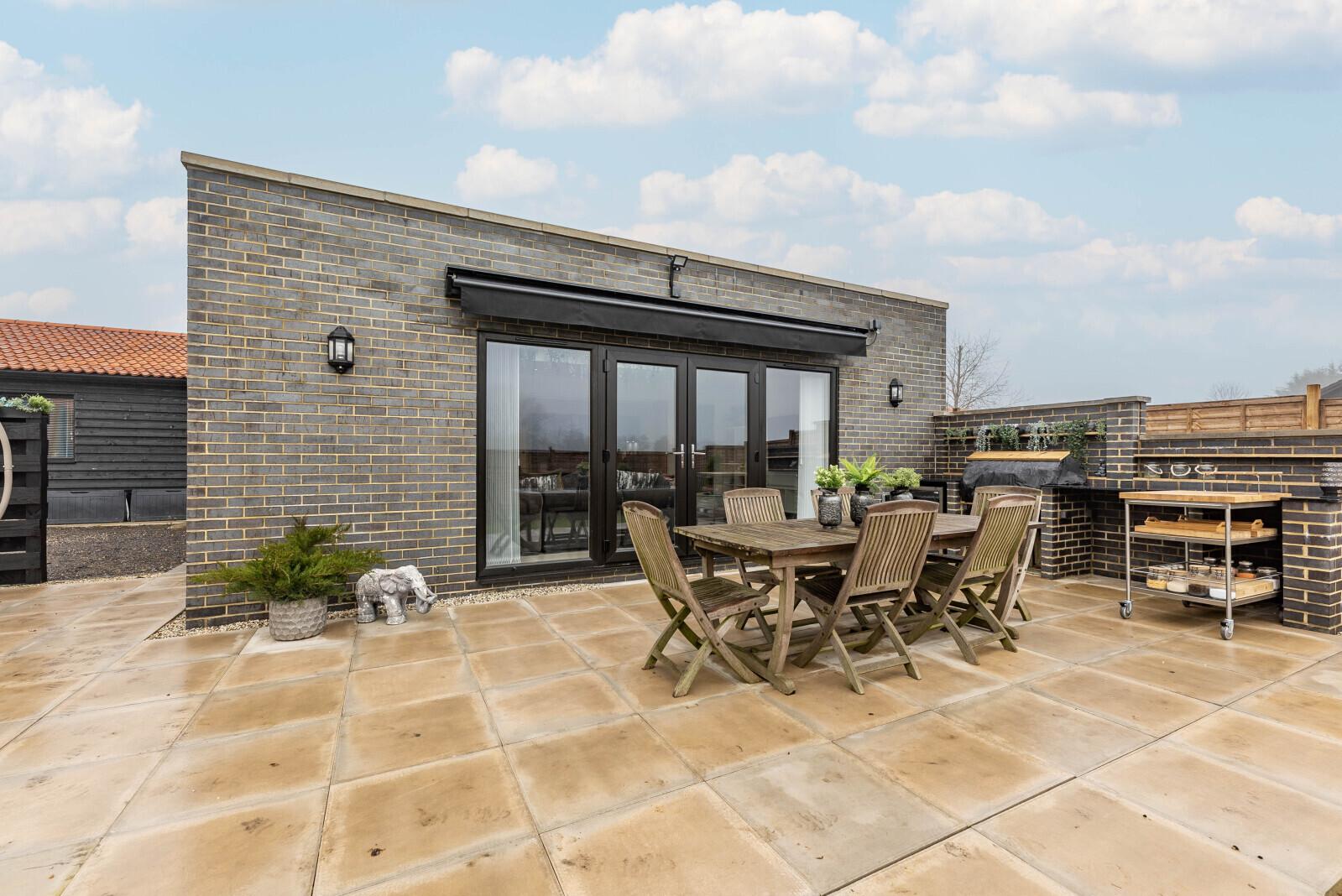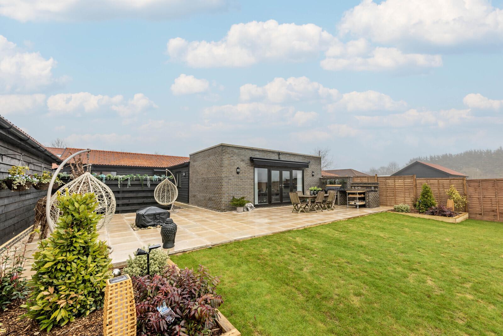 Outside The gated driveway is situated to the front of the property and offers parking for several vehicles leading to a detached double garage. Side access leads to the garden which is predominantly laid to lawn with shrubbed borders and a pathway to the rear of the property takes you to the more formal landscaped garden with a large terrace immediately outside the sitting room, with brick-built BBQ, perfect for outside dining and entertaining.