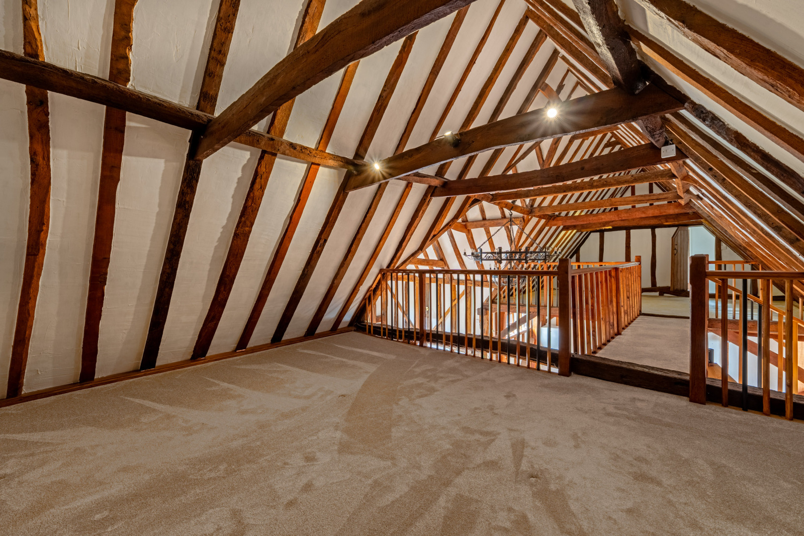 The first floor is arranged around a galleried landing, offering three double bedrooms together with generous eaves storage.