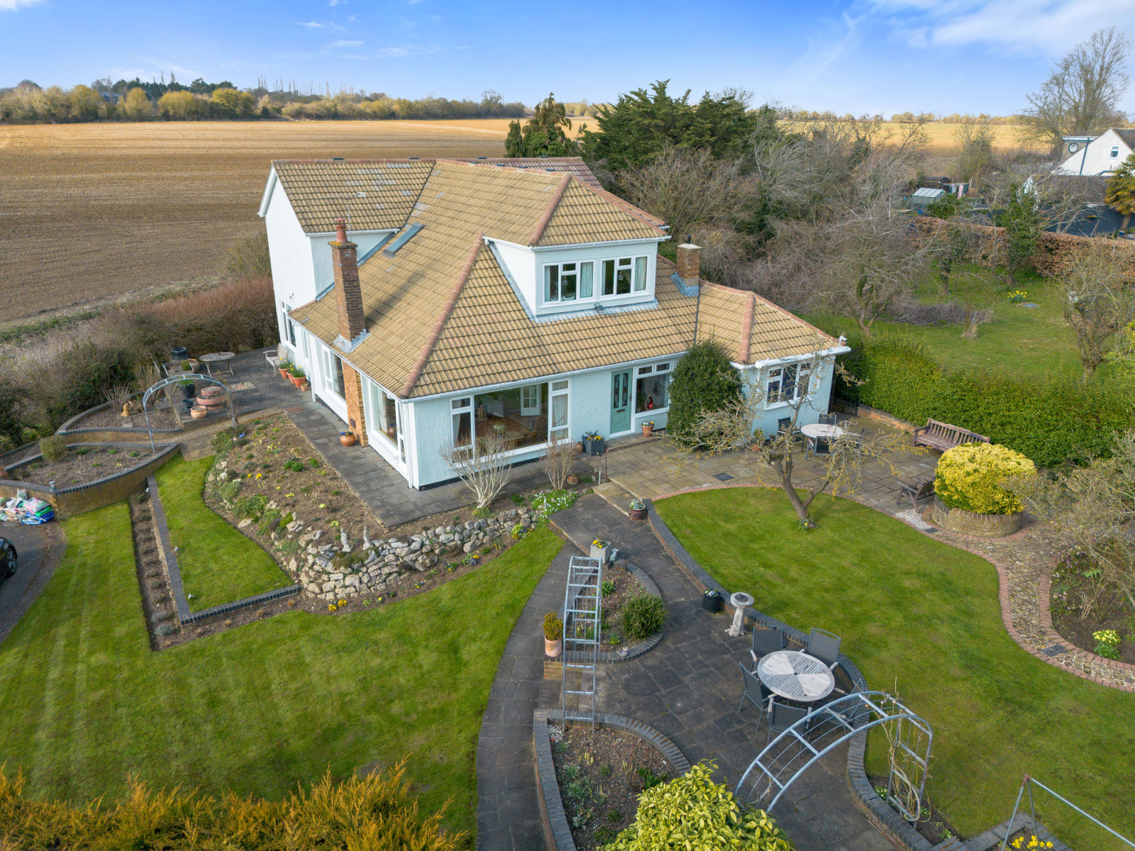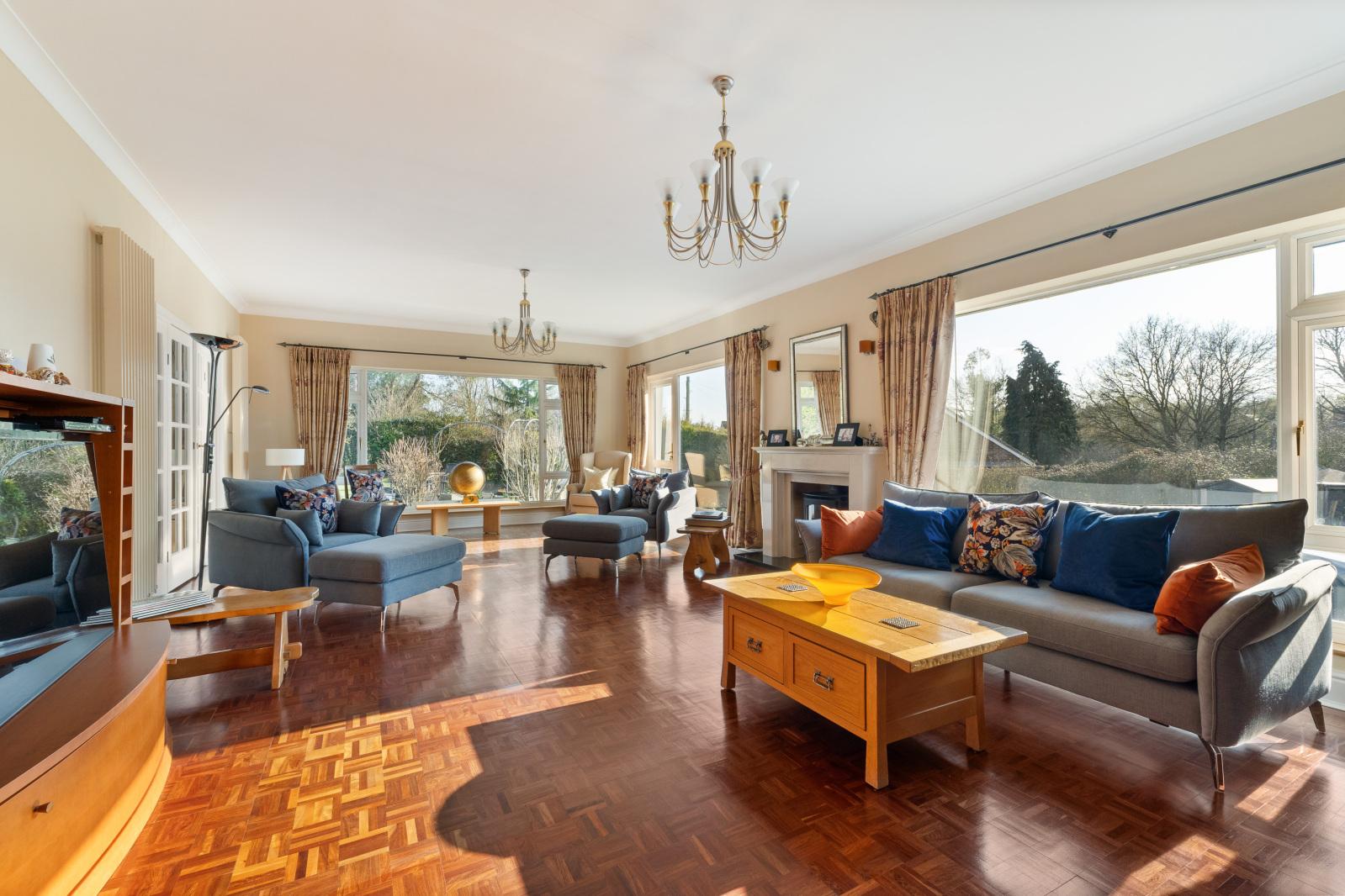 Outside To the side of the property is a paved driveway offering parking for numerous vehicles with a fitted UV charger. The landscaped gardens wrap around the property with various patio and entertaining areas, including a west facing decking area to sit and watch the sunset over adjoining countryside. The gardens are predominantly laid to lawn with mature trees, hedges and flowerbeds.