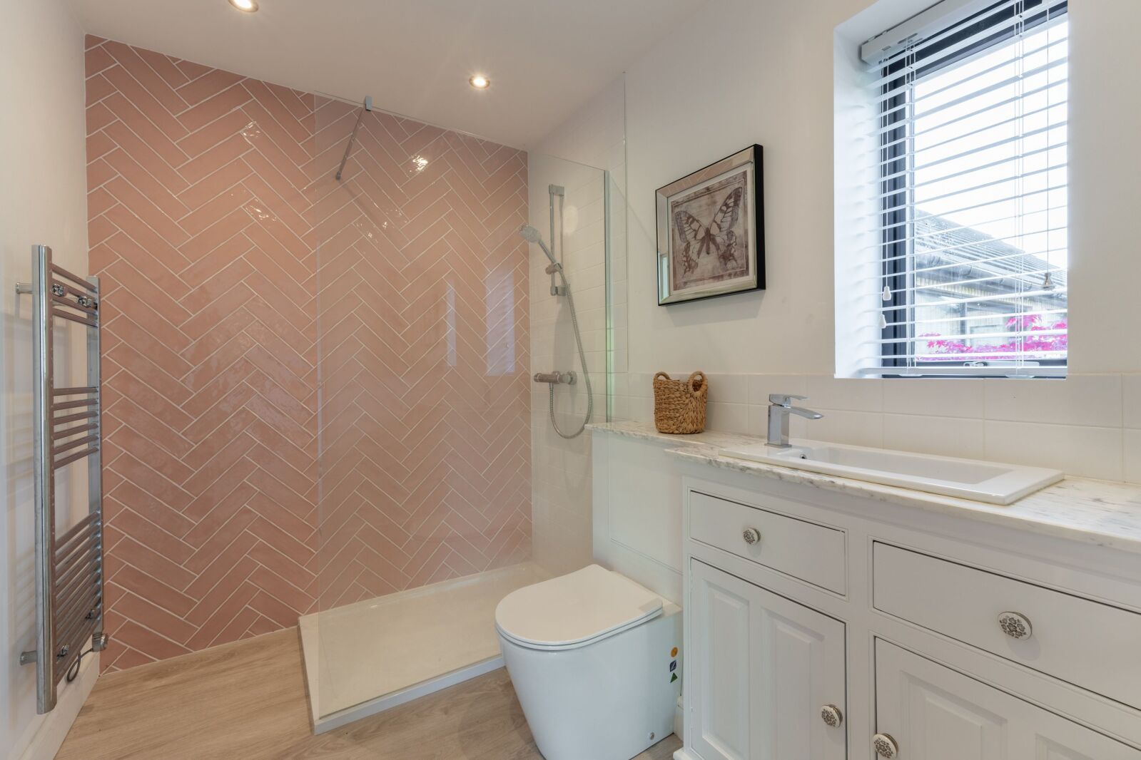 Accommodation A glass door opens onto a bright entrance hallway with wood flooring and a skylight and large, picturesque window overlooking the garden and terrace. Doors to the left open onto two double bedrooms, both having sliding patio doors to the garden and en-suite shower facilities. The hallway further flows through to the center of the property and the most stunning, expansive open plan living, kitchen and dining area with natural light flooding the room from remote operated skylights in the vaulted ceiling. Large sliding patio doors open onto the terrace and outside entertaining space. The Kitchen area has been well designed with an abundance of storage cupboards, a stunning central island with a 3.5m Brazilian quartzite worksurface, integrated appliances, Quooker hot water tap and an additional worksurface housing an induction hob with integrated extractor. There is a fully-shelved, walk-in pantry and a separate utility/boot room with an external door to the front aspect and a wc.