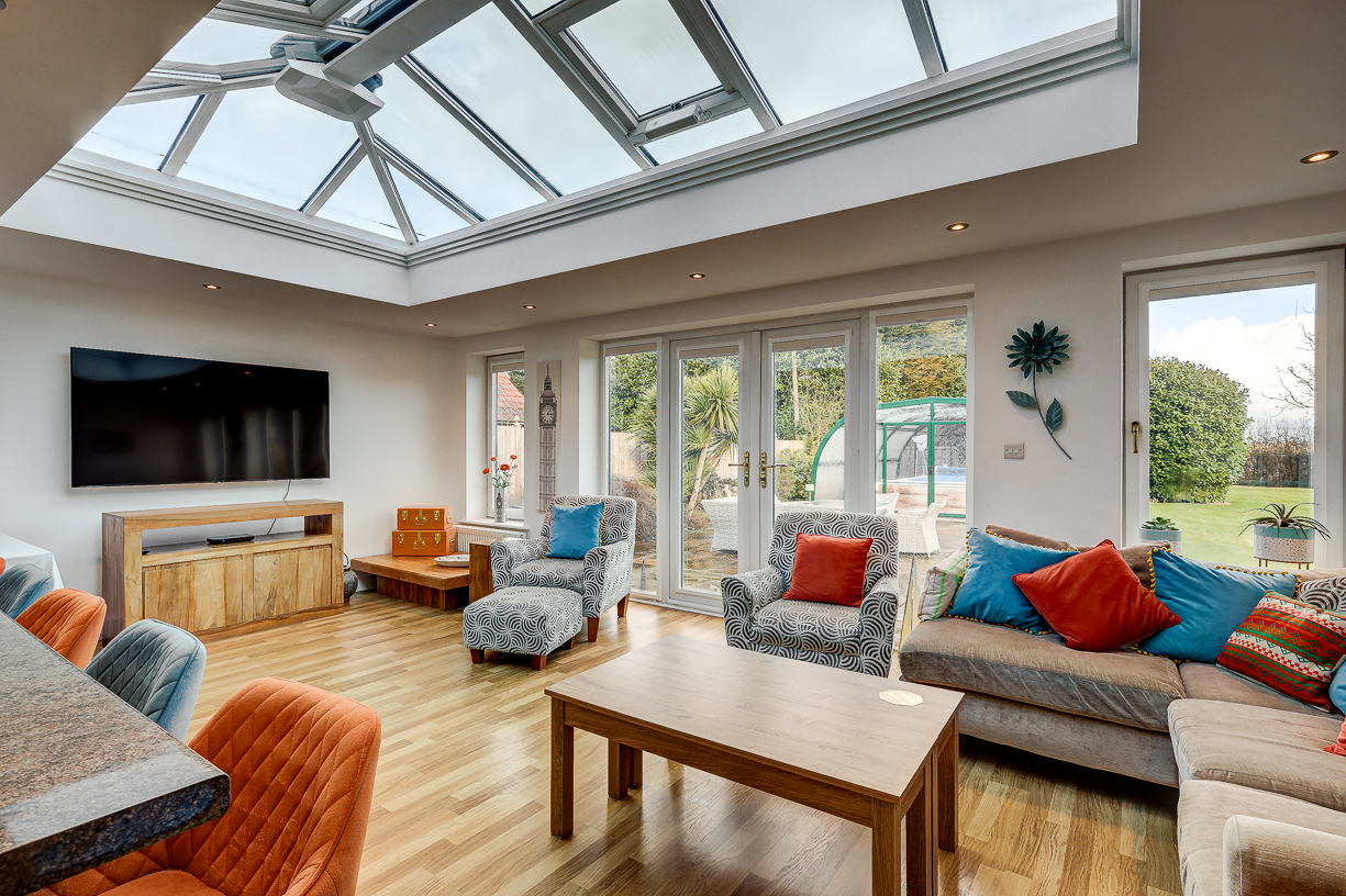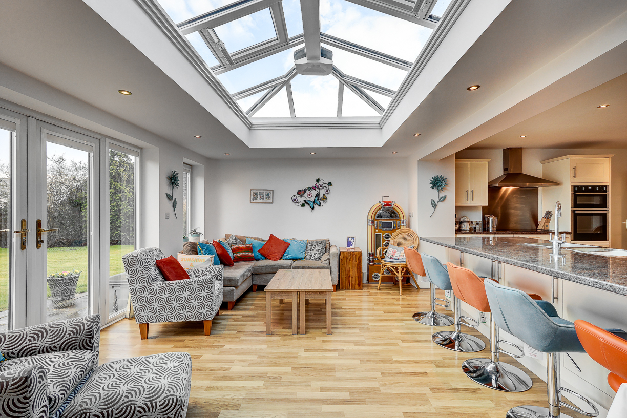 Upon entering, you are welcomed by a spacious entrance hall with a striking galleried landing, setting the tone for the grandeur of this home. At the heart of the property is an impressive open-plan kitchen, breakfast, and living area, designed to be a perfect social hub for family gatherings. The kitchen features an integrated double oven, 5 ring electric hob and dishwasher, a lantern ceiling, and skylights with rain-sensor technology, allowing natural light to flood the space. A separate utility room provides additional convenience with direct access to the garden.