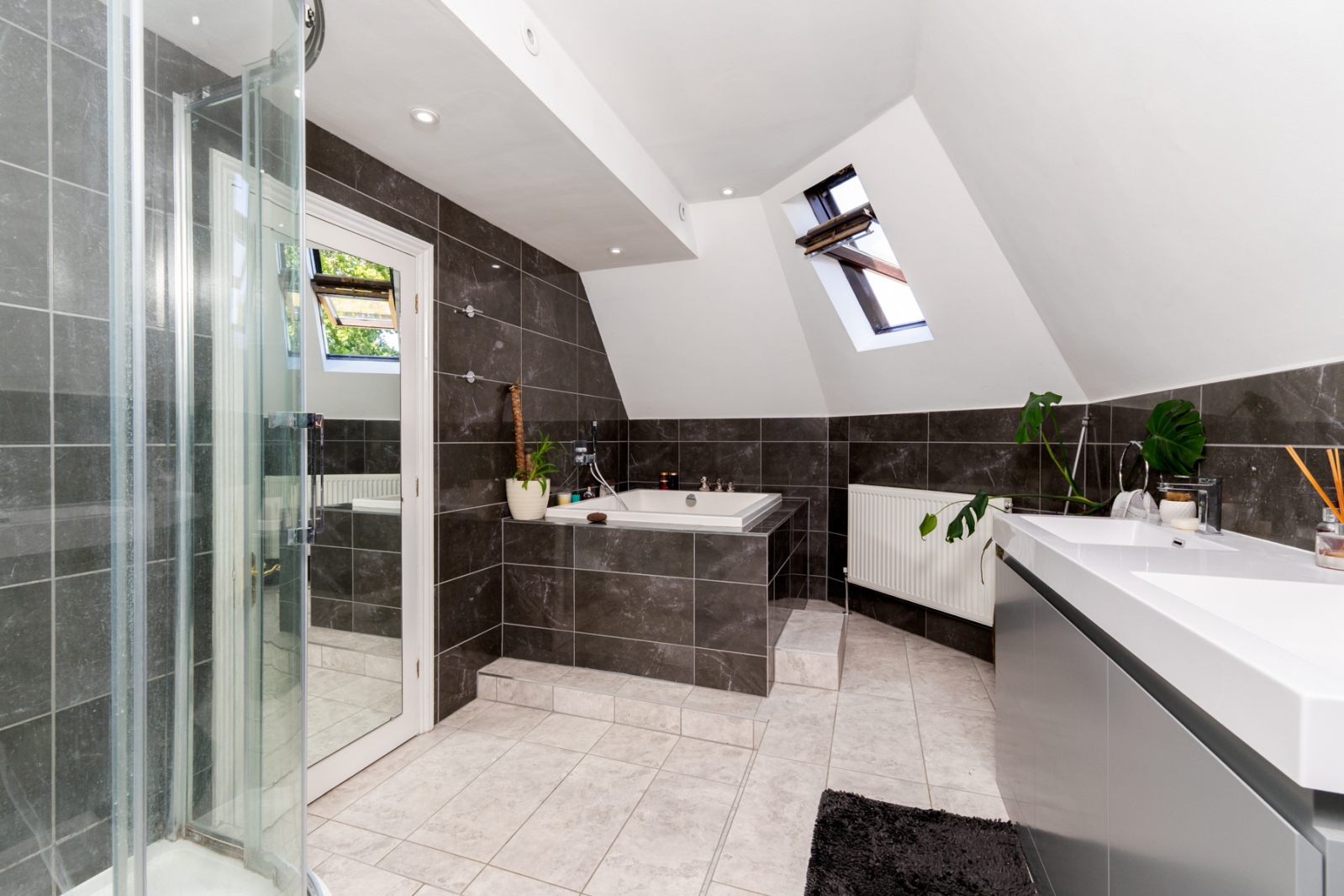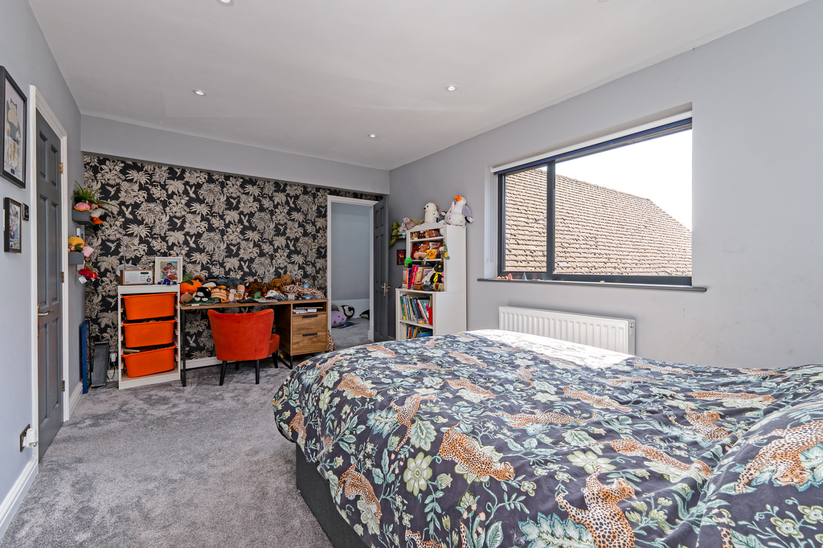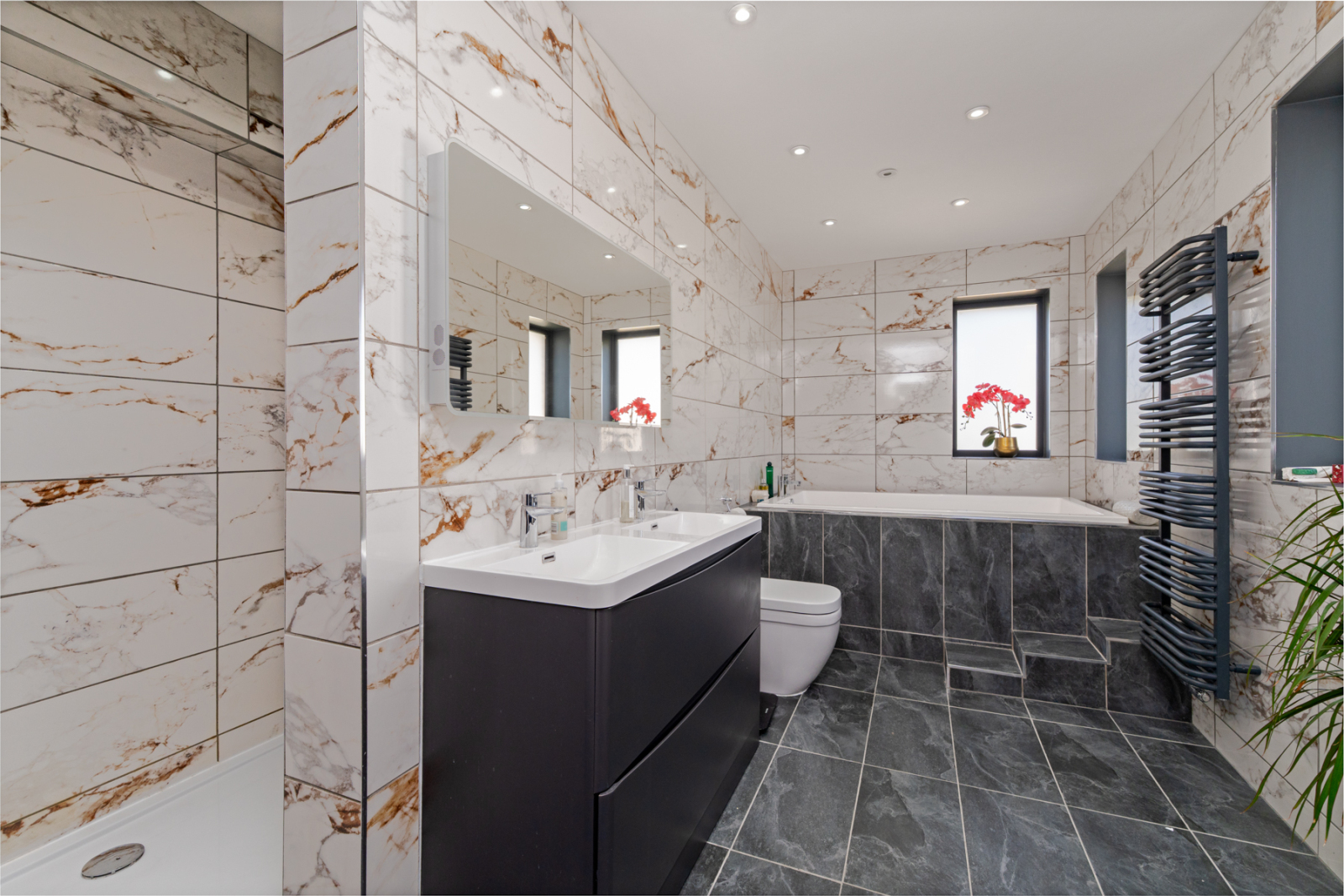 Upstairs, the main house offers five bedrooms, four of which are generous doubles. The principal suite benefits from a large picture window overlooking the rear garden as well as a spacious en-suite. Bedrooms two and three also enjoy their own en-suites, and there is a separate laundry room on this floor. A second staircase rises to a further large double bedroom with its own en-suite.