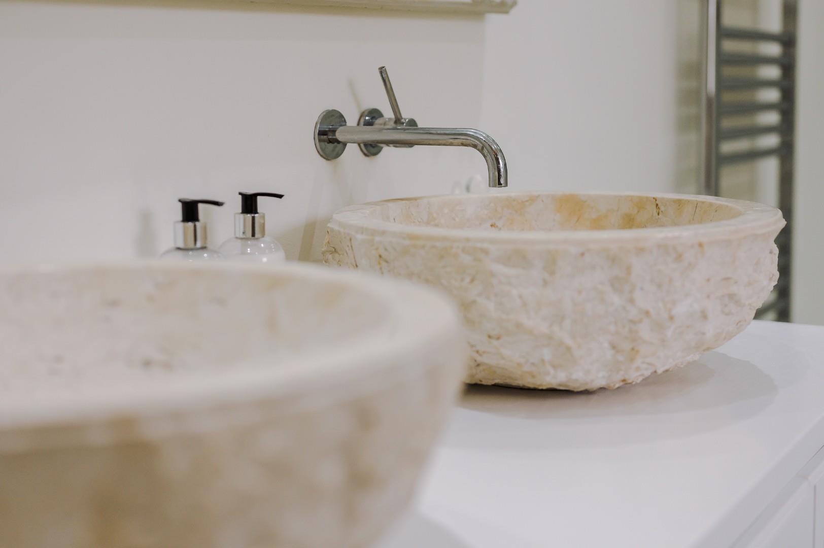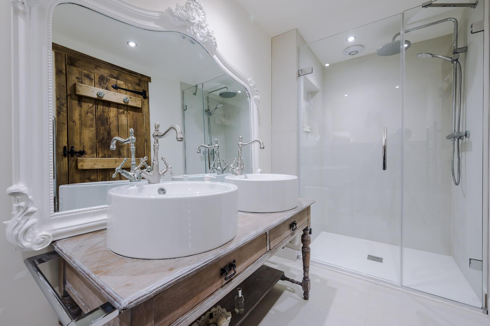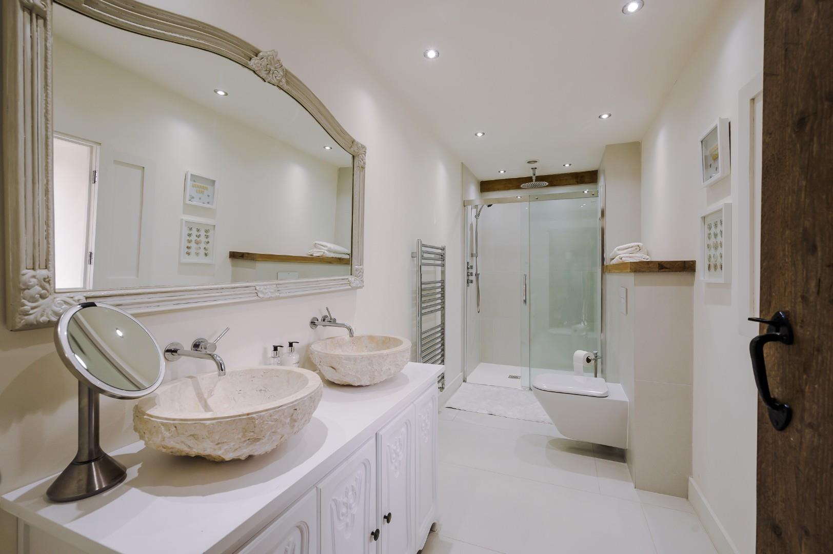 Leading into the en-suite are his and hers rough edged marble sinks adding drama to the silky interior of the bowl. The wide wooden oak floor is replaced with heated porcelain tiles leading you to the sliding door walk-in rain head shower. Pampering in style so you feel as fabulous as the house!