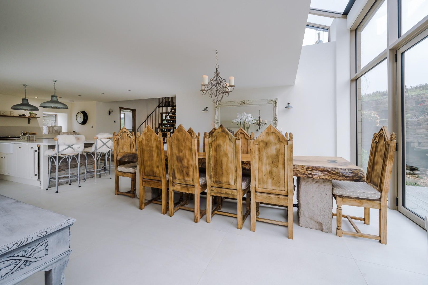 The snug is a daytime delight, grab a book and take in the views as you gather your thoughts. A stone pillar adds to your intrigue as you peep behind to see what the room opens out into. My goodness. The day quarters are open plan stretching out over one level downstairs, the connection flowing into the dining room and kitchen.