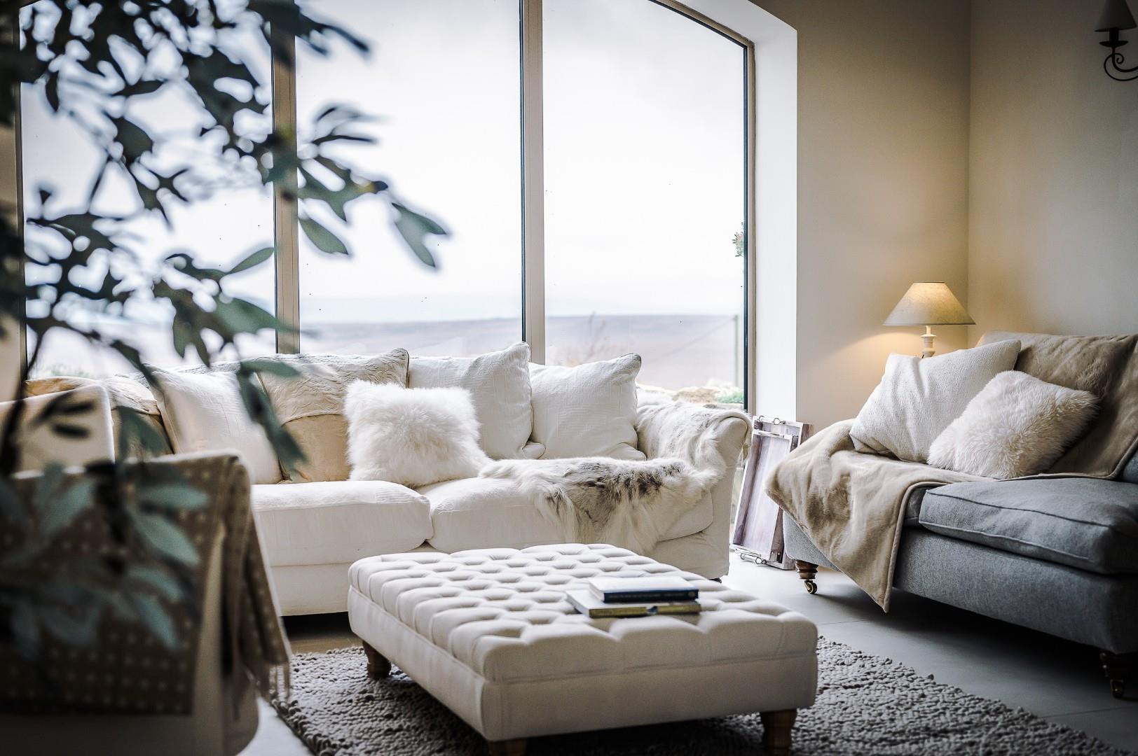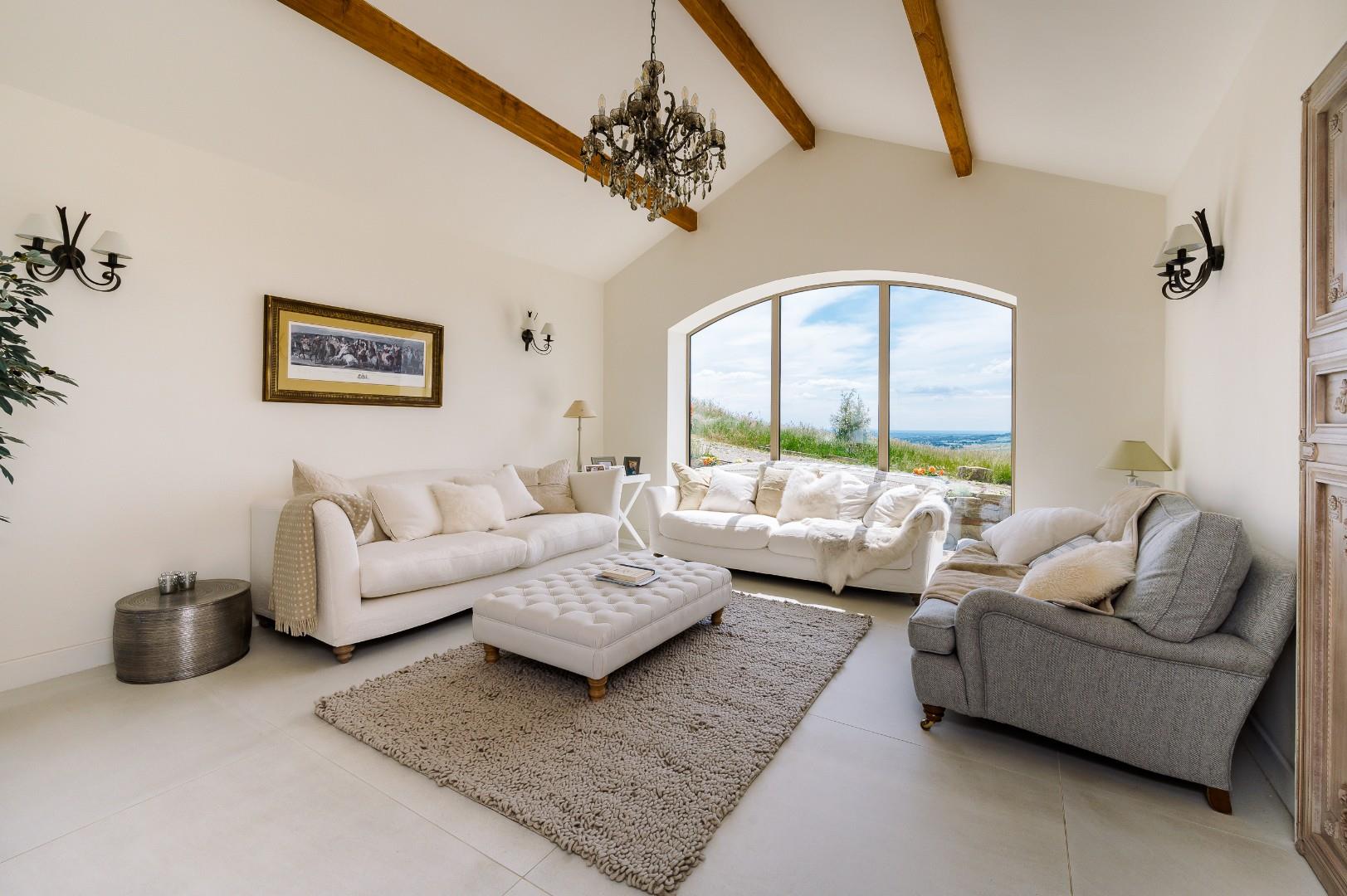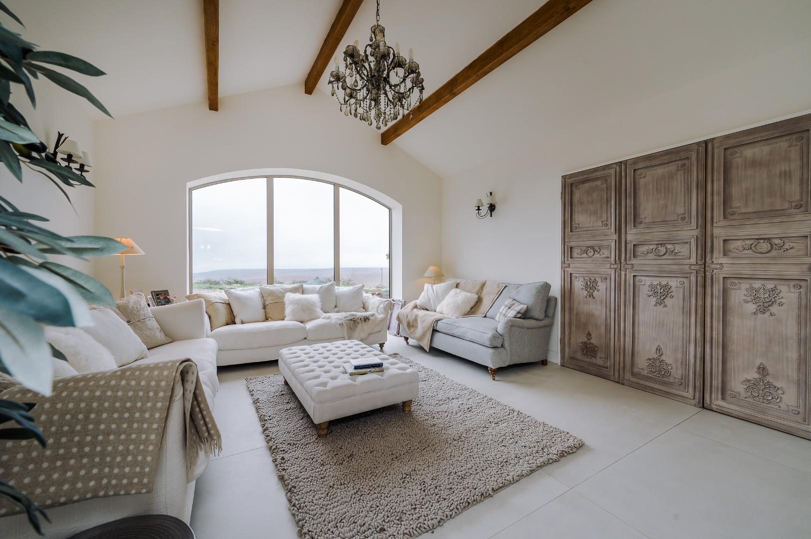 The Day Quarters - Enter through the double doors; the huge square heated porcelain tiles are beckoning for you to follow them through the lower floor. Pull across the ornate French shutters masking away the front doors, making an act of escapism as you close yourself off from the outside world. You enter into the snug, a lovely sneak peak of what is yet to come; the tall apex ceiling is dressed with wooden beams, the view out into the open countryside is framed by a trio of windows dressed in a specially sourced grey beige tone aluminium frame, a theme reflected throughout the home. The dcor is rather fabulous, an array of textures add drama within the calming neutral tones, think faux fur and shag pule rugs softening the white porcelain and pristine walls in which the chandeliers glisten against.