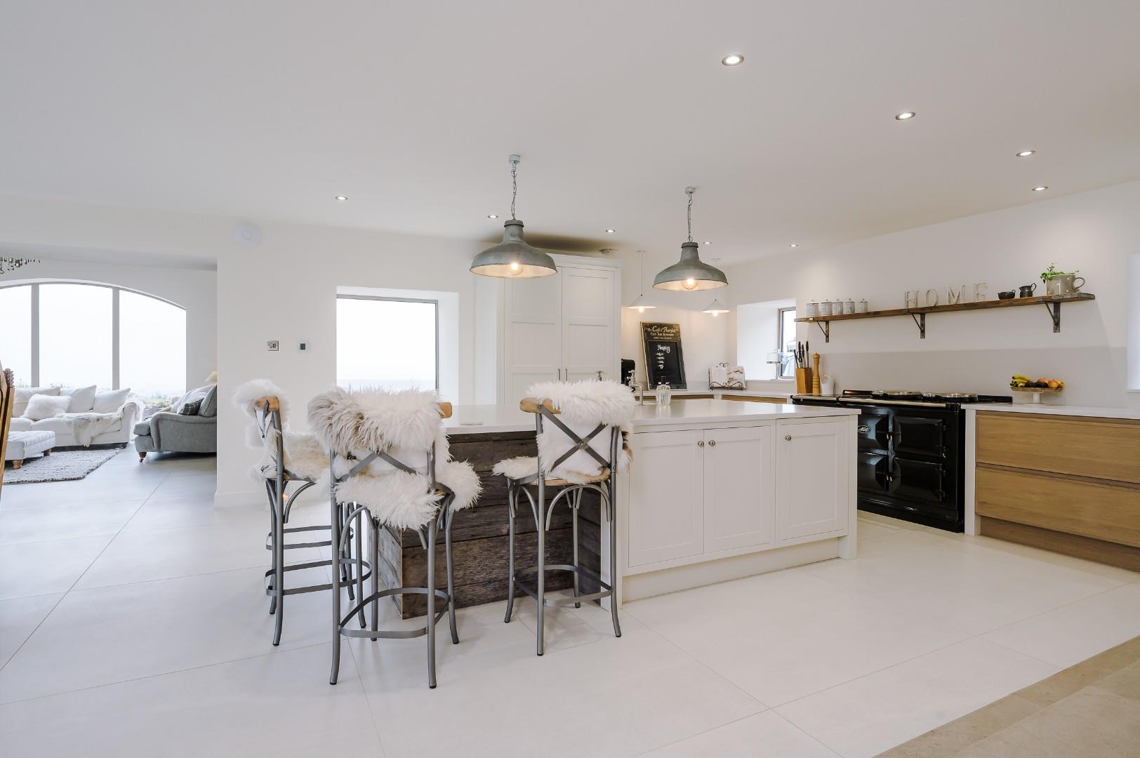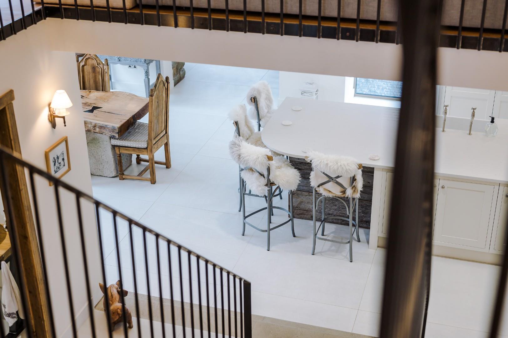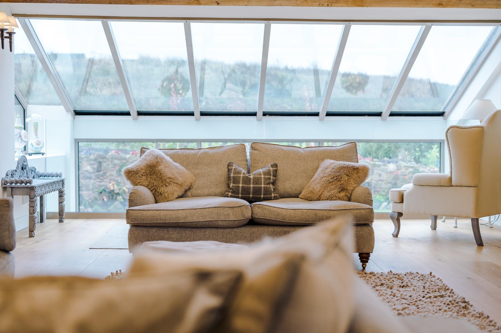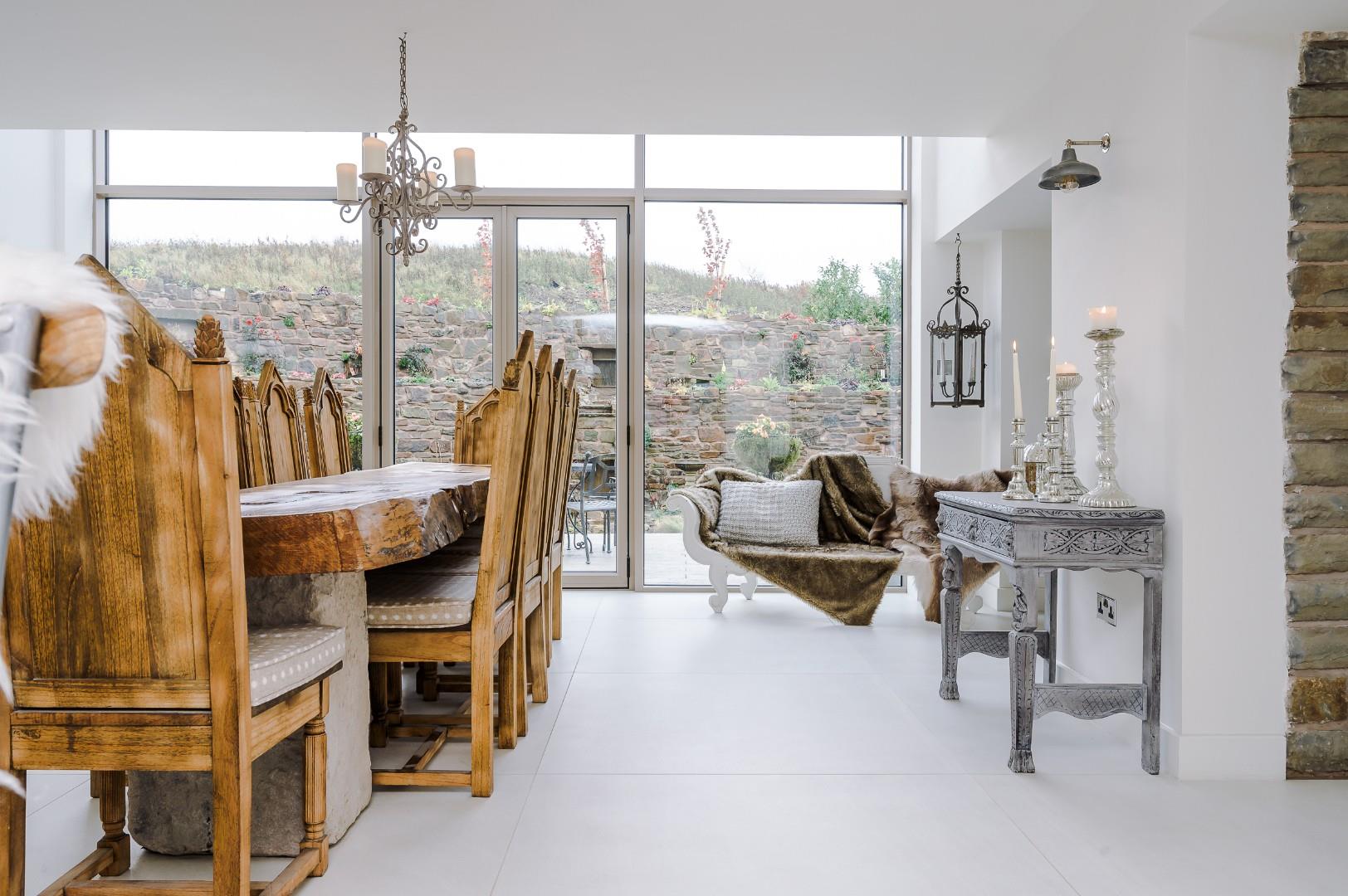 The Day Quarters - Enter through the double doors; the huge square heated porcelain tiles are beckoning for you to follow them through the lower floor. Pull across the ornate French shutters masking away the front doors, making an act of escapism as you close yourself off from the outside world. You enter into the snug, a lovely sneak peak of what is yet to come; the tall apex ceiling is dressed with wooden beams, the view out into the open countryside is framed by a trio of windows dressed in a specially sourced grey beige tone aluminium frame, a theme reflected throughout the home. The dcor is rather fabulous, an array of textures add drama within the calming neutral tones, think faux fur and shag pule rugs softening the white porcelain and pristine walls in which the chandeliers glisten against.