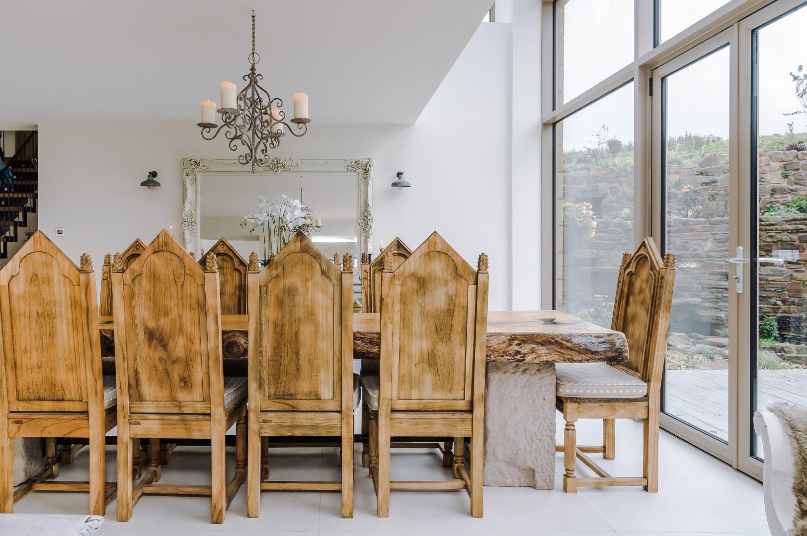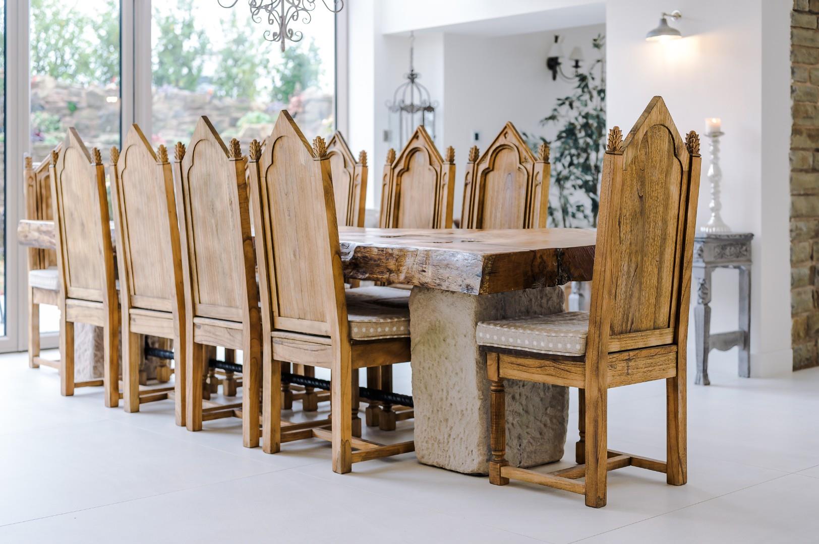 A Feast For The Imagination - The last supper wouldn't be too grand an event to take place at this dining setting. Made for the finest of evenings, feast your eyes upon the solid oak wood table top supported by huge stone slab legs. The grazing wouldn't be complete without the ornate carved wooden chairs to seat ten of your crme de la crme guests. All of which could be included with some separate negotiation! A pillar candle chandelier gives a further nod to history, adding a gentle glow above, whilst the floor to ceiling wall of glass at the end of the table introduces you to the garden, open up the doors and let the outside in.