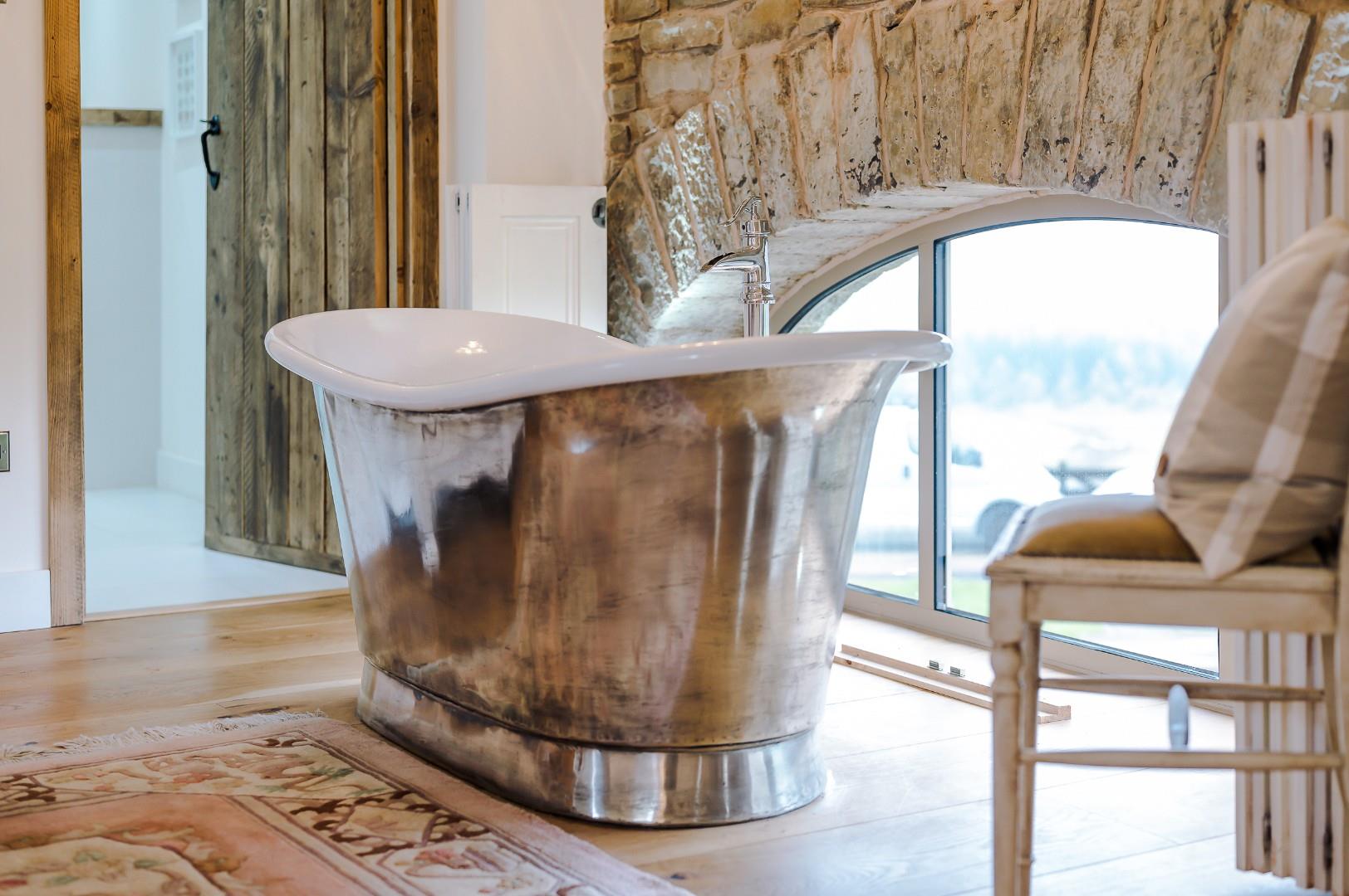 Fulfil Your Dreams - Your mind will be cleared of any woes as you clamber to your chamber at the top of the staircase, open up the double wooden cathedral doors and take in the space for your own gorgeous royal and romantic bed ahead, a beautiful painting above. Oh wait a minute, that's the picturesque view through your window! The suite is so dreamy; a Juliet balcony looks our over the rolling hills and garden beneath, fully glass constructed as to not take away from the delights it shows. A huge white chandelier adds and an elegant glow from the ceiling, highlighting the piece de resistance at the end of the room. Framed by an arced stone wall with a window set within, a freestanding silver iron 'William Holland' roll top bathtub makes its presence known.