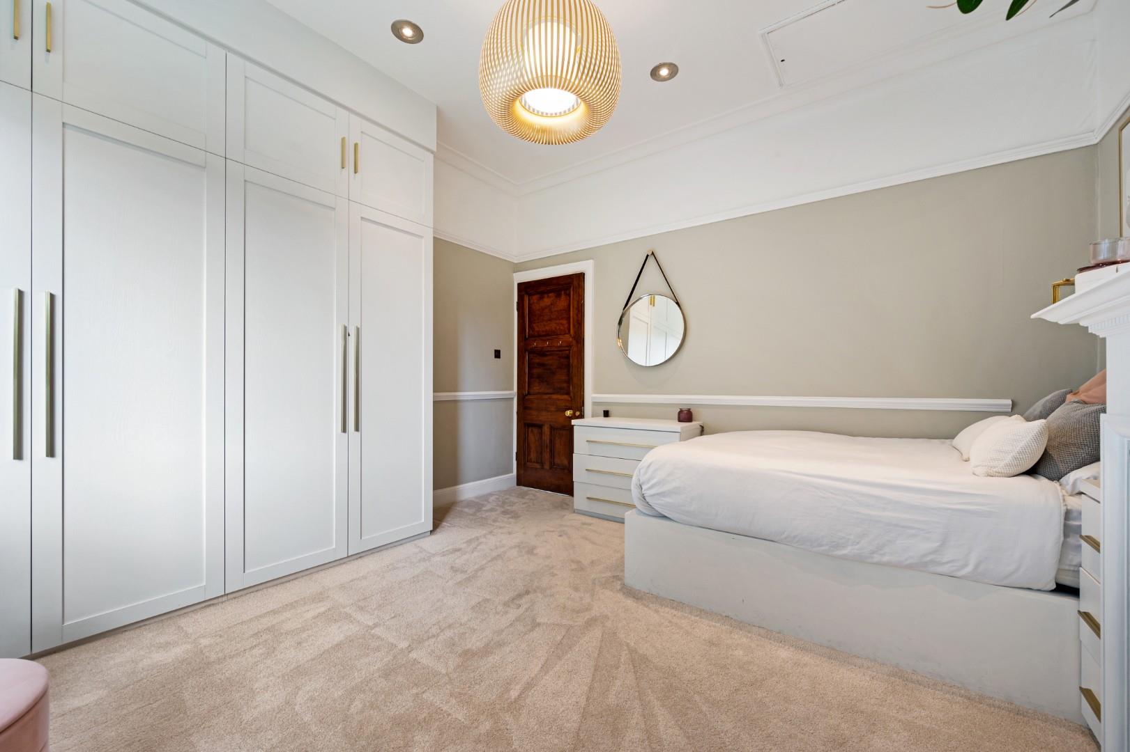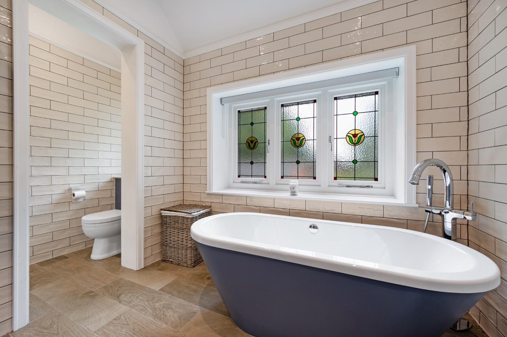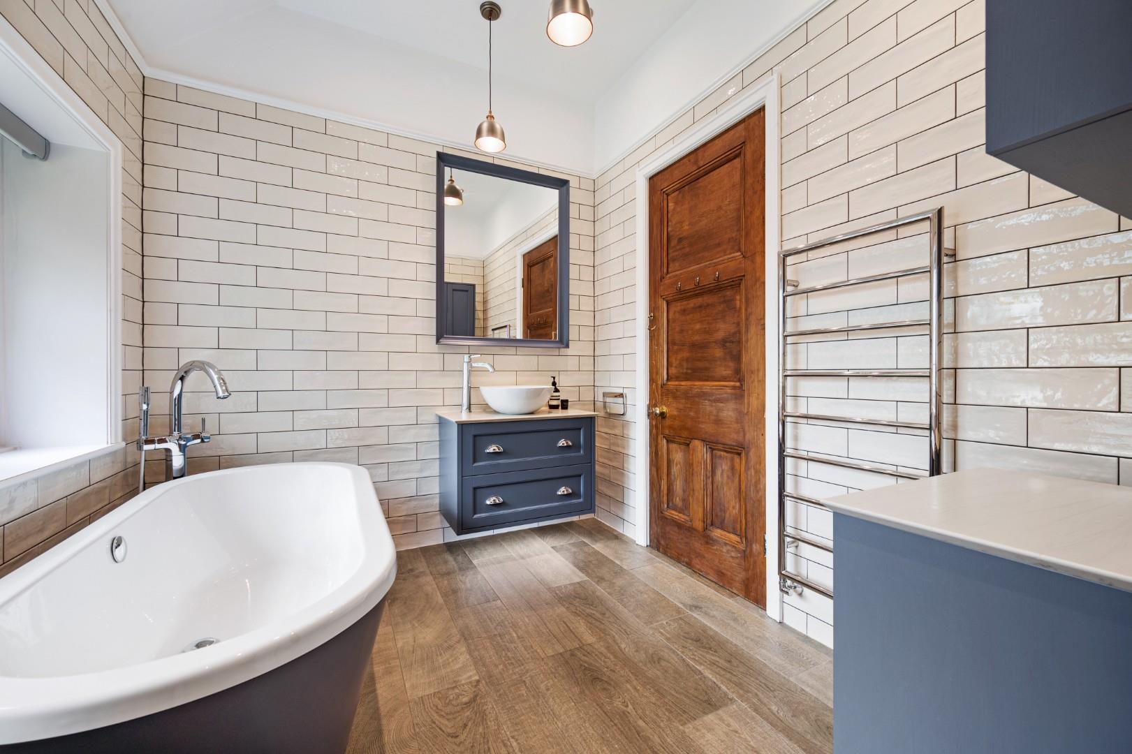 The master bedroom boasts a generous footprint with a spacious dressing room and walk-in wardrobe, in addition to a three-piece shower en-suite. Each of the three other bedrooms are also great sized doubles, and the family bathroom features a four-piece suite including a freestanding tub, walk-in shower, WC and wash basin with integral storage. Trendy metro tiles line the walls in the bathroom and complement the modern LVT floor, while the stained and leaded window gives a nod to the property's heritage.