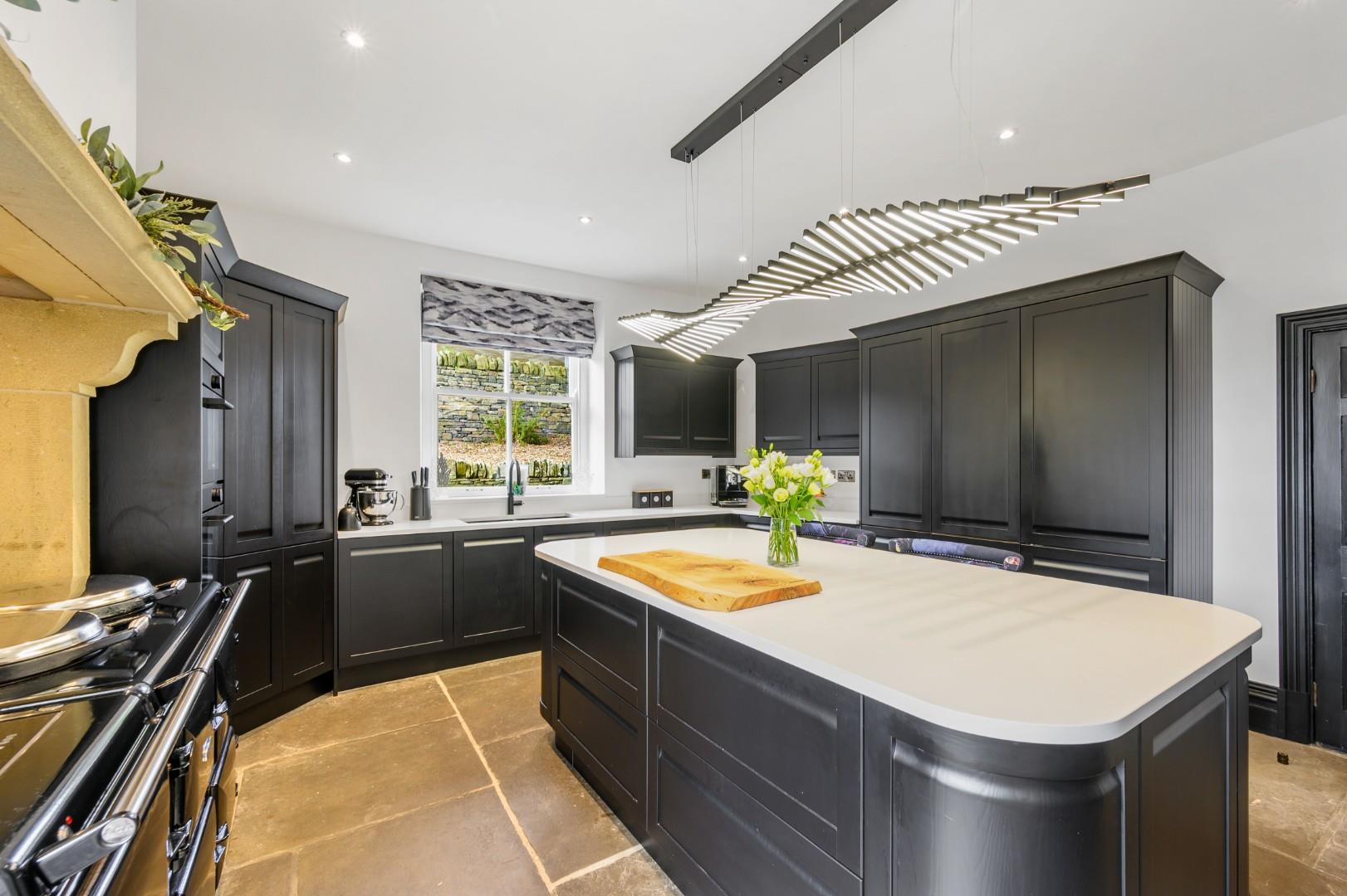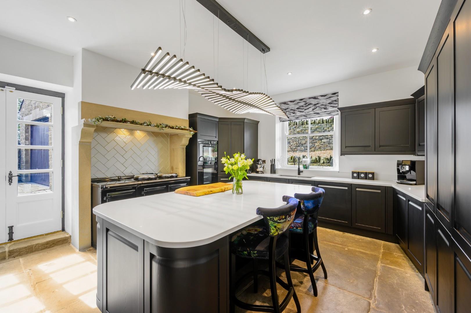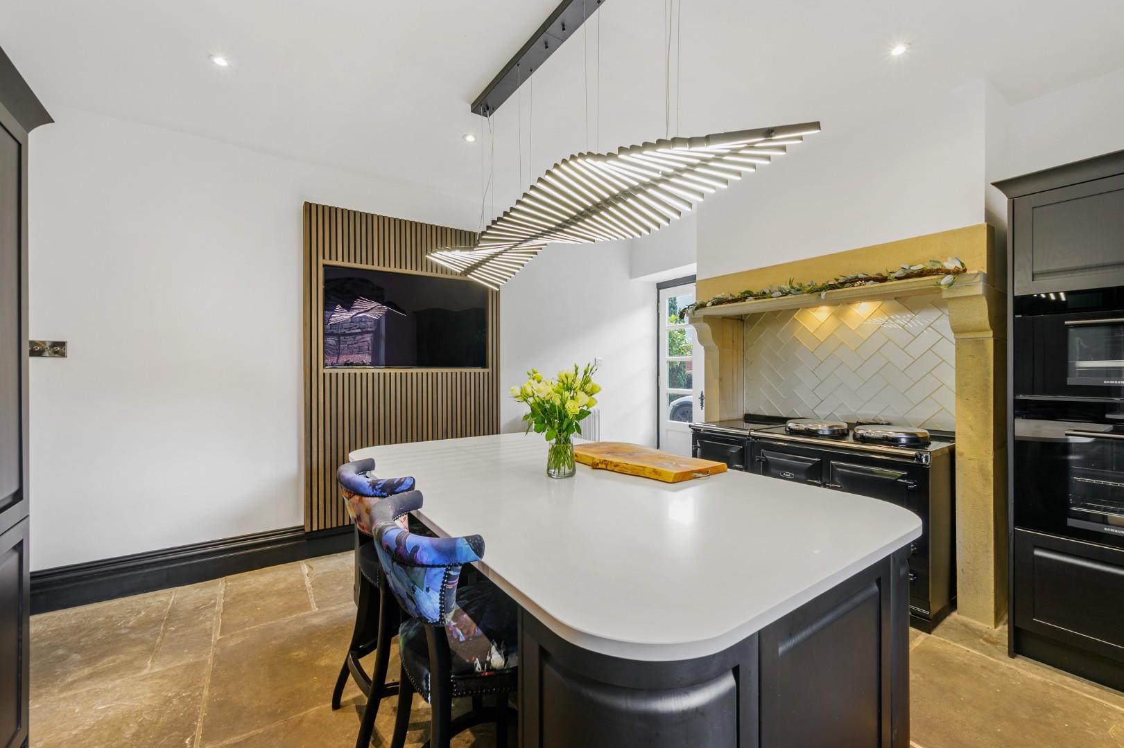 To the rear of the home is a standout kitchen which again is a fantastic example of contemporary style blending seamlessly with period character. A modern electric Aga sits within an ornate stone surround, and the black, hand painted hardwood kitchen cabinetry continues the modern feel while complementing the fresh white granite worktop and central island, all of which is lit up by the brilliant contemporary feature lighting. The island makes this space both practical and attractive for everyday life and socialising with family and friends. Integrated appliances include a Samsung oven, steam oven, Bosch dishwasher and fridge, plus a Quooker tap with sparkling, chilled, and instant boil functions. From the kitchen, glass doors open onto a side patio, allowing for that sought after indoor-outdoor living on hot summer days, and particularly suitable for al fresco dining.