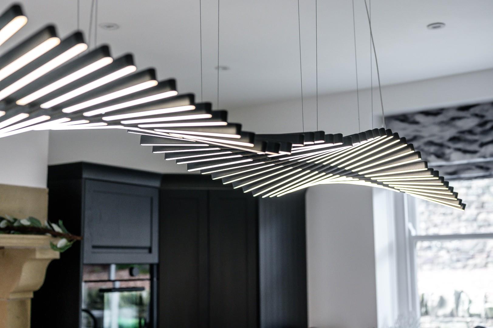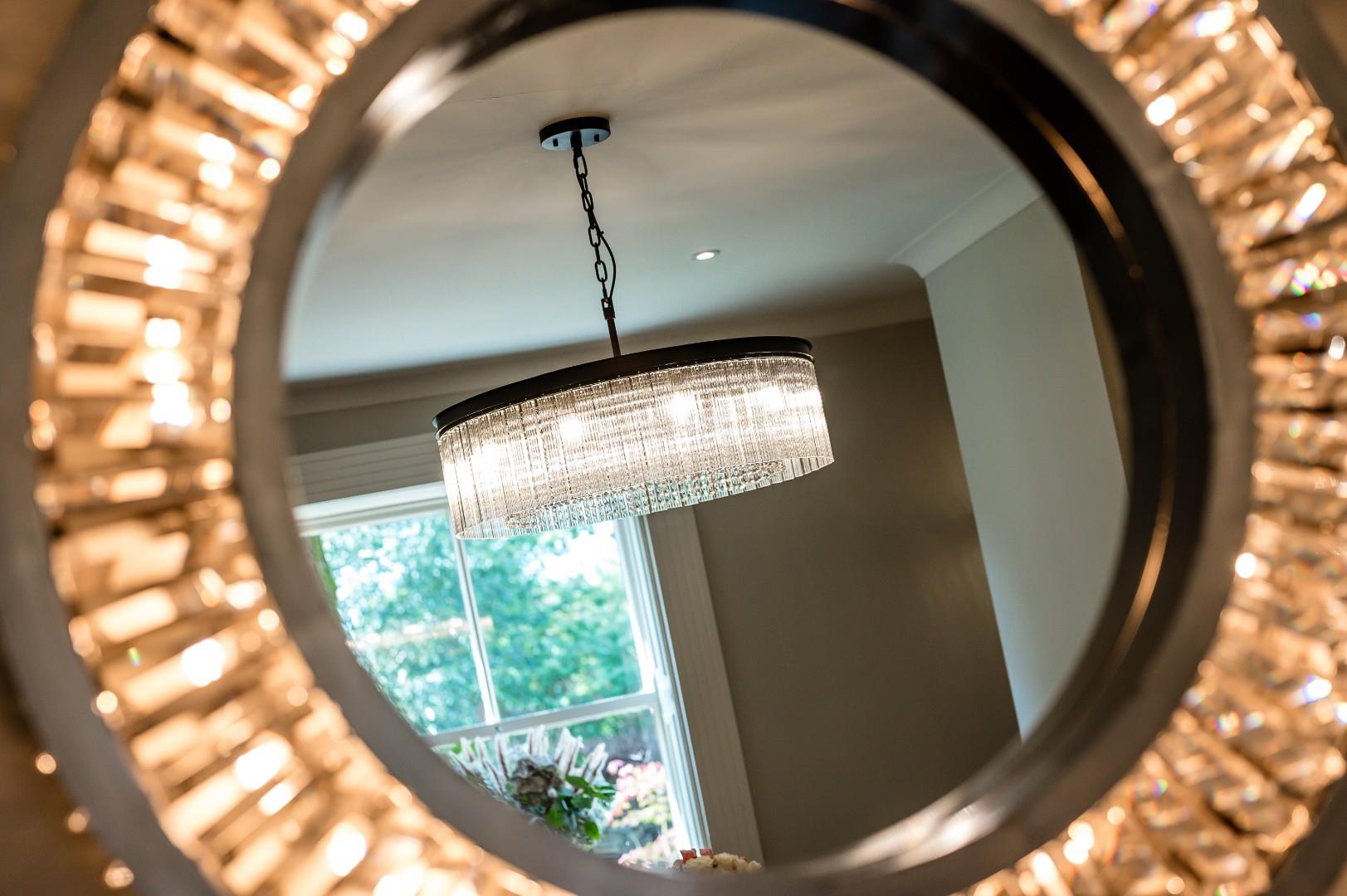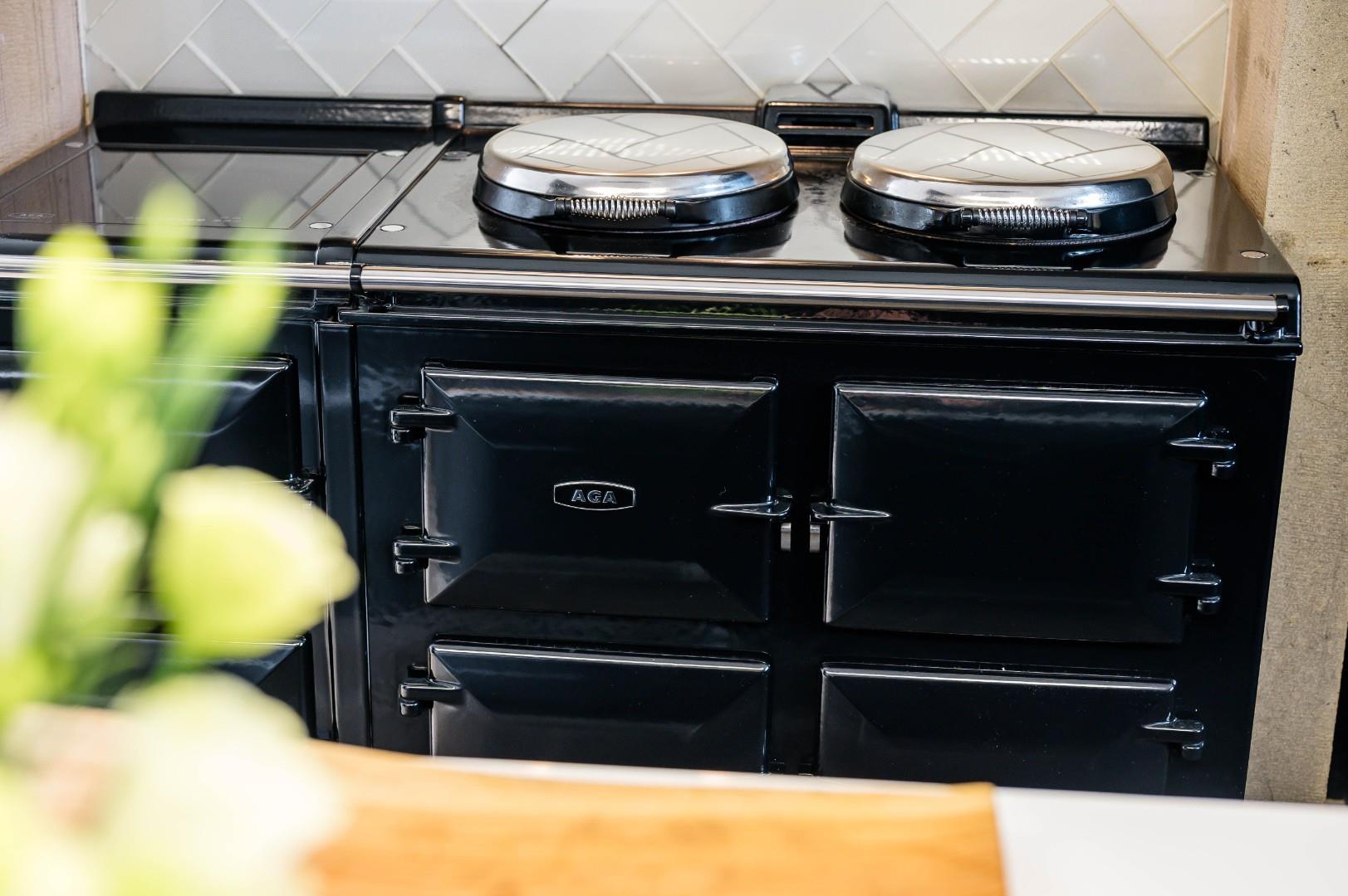 To the rear of the home is a standout kitchen which again is a fantastic example of contemporary style blending seamlessly with period character. A modern electric Aga sits within an ornate stone surround, and the black, hand painted hardwood kitchen cabinetry continues the modern feel while complementing the fresh white granite worktop and central island, all of which is lit up by the brilliant contemporary feature lighting. The island makes this space both practical and attractive for everyday life and socialising with family and friends. Integrated appliances include a Samsung oven, steam oven, Bosch dishwasher and fridge, plus a Quooker tap with sparkling, chilled, and instant boil functions. From the kitchen, glass doors open onto a side patio, allowing for that sought after indoor-outdoor living on hot summer days, and particularly suitable for al fresco dining.