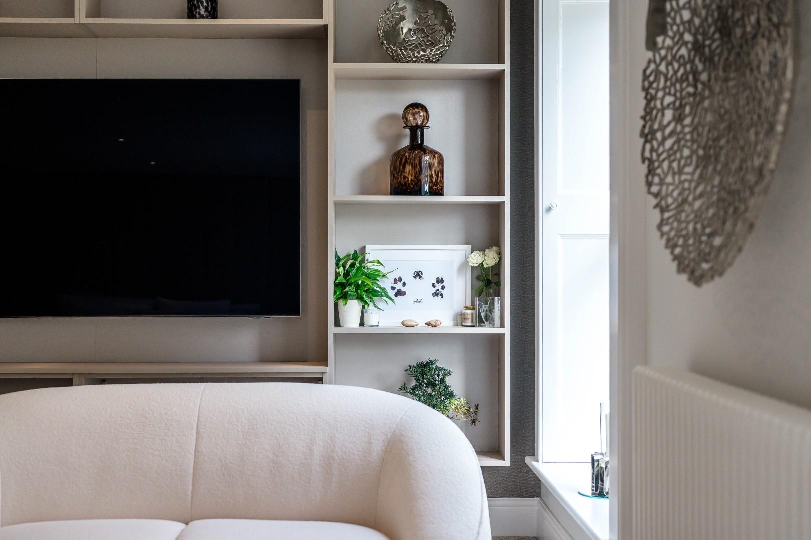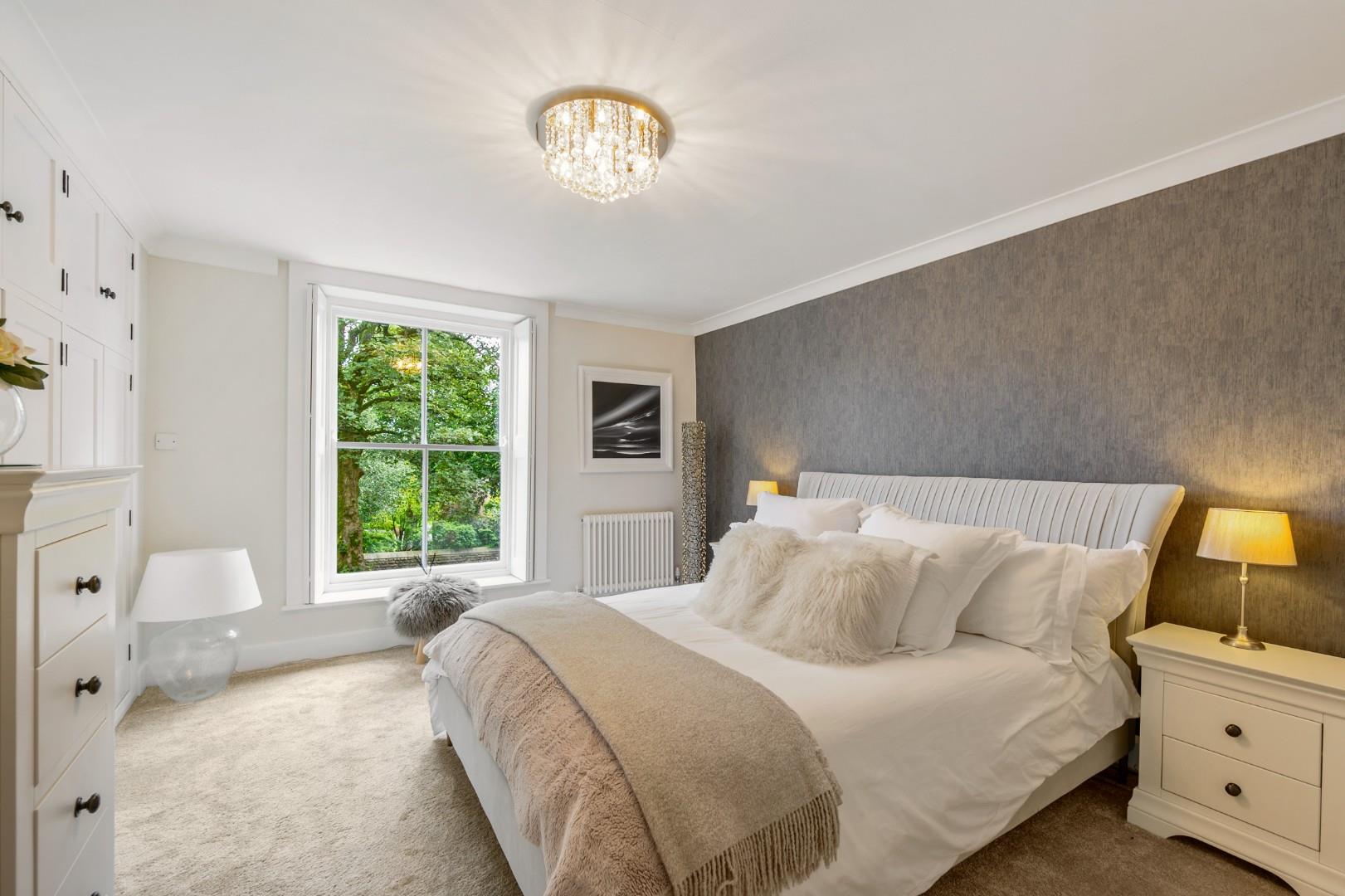 The reception room to the left of the hallway, currently the lounge, features a traditional chimney breast with a stylish stone fireplace and a modern inset log burner. More traditional features here include beautiful hardwood sash windows and window shutters, in addition to coving and cornicing, all of which gives a nod to the period heritage while clearly being of high-quality, contemporary standards. The fact there are two spacious traditional reception rooms offers versatility in usage too.