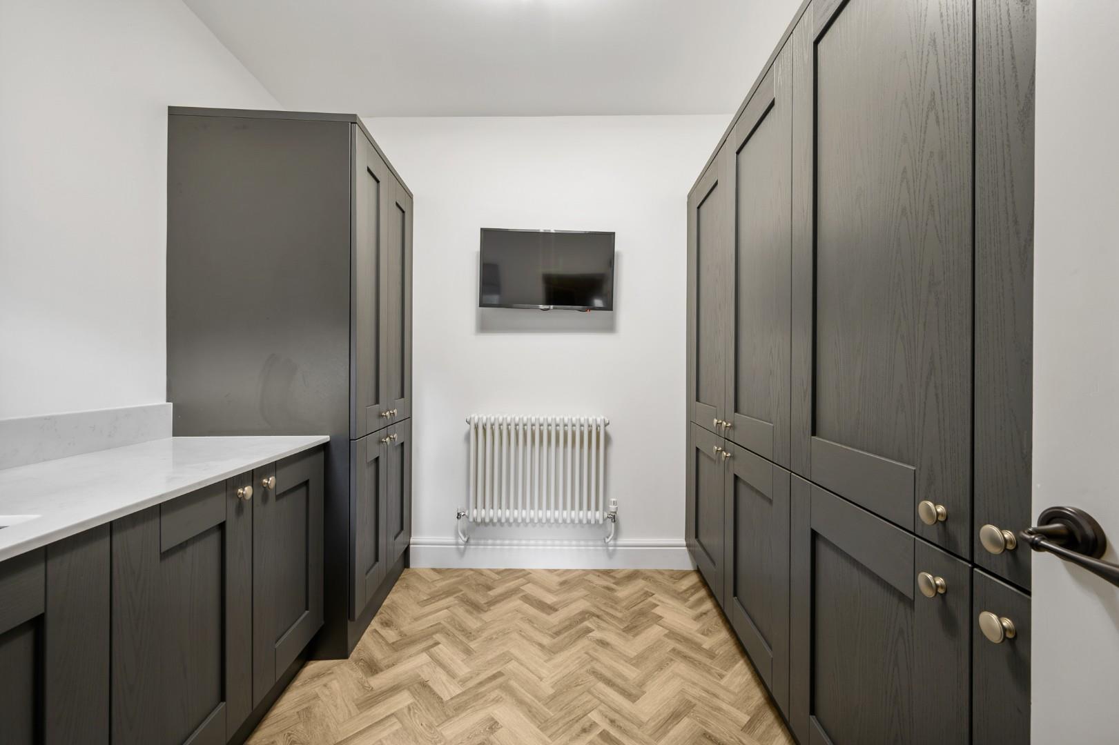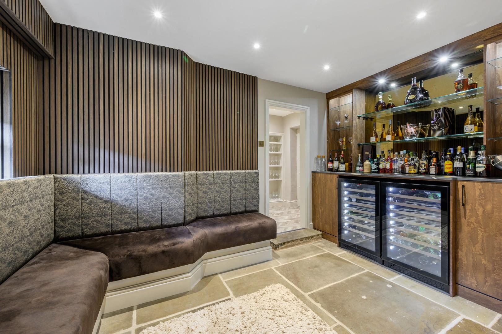 Entertaining & Practicality - Adjacent to the kitchen at the rear of the home is the bar, and its no surprise the trendy vibes continue here - with fitted banquette seating, stylish wood cladding, a ceramic tile bar with an antique mirror splashback, and fully equipped bar shelving and two PeVino wine fridges, you could well be in one of Manchester's lovely bars, all from the comfort of your own home. There is even a large wine cellar to boot, perfect for keeping an extensive collection of your favourite bottles! Alternatively, the cellar could suit other uses depending on your preference.