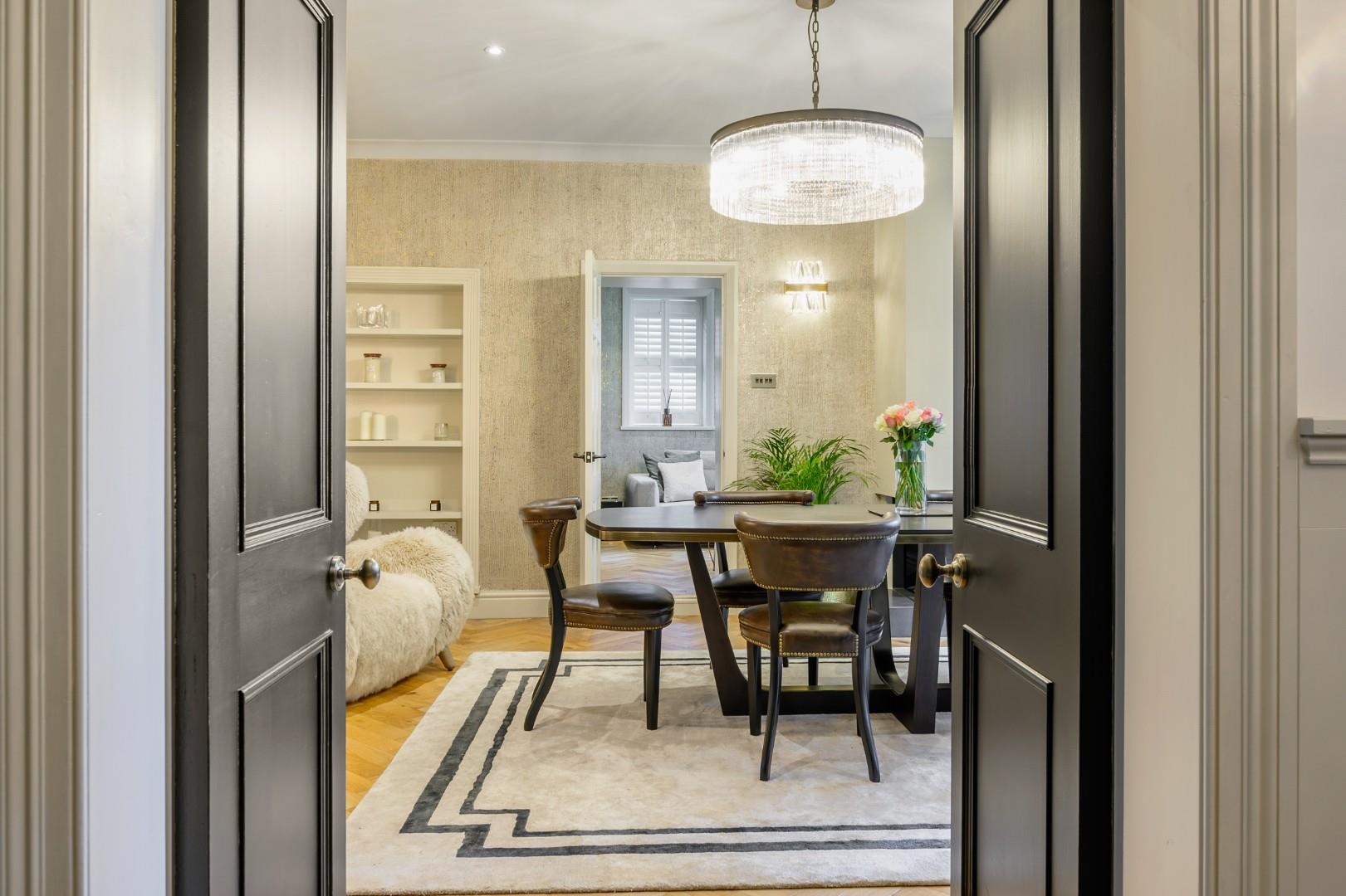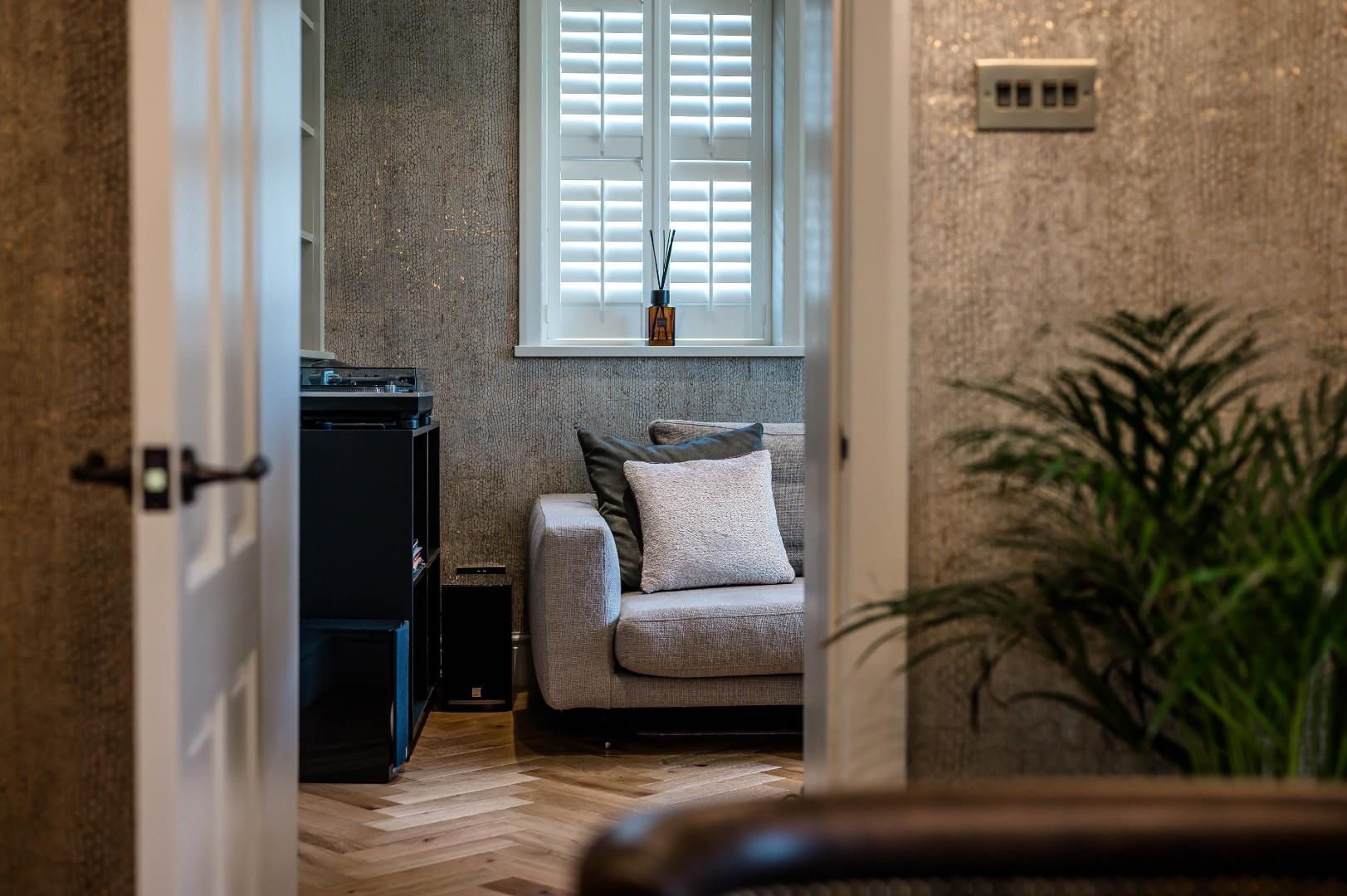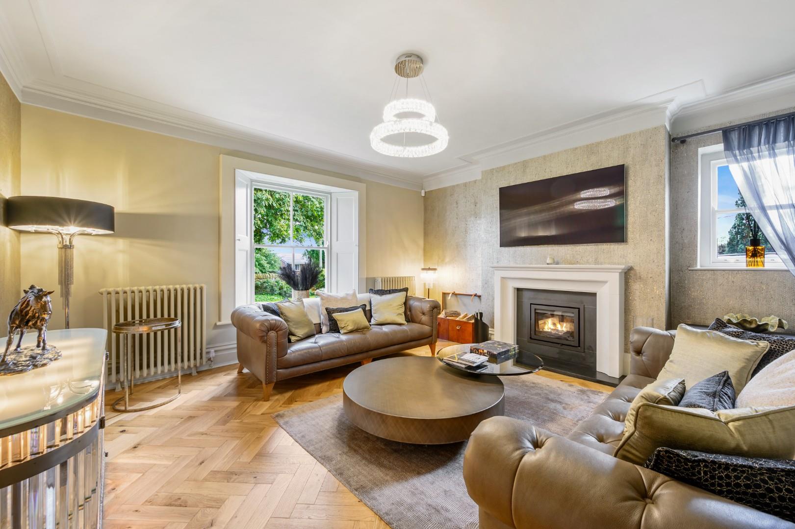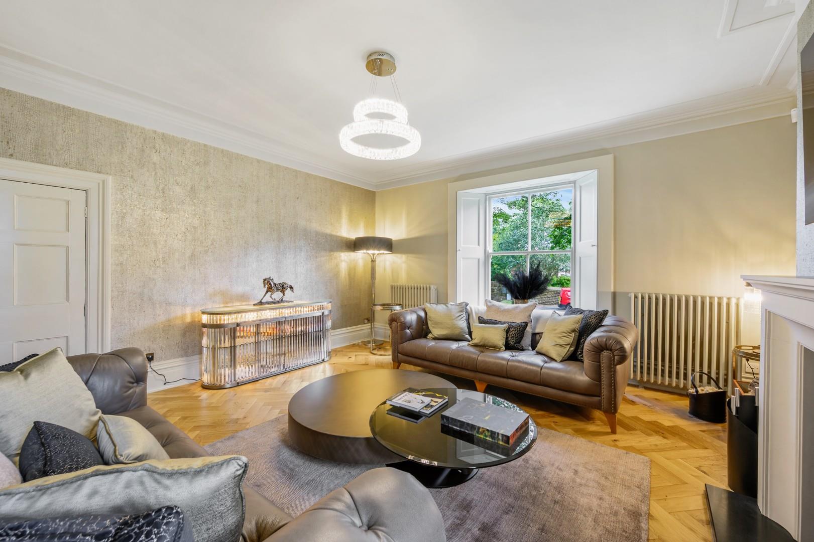 Traditional Reception Rooms - In the two traditional reception rooms situated at the front of the home, a gorgeous solid oak parquet floor provides a classic design and a first glimpse of the high-quality finish, and it complements the more contemporary look of the soft gold Omexco wallpaper - a premium Belgian brand which specialises in the highest quality wall coverings used in luxury properties all over the world.