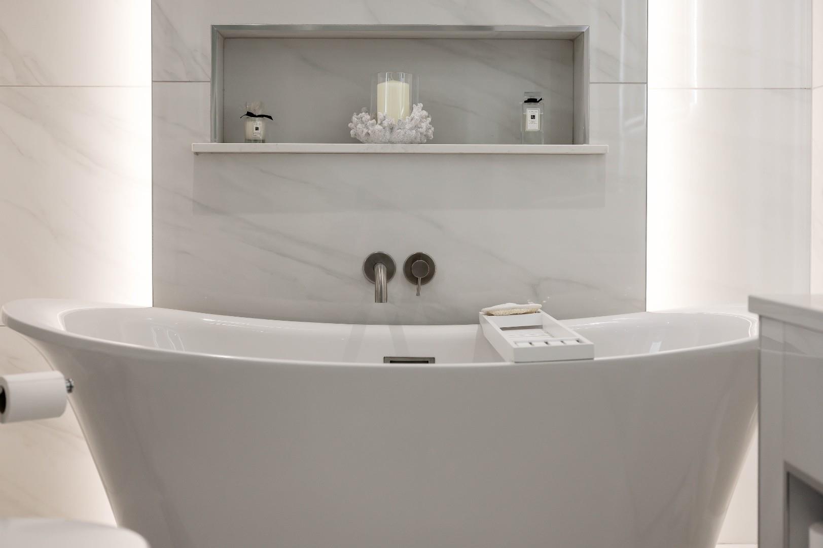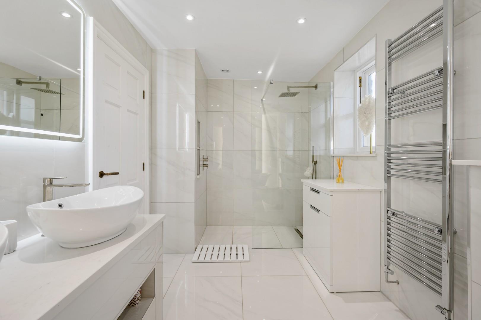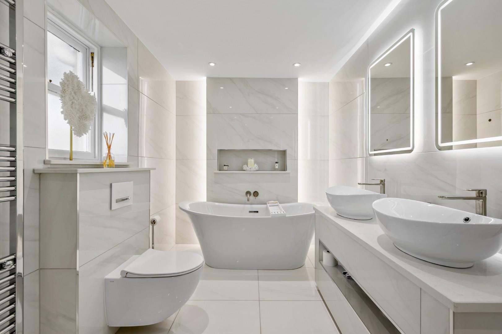 The family bathroom on the other side of the landing benefits from a generous size and four-piece suite too, with a large rainfall shower and glass faade, freestanding rolltop bathtub, wash basin and WC.