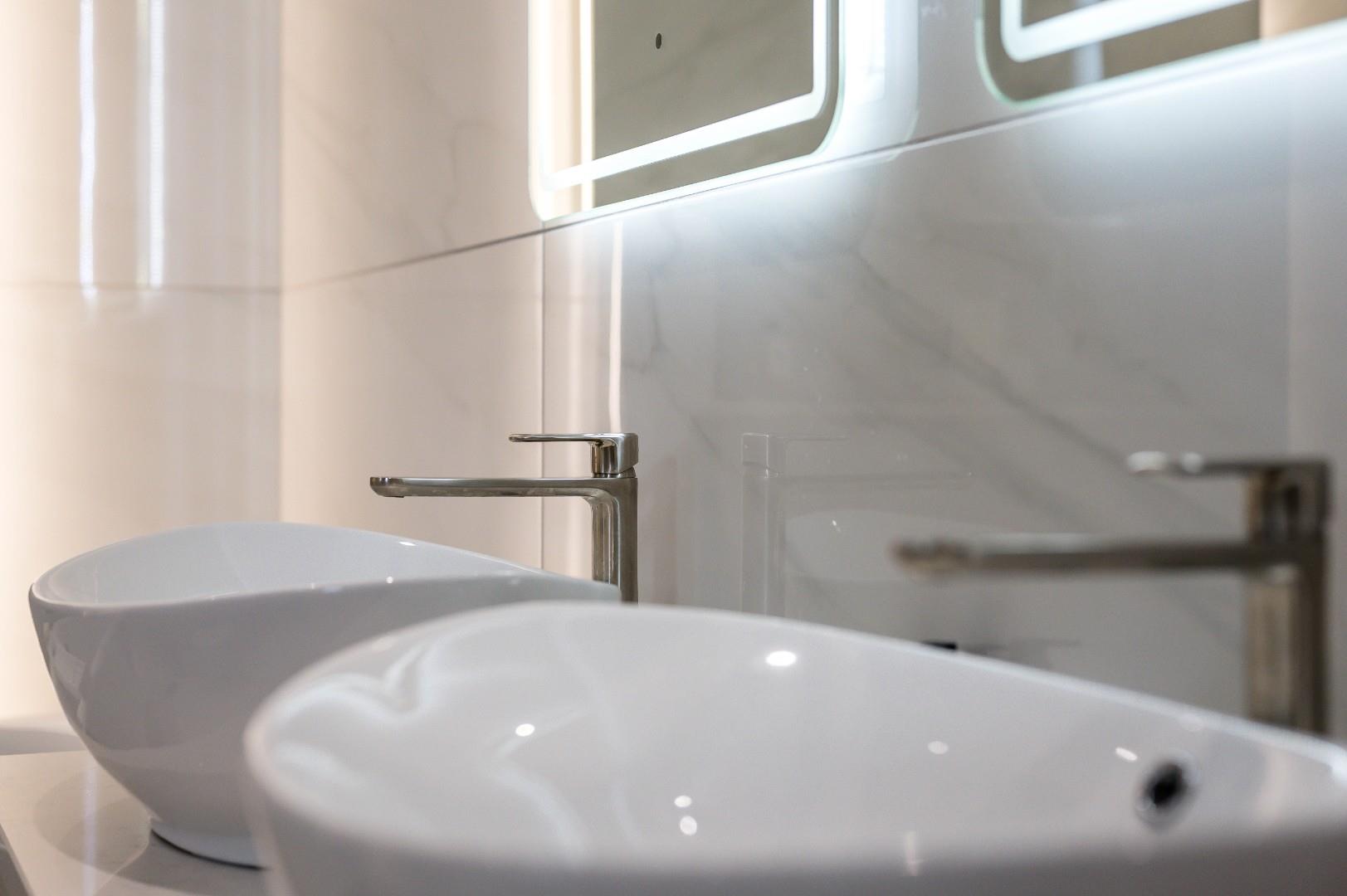 Bedrooms & Bathrooms - The master bedroom occupies a large portion of the first floor due to its extensive features and grand size. The bedroom aspect comes complete with its own lounge and media wall, and the opulent finishes continue, with a cushioned feature wall on which the bed is positioned, plus a spacious dressing room, and large his and hers en-suite with a freestanding bathtub, walk in shower, his and hers basins, and WC, all of which is finished with beautiful white marbled tiling.