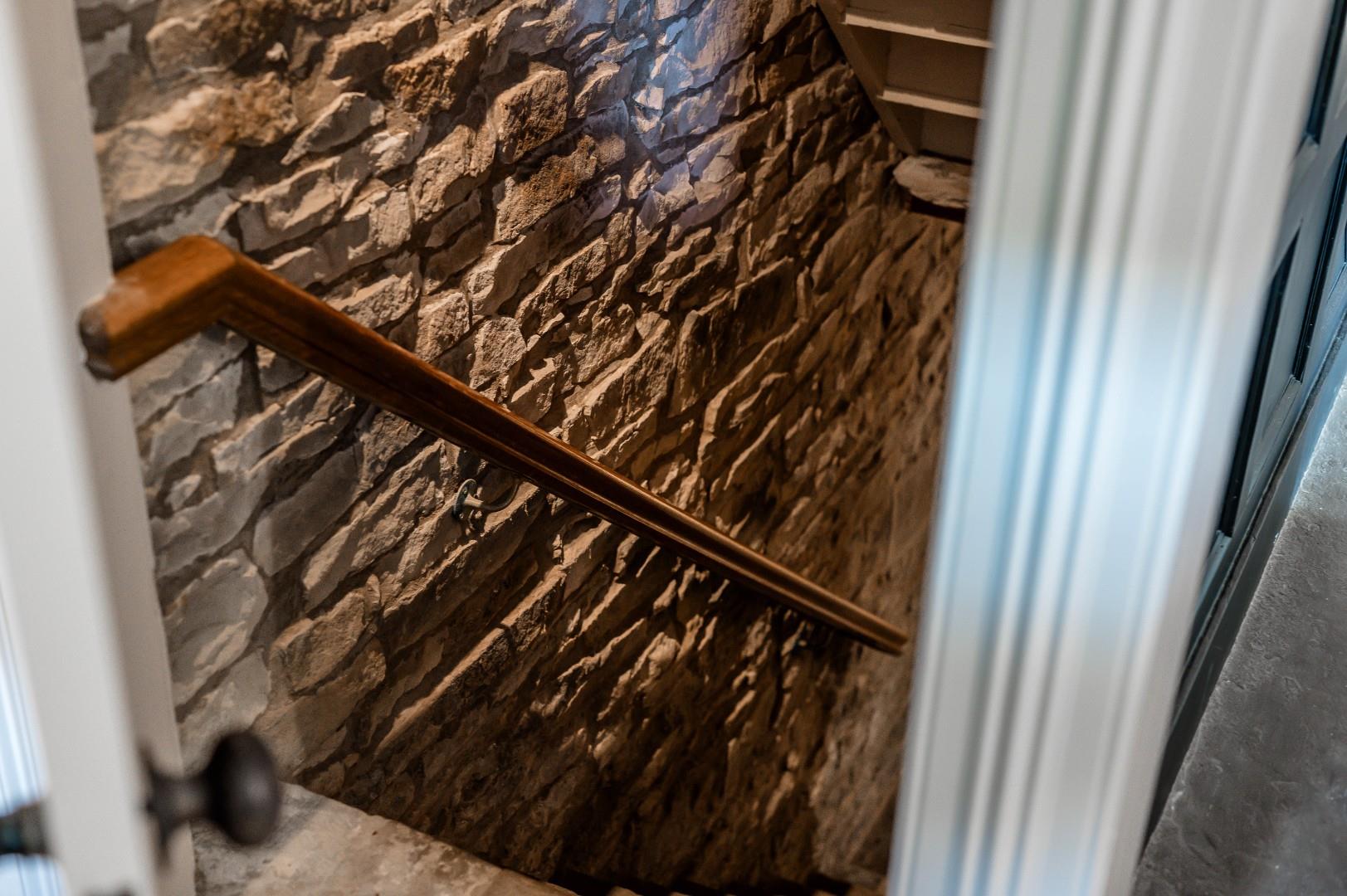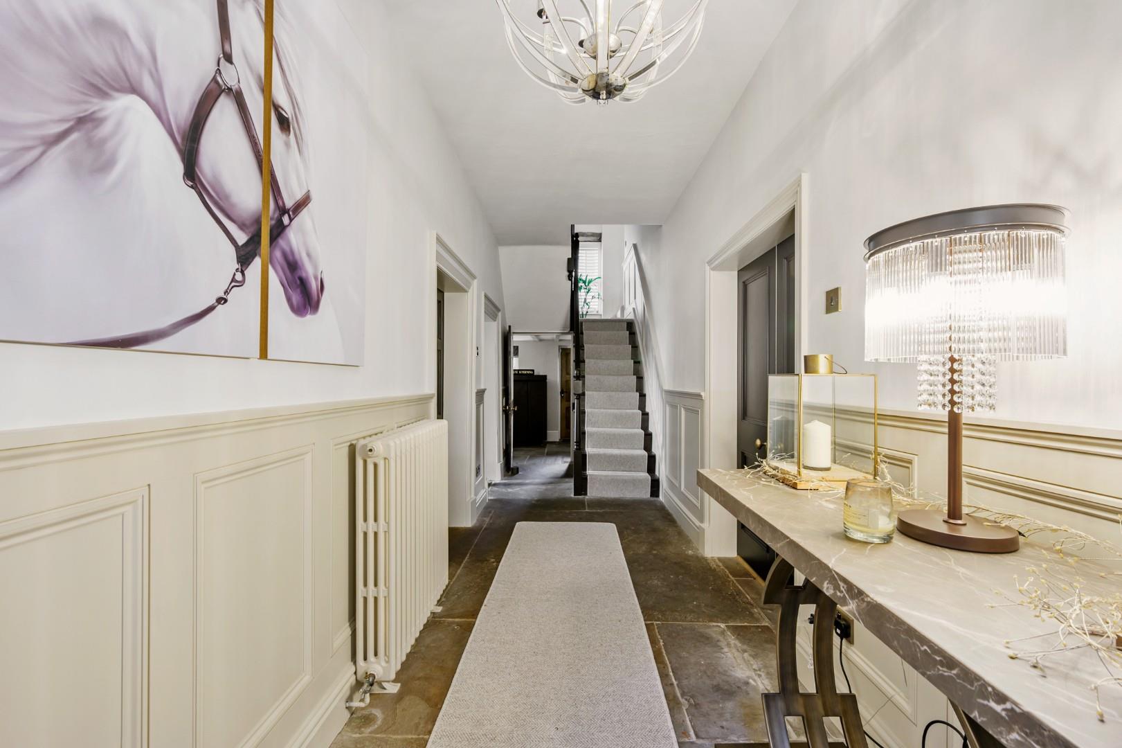 A Standout Hallway & Kitchen - The central hallway is itself an impressive space - the exposed stone floor and original stone lintel above the feature front door offers a rustic touch, the original hardwood doors and handles have been restored to impressive condition and add to the classic design, and the modern wall panelling brings a tasteful contrast and refined, contemporary vibe, inviting you upstairs via the trendy matt black staircase and carpet runner... But let's finish downstairs first!