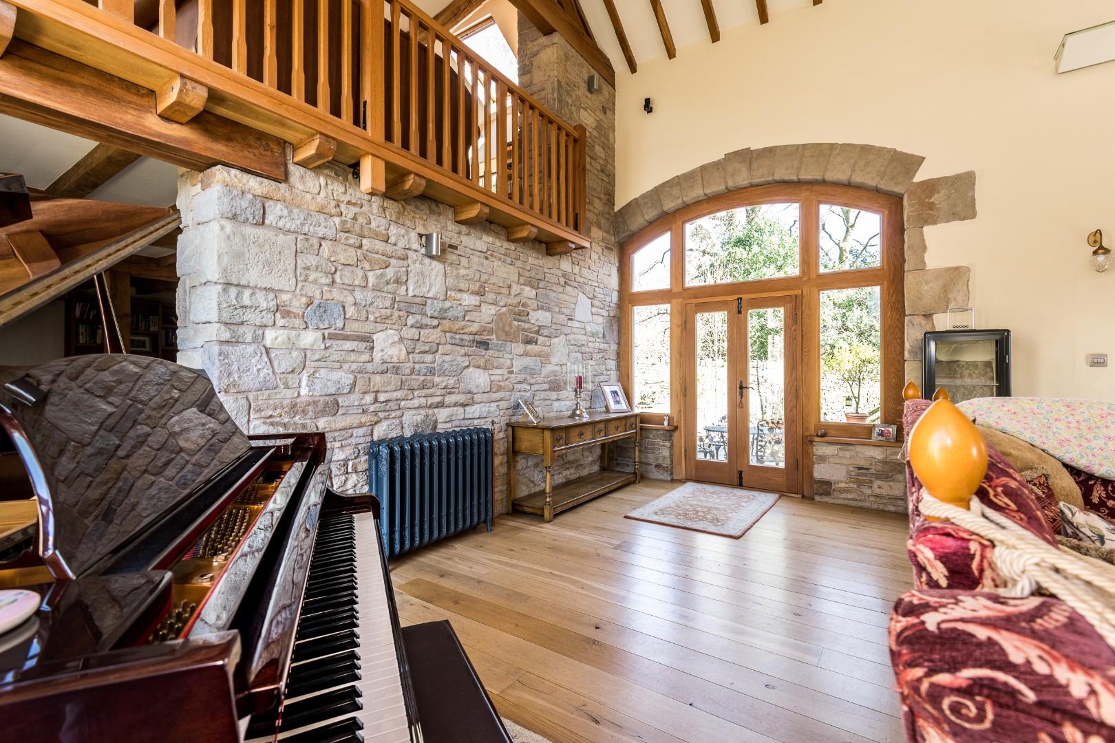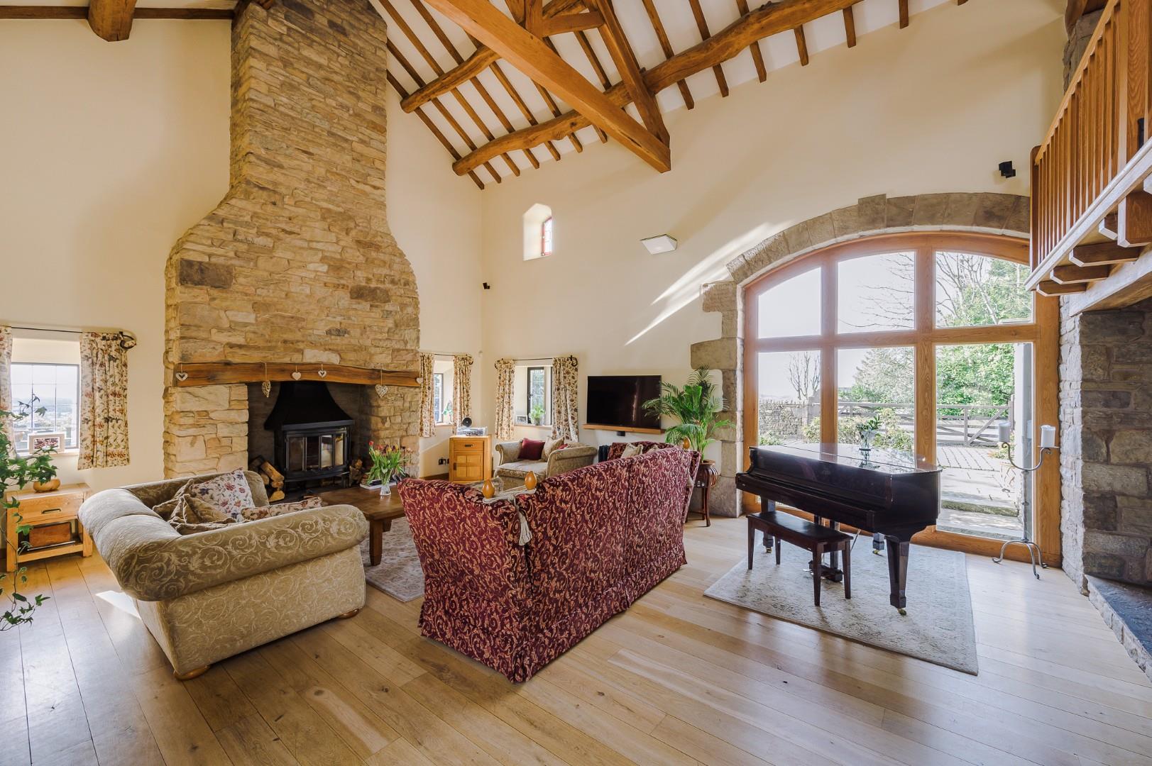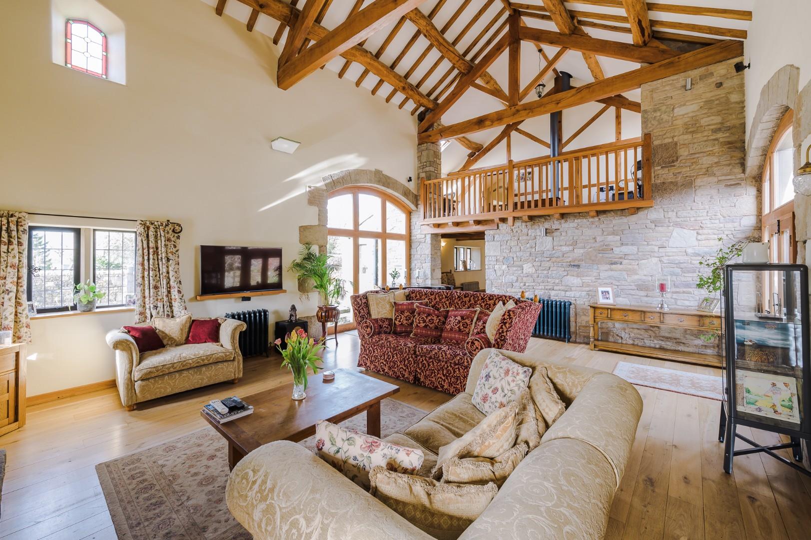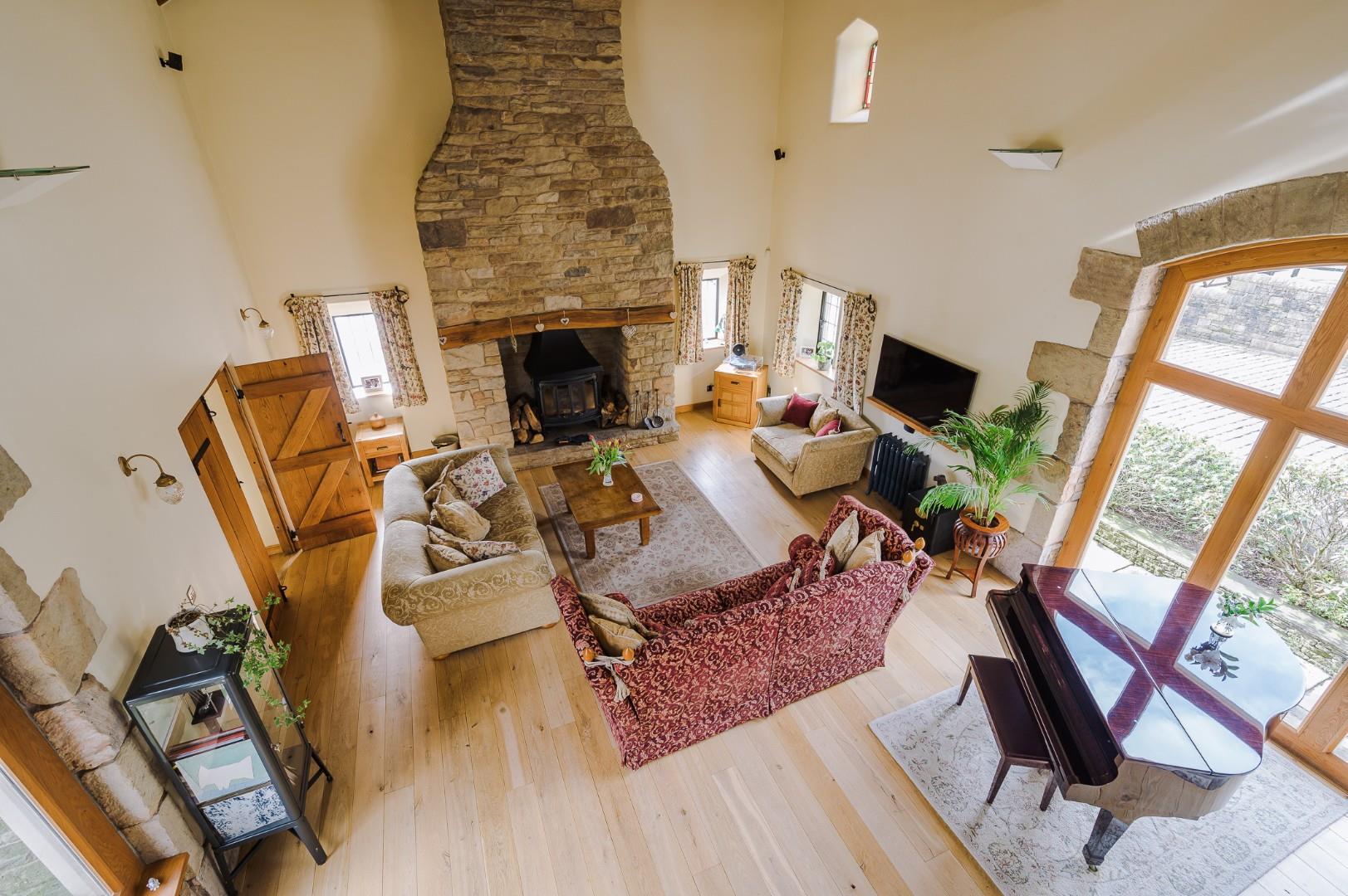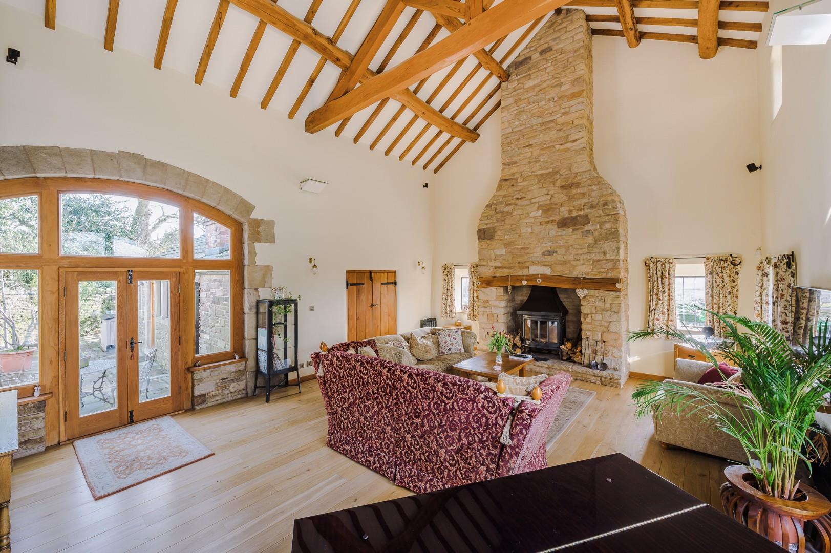 The formal lounge beckons you in from the entrance hall, but what feature to take in first?! Two adjacent huge arched windows mirror each other dressing both edges of the room, flooding in light and framing the outdoors like a picture. Double doors open up onto the courtyard allowing a gentle breeze to lift the home on a summers day. and for those cosy winter nights the log burner flickers away taking centre stage, set within a huge stone fireplace which reaches right up to the tip of the vaulted ceiling. This is a room made for entertaining, in fact, the whole house is. you can guarantee it will be hard to get rid of your guests at the end of the day!
