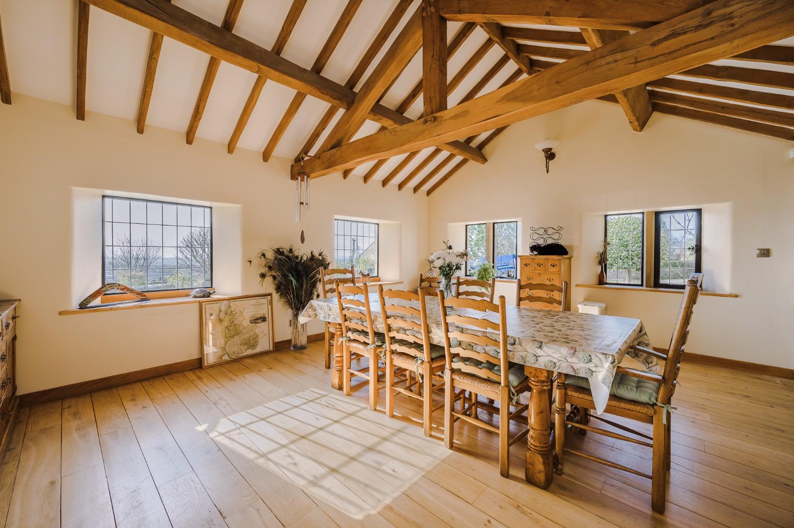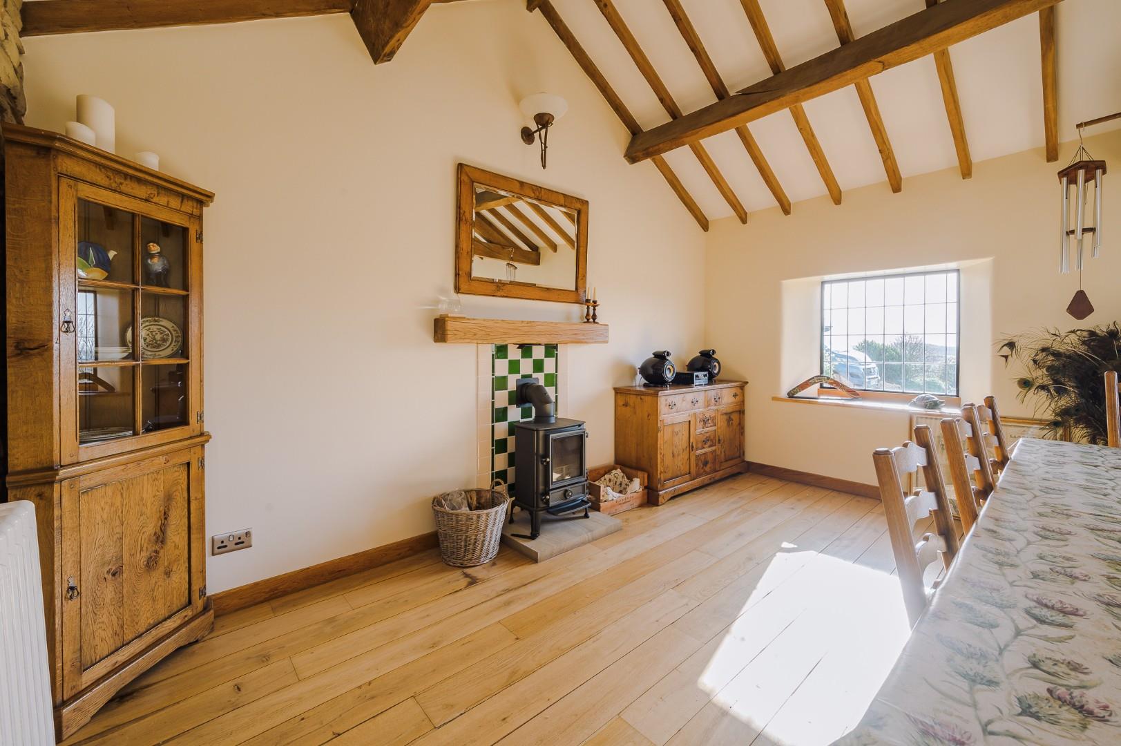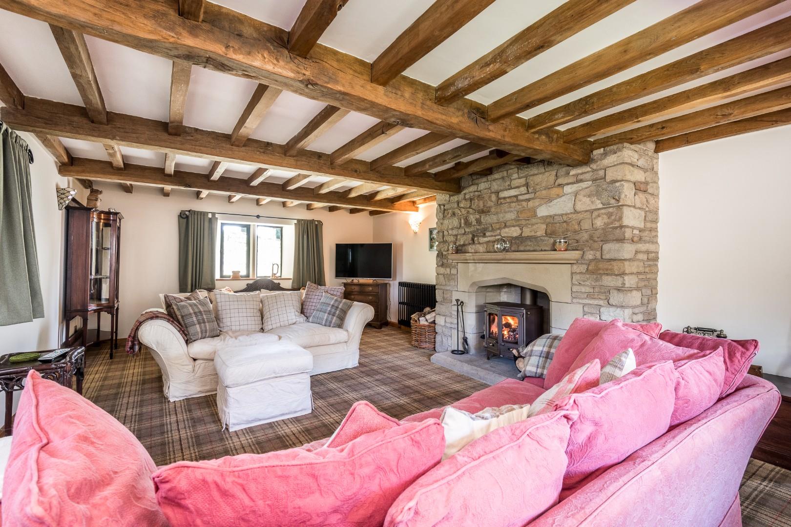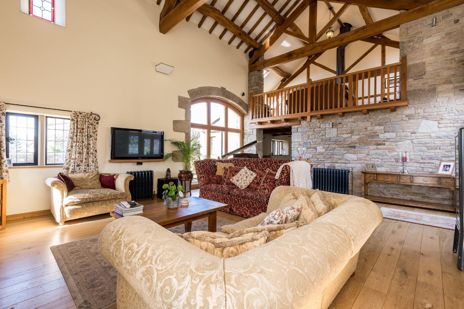 The formal lounge beckons you in from the entrance hall, but what feature to take in first?! Two adjacent huge arched windows mirror each other dressing both edges of the room, flooding in light and framing the outdoors like a picture. Double doors open up onto the courtyard allowing a gentle breeze to lift the home on a summers day. and for those cosy winter nights the log burner flickers away taking centre stage, set within a huge stone fireplace which reaches right up to the tip of the vaulted ceiling. This is a room made for entertaining, in fact, the whole house is. you can guarantee it will be hard to get rid of your guests at the end of the day!
