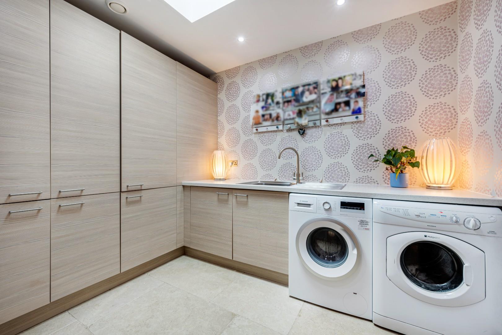 The high-quality designer kitchen is configured with two islands joined by a solid oak breakfast bar, and a fitted dining table matching the islands. The surface of the islands and dining table is a beautiful double depth Corian worktop, complementing the modern gloss wall units while adding stylish contrast to the modern wood cabinetry. The units are fitted with Neff cooking appliances, including two double ovens, a steam oven, combination microwave oven, and induction hob with minimalist inset ceiling extractor. A Quooker tap with instant boiling and sparkling water capability is fitted to the Corian sink seamlessly molded within the worktop. Other integrated appliances include a top of the range Fisher & Paykel double fridge and double freezer, a dishwasher, and wine fridge. This house has everything you need and more!