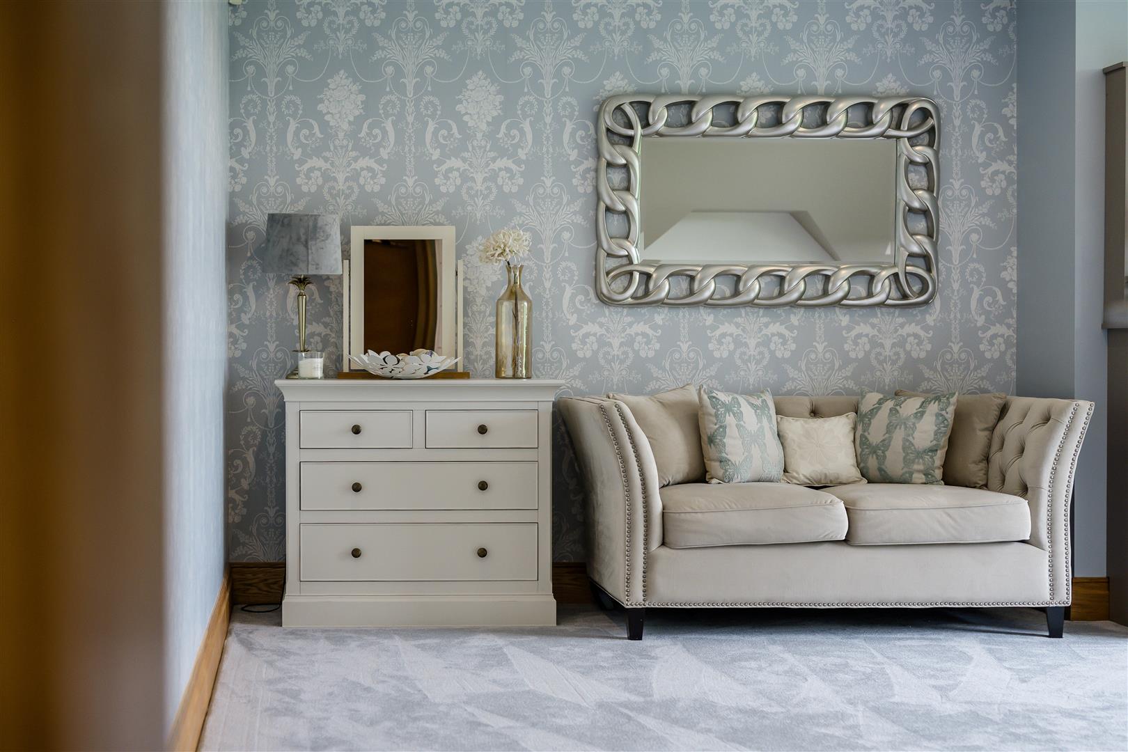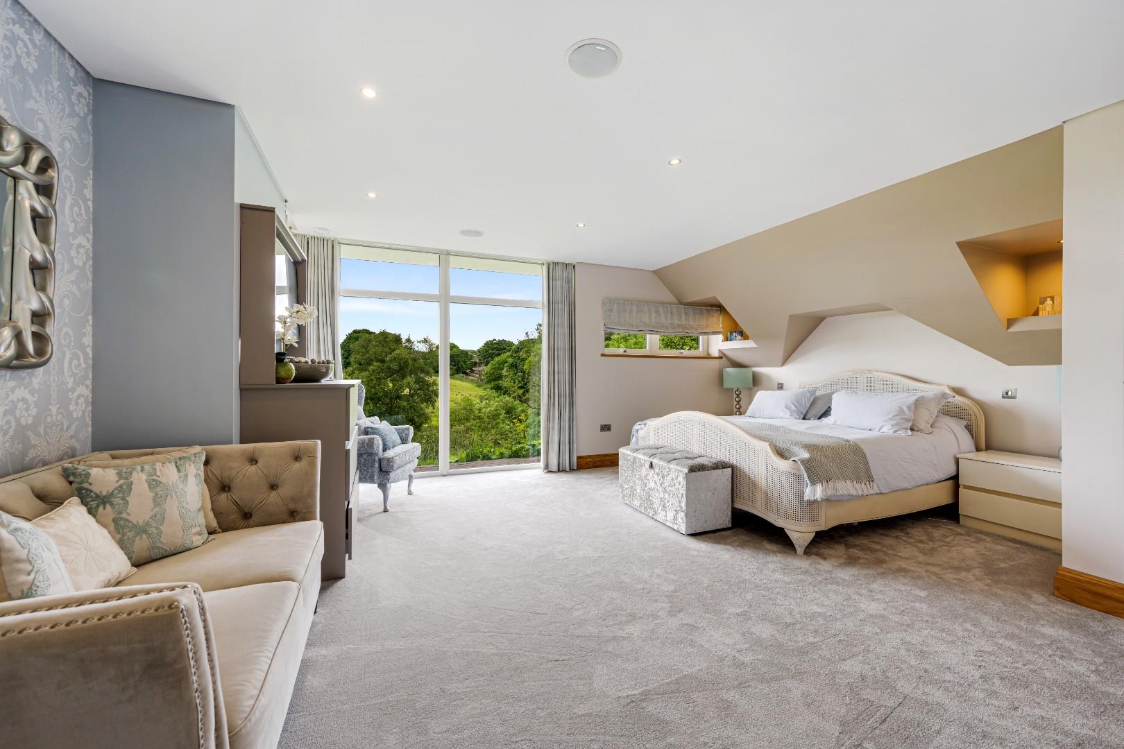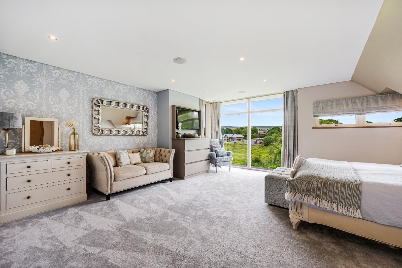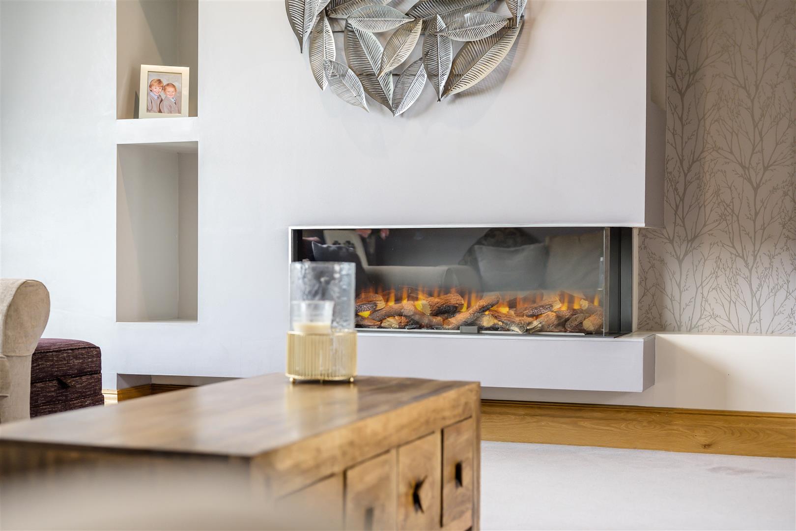On the opposite side of the kitchen is the hallway which connects to two larger reception rooms, meaning there is more than enough space for all the family. Like other rooms in this house, both these rooms are very generous in size, boast more beautiful views through floor to ceiling windows, and are finished to neutral, contemporary standards. The main lounge features a modern feature wall with gas fire and glass surrounds, and a unique touch with a glass floor panel looking down into the corridor on the lower floor. The second of these lounge style rooms is on the corner of the house and benefits from a range of fitted cabinetry.