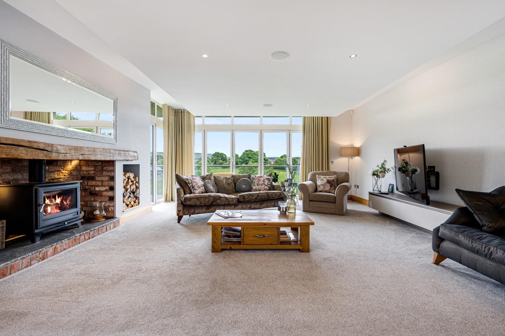 Open Plan Living - The heart of Ivory House is the incredible open plan living space which is as practical as it is beautiful, with an exceptional amount of natural light pouring in from all angles. The lounge here is slightly elevated which gives it a clever and subtle separation from the kitchen and dining areas, while still allowing the attractive flow of open plan. Within the lounge aspect, an extensive range of floor to ceiling bifold doors and windows frame views of lush green surrounds, and open onto a wraparound balcony which is sure to be delightful on warm summer days. A grand fireplace with exposed brick surrounds, oak mantel and slate hearth adds a rustic touch, housing a top-quality Chesney's log burner - a cosy touch to enjoy on cold wintery days.