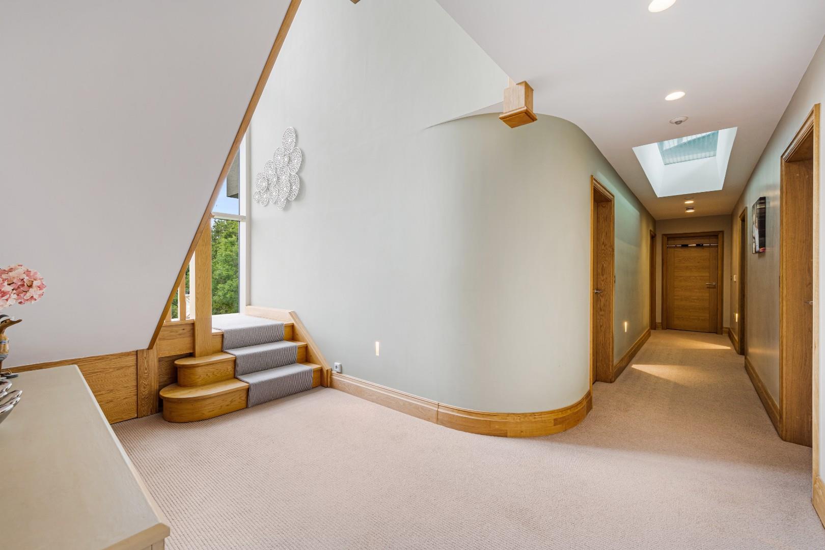 Bedrooms & Bathrooms - From the bright and airy hallway and landing, a bespoke solid oak staircase matches the solid oak internal doors and leads down past the huge feature wall of glass to the lower floor. The generous proportions, stylish neutral interiors and high-quality fixtures continue.