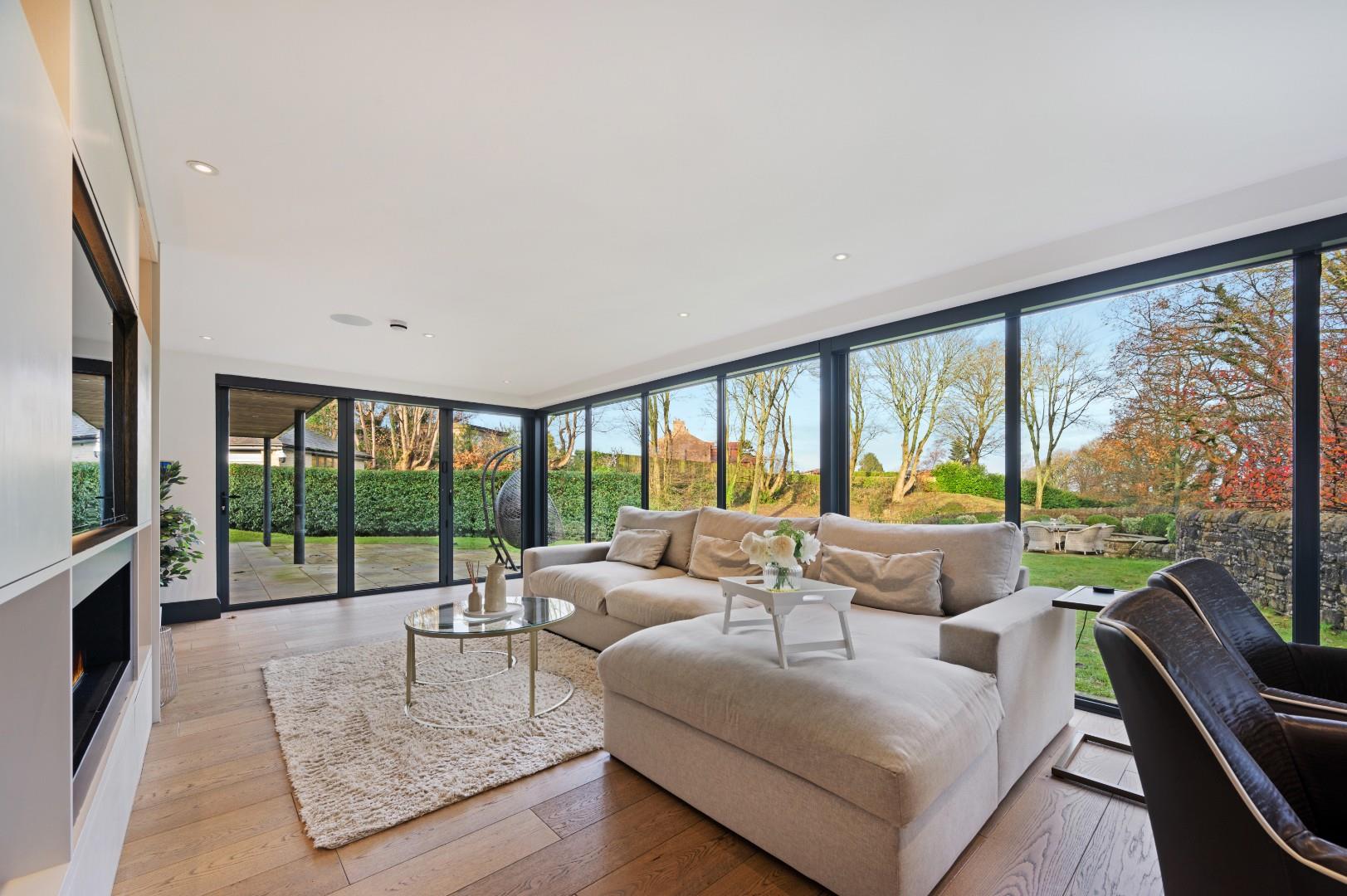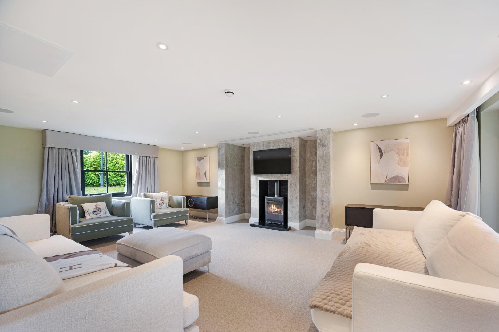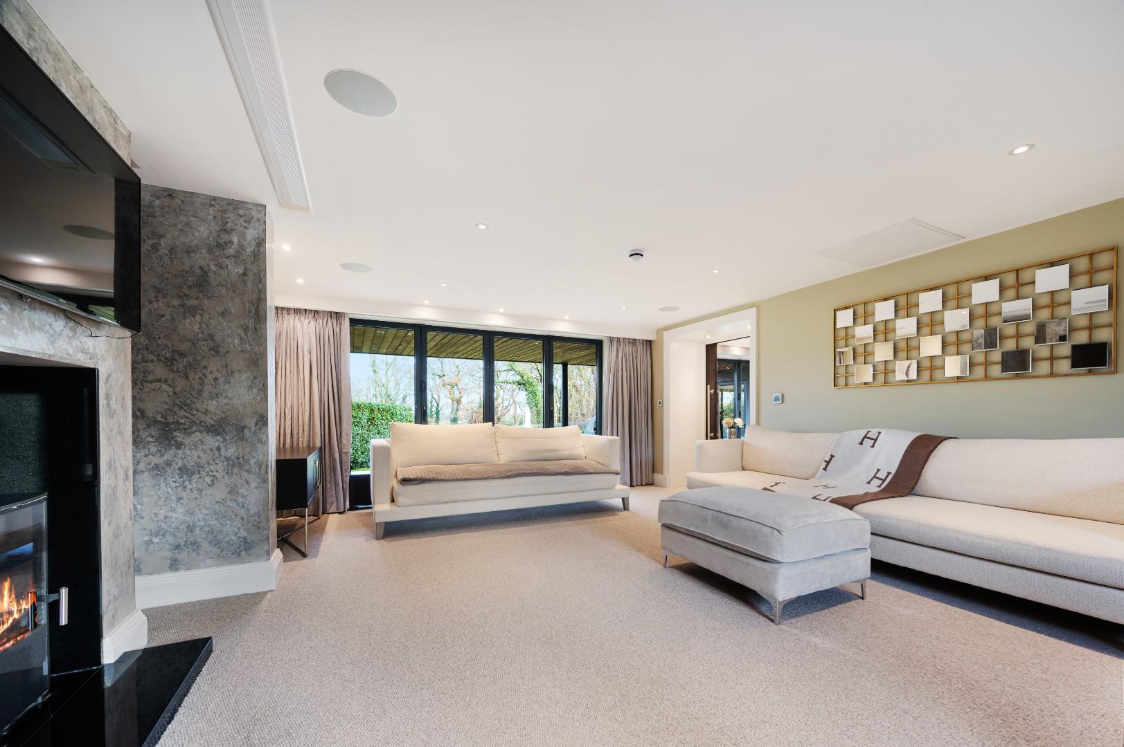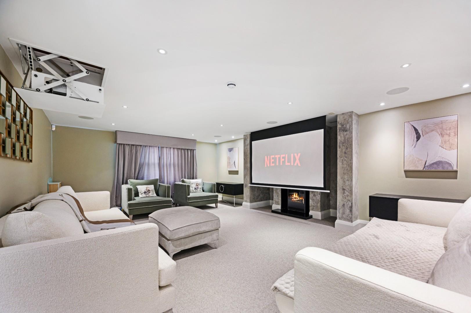 The principal lounge is super generous in size, spanning the full depth of the property. It's no surprise it is presented to impeccable standards, with a hidden home cinema system including integrated ceiling speakers, and an Epson projector and Sapphire screen that descend from the ceiling. Draw the black-out curtains with a touch of a button on the remote, and you have the complete big screen experience from the comfort of your own home. As well as the home cinema, a set of bifold doors makes the most of the views to the garden, and the chimney breast is home to a log burner and wall-mounted TV point.