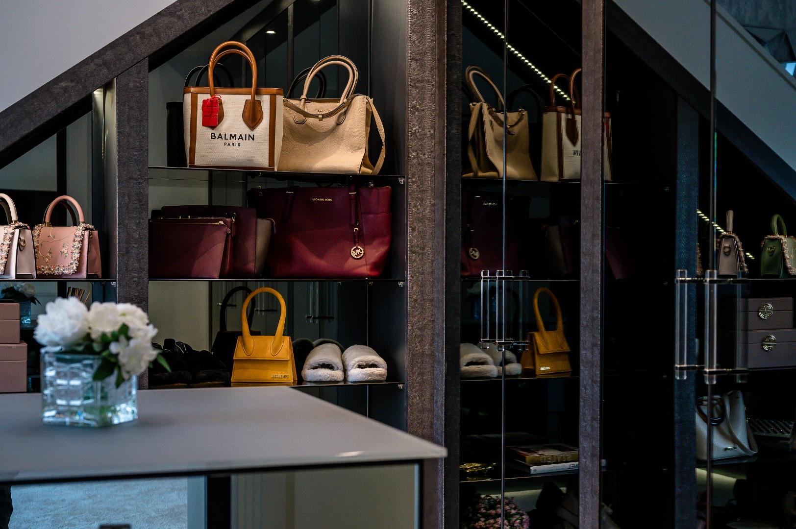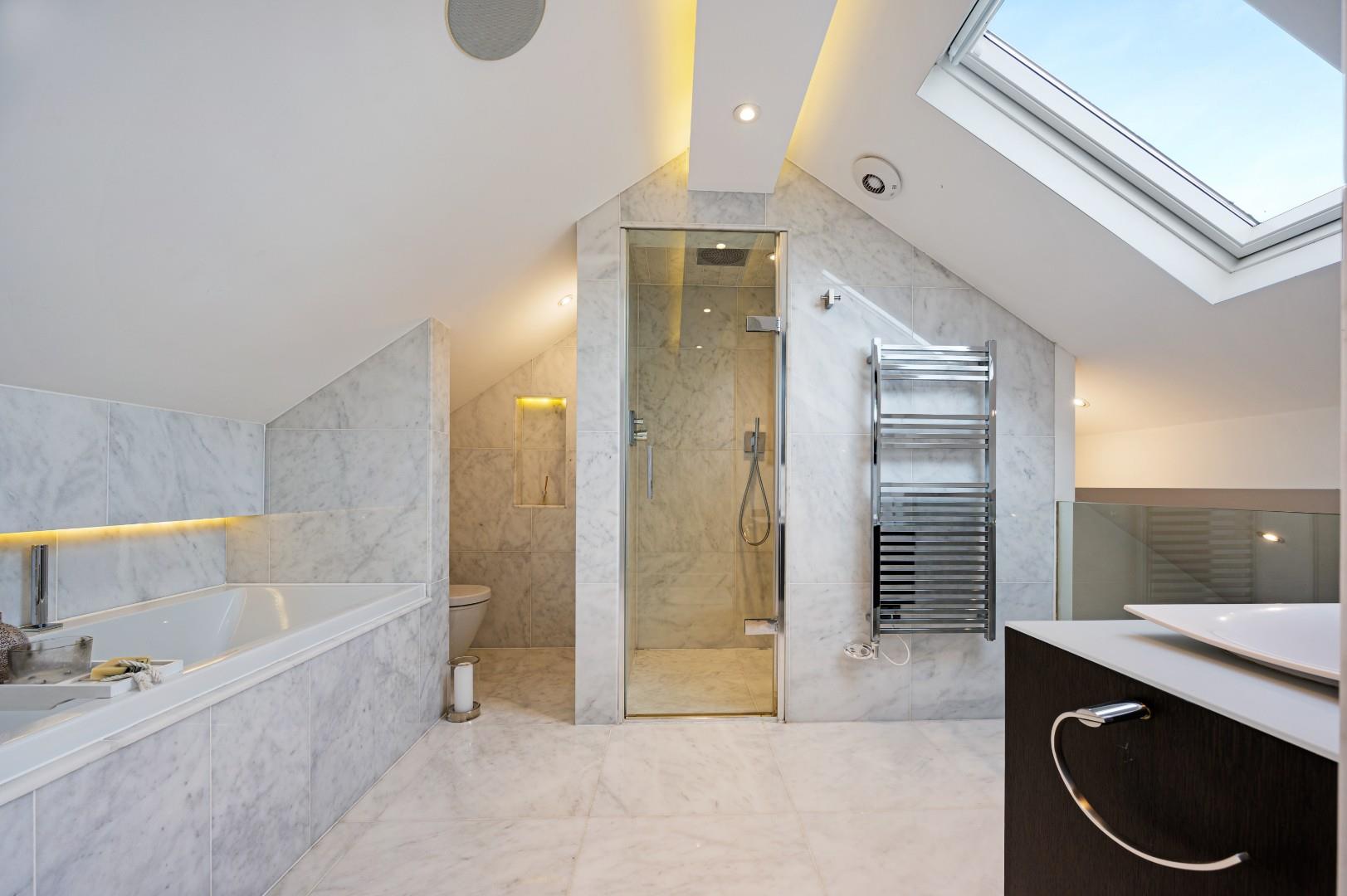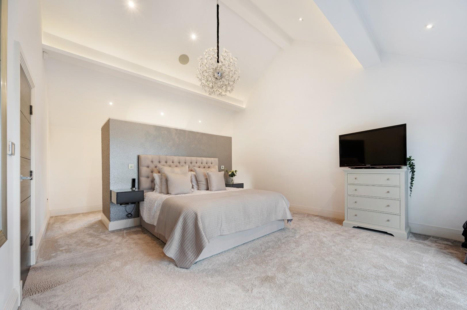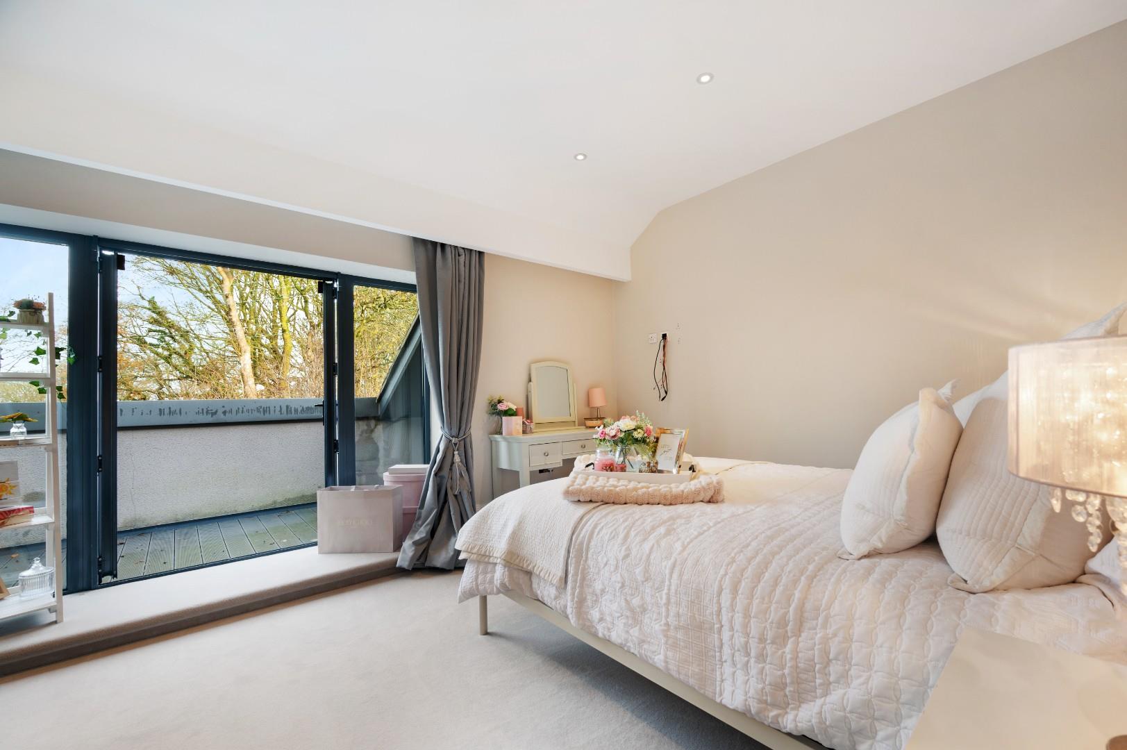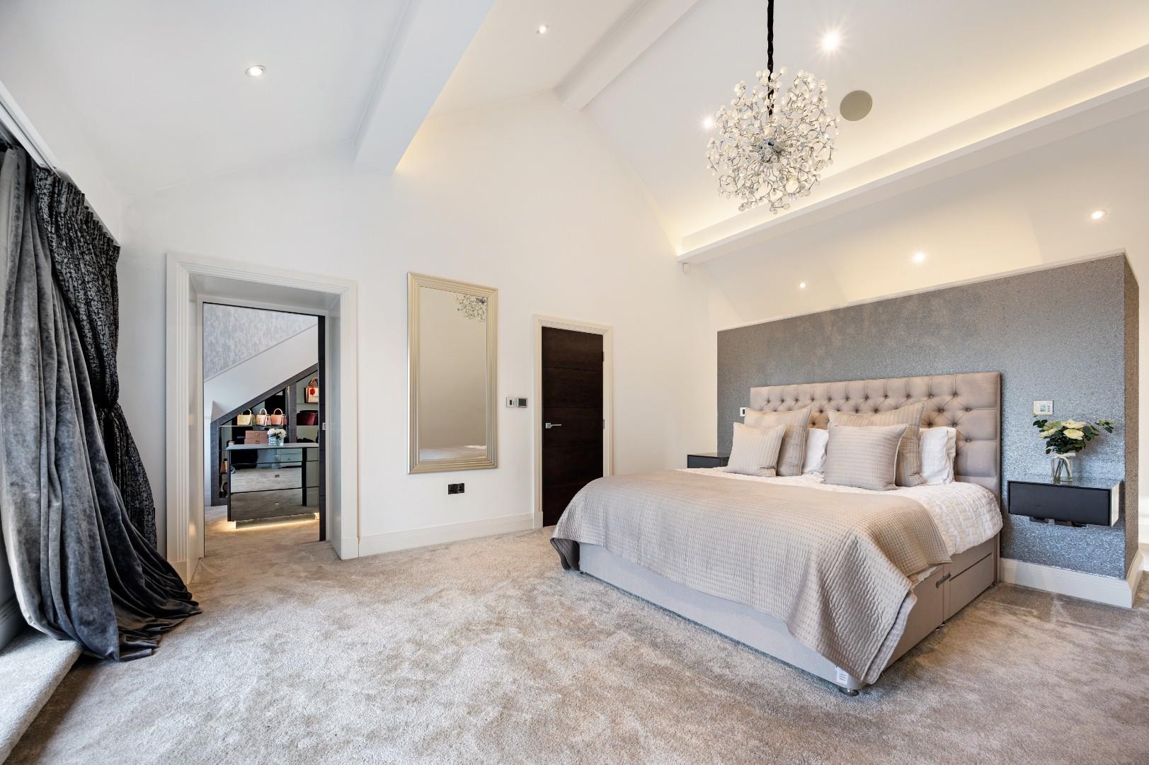 From the gallery landing, the end of the corridor opens into the imposing master suite with another vaulted ceiling and designer chandelier that add to the grandeur. Within the bedroom, a set of bifold doors pour natural light into the room and lead to the balcony spanning the width of the property at the rear. A partition wall with designer wallpaper separates the super-king bed from a private dressing area, similar to that of boudoirs found in premium suites of the best hotels, fitted with high quality cabinetry, a dressing table and mirror with inset lighting. The opulence continues in the large walk-in wardrobe featuring elegant, mirrored wardrobes, drawers, an island and shelving. Above here is a fabulous mezzanine master bathroom which is fully tiled with white marble and comprises a four-piece suite, including a tiled-in steam shower with marble seating, bath with marble surrounds, WC, and vanity basin with storage.