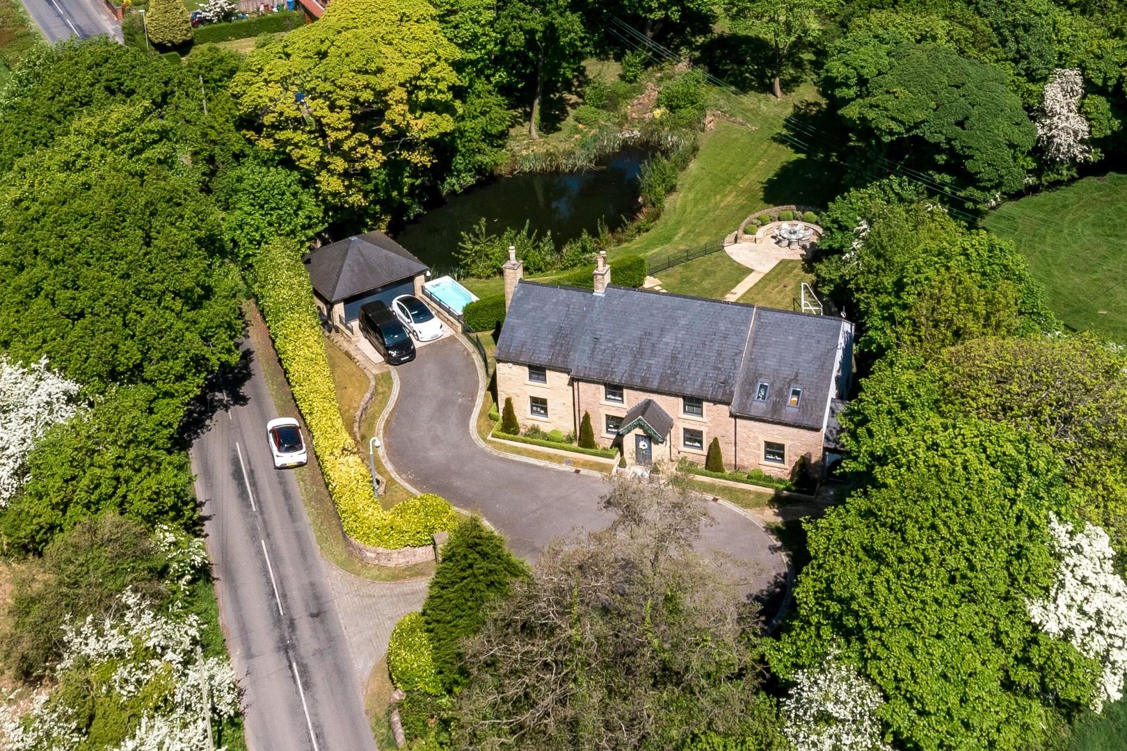 The Approach - On the country lane, a tall hedgerow adjoins a stone wall and two stone pillars set beside the electric gates, creating a beautiful entrance and a great sense of privacy. Beyond the gates a large drive bordered by manicured lawns sits in front of the house, providing lots of space for parking, and continues further to the detached double garage on the left.