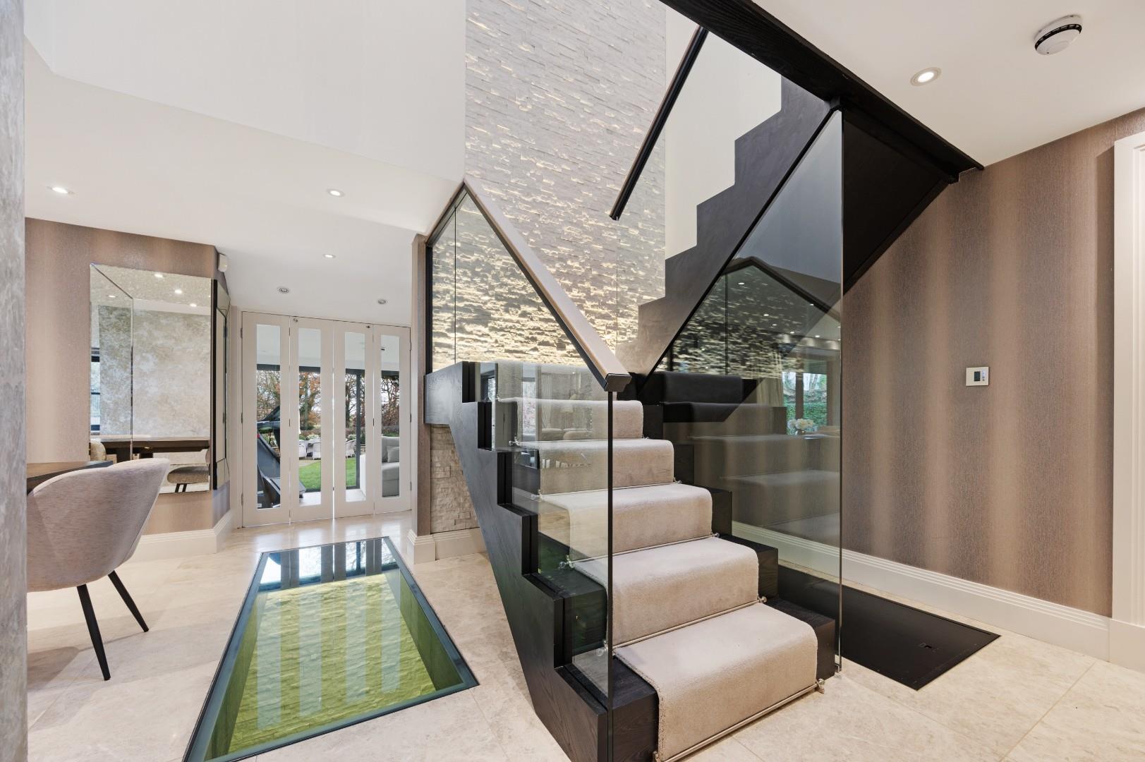 In addition to the principal lounge and family room, there are two further reception rooms... The grand entrance hall is large enough to be another sitting area, with a log burner that's sure to give a warming glow on cold, wintery days. With an open aspect to the entrance hall, the dining room is another delightful space for dinner parties and entertaining, with more bifold doors that 'bring the outside in' and allow you to appreciate the landscaped grounds year-round. A notable aspect of the interior design in this part of the property is the glass floor that displays the wine cellar below.