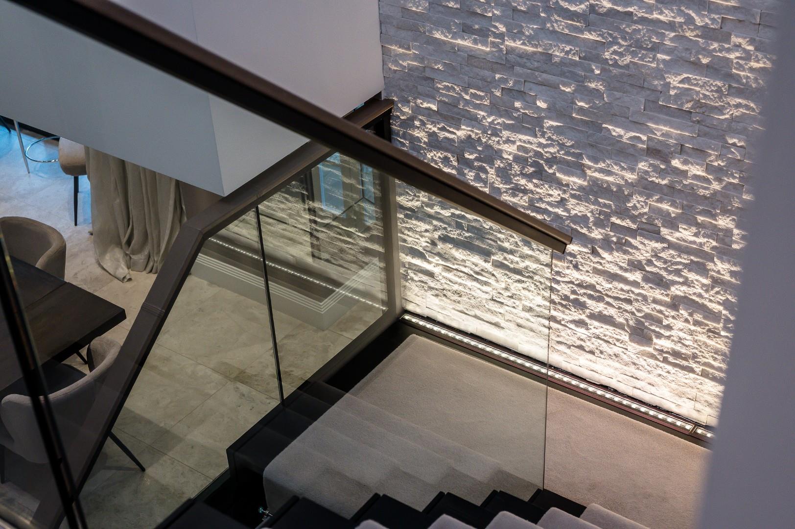 Bedrooms & Bathrooms - Ascending from the centre of the home between the kitchen and dining room is a bespoke walnut staircase with glass balustrades, handcrafted leather handrail, and a stunning crystal-effect tiled stone feature wall that rises high into the vaulted ceiling. The feature wall is illuminated by subtle uplights set within the floor that complement the 2.3m Italian-crystal chandelier hanging beautifully within the stairwell.