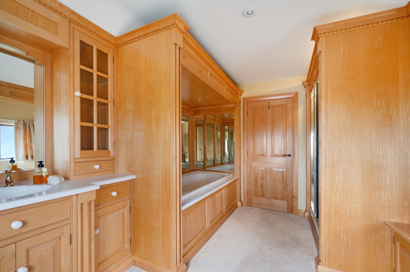 The sense of grandeur continues in the master suite which again is generous in size, spanning 23 ft in length! The bedroom is complete with a comprehensive range of fitted furniture, found in excellent condition, including wardrobes, drawers, dressing tables and glass fronted cabinets. The master en-suite has complementary fittings with a four-piece suite including bath, walk-in shower, inset stone wash basin with storage surrounds, and WC. Each of the three other bedrooms are well proportioned for family life, with the largest being on the opposite side of the landing and boasting a similar size to the master.