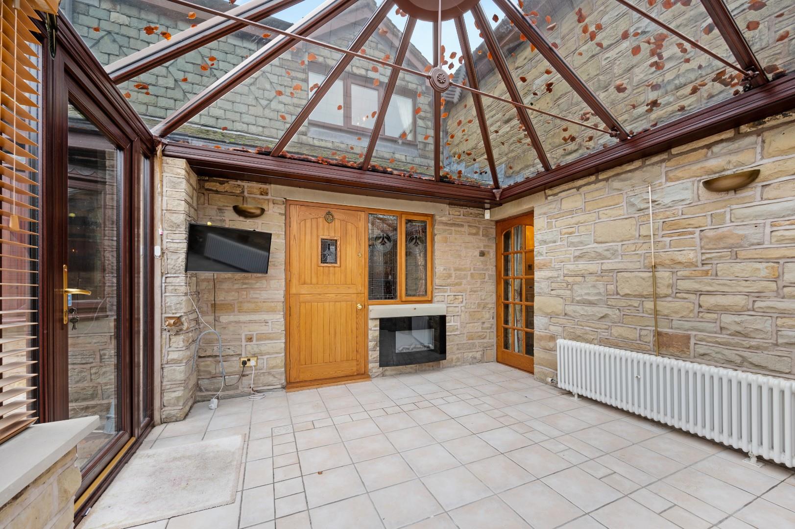 The two large reception rooms are great sizes and again offer flexibility in use, as either two lounge style rooms or a formal dining room and a sitting room. Both feature imposing chimney breasts that add to the character, one with exposed brick surrounds and a log burner, and the other with an ornate stone fireplace surround with gas fire. To the rear of the property is also a large conservatory with glass roof which opens onto the terraces and patios at the back.