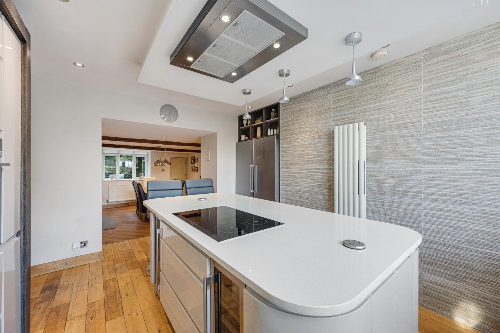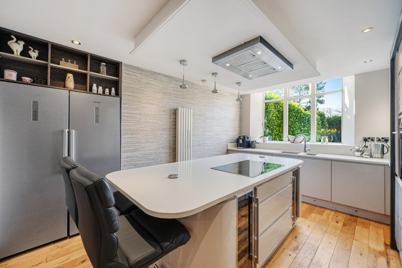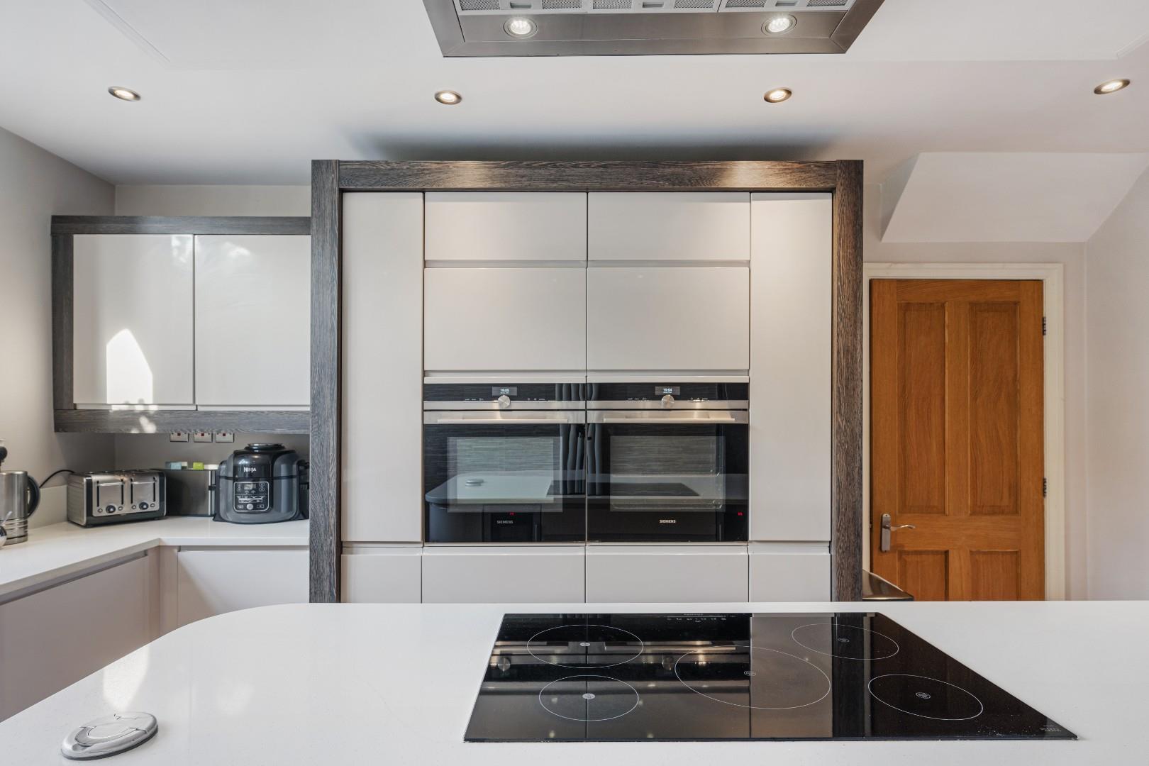 To the right of the entrance hall is a high-quality contemporary kitchen, featuring an oak floor that adds a stylish contrast to the quartz worktop and gloss cabinetry with wood veneer framing. It's a fantastic social space that's perfect for both everyday life and when hosting family and friends. The island gives a huge amount of worktop space and bar seating, and the top-quality integrated appliances include a Siemens oven and a combination oven/microwave, five-plate induction hob with matching ceiling extractor, dishwasher, an inset Smeg sink with Hans Grohe tap, oodles of storage, and an allocated spot for a large freestanding fridge-freezer.